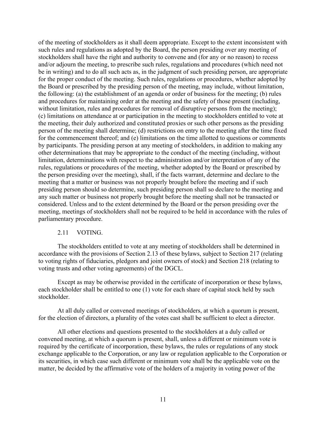 11 of the meeting of stockholders as it shall deem appropriate. Except to the extent inconsistent with such rules and regulations as adopted by the Board, the person presiding over any meeting of stockholders shall have the right and authority to convene and (for any or no reason) to recess and/or adjourn the meeting, to prescribe such rules, regulations and procedures (which need not be in writing) and to do all such acts as, in the judgment of such presiding person, are appropriate for the proper conduct of the meeting. Such rules, regulations or procedures, whether adopted by the Board or prescribed by the presiding person of the meeting, may include, without limitation, the following: (a) the establishment of an agenda or order of business for the meeting; (b) rules and procedures for maintaining order at the meeting and the safety of those present (including, without limitation, rules and procedures for removal of disruptive persons from the meeting); (c) limitations on attendance at or participation in the meeting to stockholders entitled to vote at the meeting, their duly authorized and constituted proxies or such other persons as the presiding person of the meeting shall determine; (d) restrictions on entry to the meeting after the time fixed for the commencement thereof; and (e) limitations on the time allotted to questions or comments by participants. The presiding person at any meeting of stockholders, in addition to making any other determinations that may be appropriate to the conduct of the meeting (including, without limitation, determinations with respect to the administration and/or interpretation of any of the rules, regulations or procedures of the meeting, whether adopted by the Board or prescribed by the person presiding over the meeting), shall, if the facts warrant, determine and declare to the meeting that a matter or business was not properly brought before the meeting and if such presiding person should so determine, such presiding person shall so declare to the meeting and any such matter or business not properly brought before the meeting shall not be transacted or considered. Unless and to the extent determined by the Board or the person presiding over the meeting, meetings of stockholders shall not be required to be held in accordance with the rules of parliamentary procedure. 2.11 VOTING. The stockholders entitled to vote at any meeting of stockholders shall be determined in accordance with the provisions of Section 2.13 of these bylaws, subject to Section 217 (relating to voting rights of fiduciaries, pledgors and joint owners of stock) and Section 218 (relating to voting trusts and other voting agreements) of the DGCL. Except as may be otherwise provided in the certificate of incorporation or these bylaws, each stockholder shall be entitled to one (1) vote for each share of capital stock held by such stockholder. At all duly called or convened meetings of stockholders, at which a quorum is present, for the election of directors, a plurality of the votes cast shall be sufficient to elect a director. All other elections and questions presented to the stockholders at a duly called or convened meeting, at which a quorum is present, shall, unless a different or minimum vote is required by the certificate of incorporation, these bylaws, the rules or regulations of any stock exchange applicable to the Corporation, or any law or regulation applicable to the Corporation or its securities, in which case such different or minimum vote shall be the applicable vote on the matter, be decided by the affirmative vote of the holders of a majority in voting power of the