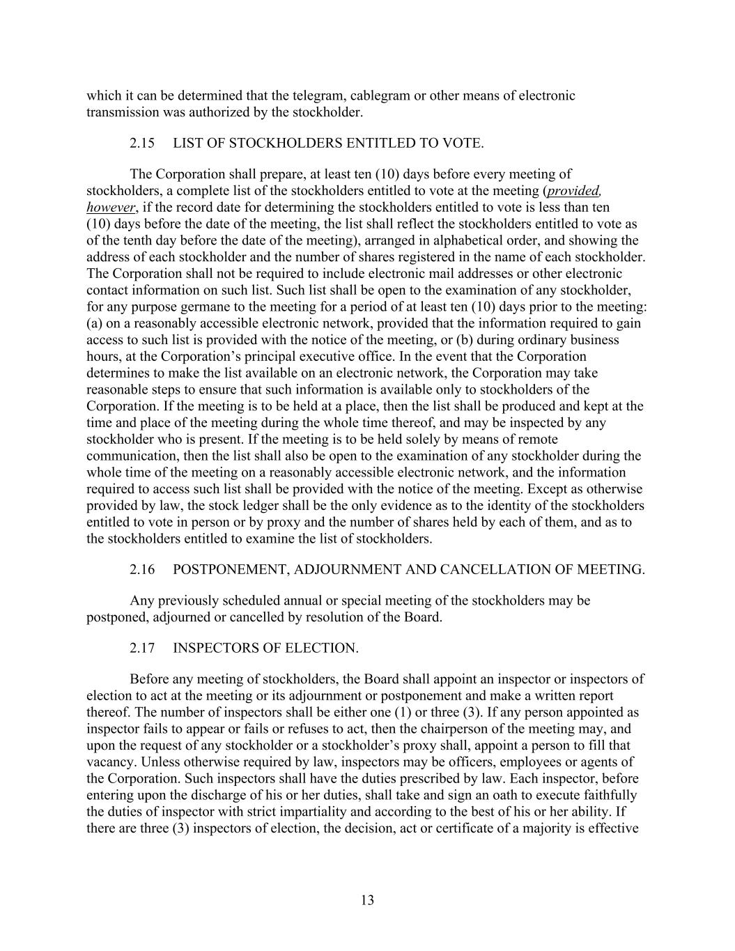 13 which it can be determined that the telegram, cablegram or other means of electronic transmission was authorized by the stockholder. 2.15 LIST OF STOCKHOLDERS ENTITLED TO VOTE. The Corporation shall prepare, at least ten (10) days before every meeting of stockholders, a complete list of the stockholders entitled to vote at the meeting (provided, however, if the record date for determining the stockholders entitled to vote is less than ten (10) days before the date of the meeting, the list shall reflect the stockholders entitled to vote as of the tenth day before the date of the meeting), arranged in alphabetical order, and showing the address of each stockholder and the number of shares registered in the name of each stockholder. The Corporation shall not be required to include electronic mail addresses or other electronic contact information on such list. Such list shall be open to the examination of any stockholder, for any purpose germane to the meeting for a period of at least ten (10) days prior to the meeting: (a) on a reasonably accessible electronic network, provided that the information required to gain access to such list is provided with the notice of the meeting, or (b) during ordinary business hours, at the Corporation’s principal executive office. In the event that the Corporation determines to make the list available on an electronic network, the Corporation may take reasonable steps to ensure that such information is available only to stockholders of the Corporation. If the meeting is to be held at a place, then the list shall be produced and kept at the time and place of the meeting during the whole time thereof, and may be inspected by any stockholder who is present. If the meeting is to be held solely by means of remote communication, then the list shall also be open to the examination of any stockholder during the whole time of the meeting on a reasonably accessible electronic network, and the information required to access such list shall be provided with the notice of the meeting. Except as otherwise provided by law, the stock ledger shall be the only evidence as to the identity of the stockholders entitled to vote in person or by proxy and the number of shares held by each of them, and as to the stockholders entitled to examine the list of stockholders. 2.16 POSTPONEMENT, ADJOURNMENT AND CANCELLATION OF MEETING. Any previously scheduled annual or special meeting of the stockholders may be postponed, adjourned or cancelled by resolution of the Board. 2.17 INSPECTORS OF ELECTION. Before any meeting of stockholders, the Board shall appoint an inspector or inspectors of election to act at the meeting or its adjournment or postponement and make a written report thereof. The number of inspectors shall be either one (1) or three (3). If any person appointed as inspector fails to appear or fails or refuses to act, then the chairperson of the meeting may, and upon the request of any stockholder or a stockholder’s proxy shall, appoint a person to fill that vacancy. Unless otherwise required by law, inspectors may be officers, employees or agents of the Corporation. Such inspectors shall have the duties prescribed by law. Each inspector, before entering upon the discharge of his or her duties, shall take and sign an oath to execute faithfully the duties of inspector with strict impartiality and according to the best of his or her ability. If there are three (3) inspectors of election, the decision, act or certificate of a majority is effective