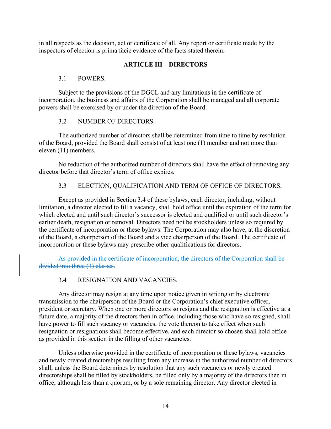 14 in all respects as the decision, act or certificate of all. Any report or certificate made by the inspectors of election is prima facie evidence of the facts stated therein. ARTICLE III – DIRECTORS 3.1 POWERS. Subject to the provisions of the DGCL and any limitations in the certificate of incorporation, the business and affairs of the Corporation shall be managed and all corporate powers shall be exercised by or under the direction of the Board. 3.2 NUMBER OF DIRECTORS. The authorized number of directors shall be determined from time to time by resolution of the Board, provided the Board shall consist of at least one (1) member and not more than eleven (11) members. No reduction of the authorized number of directors shall have the effect of removing any director before that director’s term of office expires. 3.3 ELECTION, QUALIFICATION AND TERM OF OFFICE OF DIRECTORS. Except as provided in Section 3.4 of these bylaws, each director, including, without limitation, a director elected to fill a vacancy, shall hold office until the expiration of the term for which elected and until such director’s successor is elected and qualified or until such director’s earlier death, resignation or removal. Directors need not be stockholders unless so required by the certificate of incorporation or these bylaws. The Corporation may also have, at the discretion of the Board, a chairperson of the Board and a vice chairperson of the Board. The certificate of incorporation or these bylaws may prescribe other qualifications for directors. As provided in the certificate of incorporation, the directors of the Corporation shall be divided into three (3) classes. 3.4 RESIGNATION AND VACANCIES. Any director may resign at any time upon notice given in writing or by electronic transmission to the chairperson of the Board or the Corporation’s chief executive officer, president or secretary. When one or more directors so resigns and the resignation is effective at a future date, a majority of the directors then in office, including those who have so resigned, shall have power to fill such vacancy or vacancies, the vote thereon to take effect when such resignation or resignations shall become effective, and each director so chosen shall hold office as provided in this section in the filling of other vacancies. Unless otherwise provided in the certificate of incorporation or these bylaws, vacancies and newly created directorships resulting from any increase in the authorized number of directors shall, unless the Board determines by resolution that any such vacancies or newly created directorships shall be filled by stockholders, be filled only by a majority of the directors then in office, although less than a quorum, or by a sole remaining director. Any director elected in
