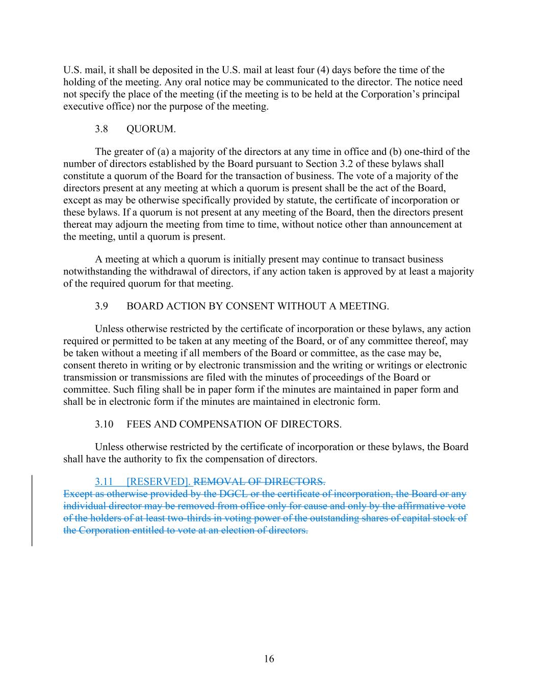 16 U.S. mail, it shall be deposited in the U.S. mail at least four (4) days before the time of the holding of the meeting. Any oral notice may be communicated to the director. The notice need not specify the place of the meeting (if the meeting is to be held at the Corporation’s principal executive office) nor the purpose of the meeting. 3.8 QUORUM. The greater of (a) a majority of the directors at any time in office and (b) one-third of the number of directors established by the Board pursuant to Section 3.2 of these bylaws shall constitute a quorum of the Board for the transaction of business. The vote of a majority of the directors present at any meeting at which a quorum is present shall be the act of the Board, except as may be otherwise specifically provided by statute, the certificate of incorporation or these bylaws. If a quorum is not present at any meeting of the Board, then the directors present thereat may adjourn the meeting from time to time, without notice other than announcement at the meeting, until a quorum is present. A meeting at which a quorum is initially present may continue to transact business notwithstanding the withdrawal of directors, if any action taken is approved by at least a majority of the required quorum for that meeting. 3.9 BOARD ACTION BY CONSENT WITHOUT A MEETING. Unless otherwise restricted by the certificate of incorporation or these bylaws, any action required or permitted to be taken at any meeting of the Board, or of any committee thereof, may be taken without a meeting if all members of the Board or committee, as the case may be, consent thereto in writing or by electronic transmission and the writing or writings or electronic transmission or transmissions are filed with the minutes of proceedings of the Board or committee. Such filing shall be in paper form if the minutes are maintained in paper form and shall be in electronic form if the minutes are maintained in electronic form. 3.10 FEES AND COMPENSATION OF DIRECTORS. Unless otherwise restricted by the certificate of incorporation or these bylaws, the Board shall have the authority to fix the compensation of directors. 3.11 [RESERVED]. REMOVAL OF DIRECTORS. Except as otherwise provided by the DGCL or the certificate of incorporation, the Board or any individual director may be removed from office only for cause and only by the affirmative vote of the holders of at least two-thirds in voting power of the outstanding shares of capital stock of the Corporation entitled to vote at an election of directors.