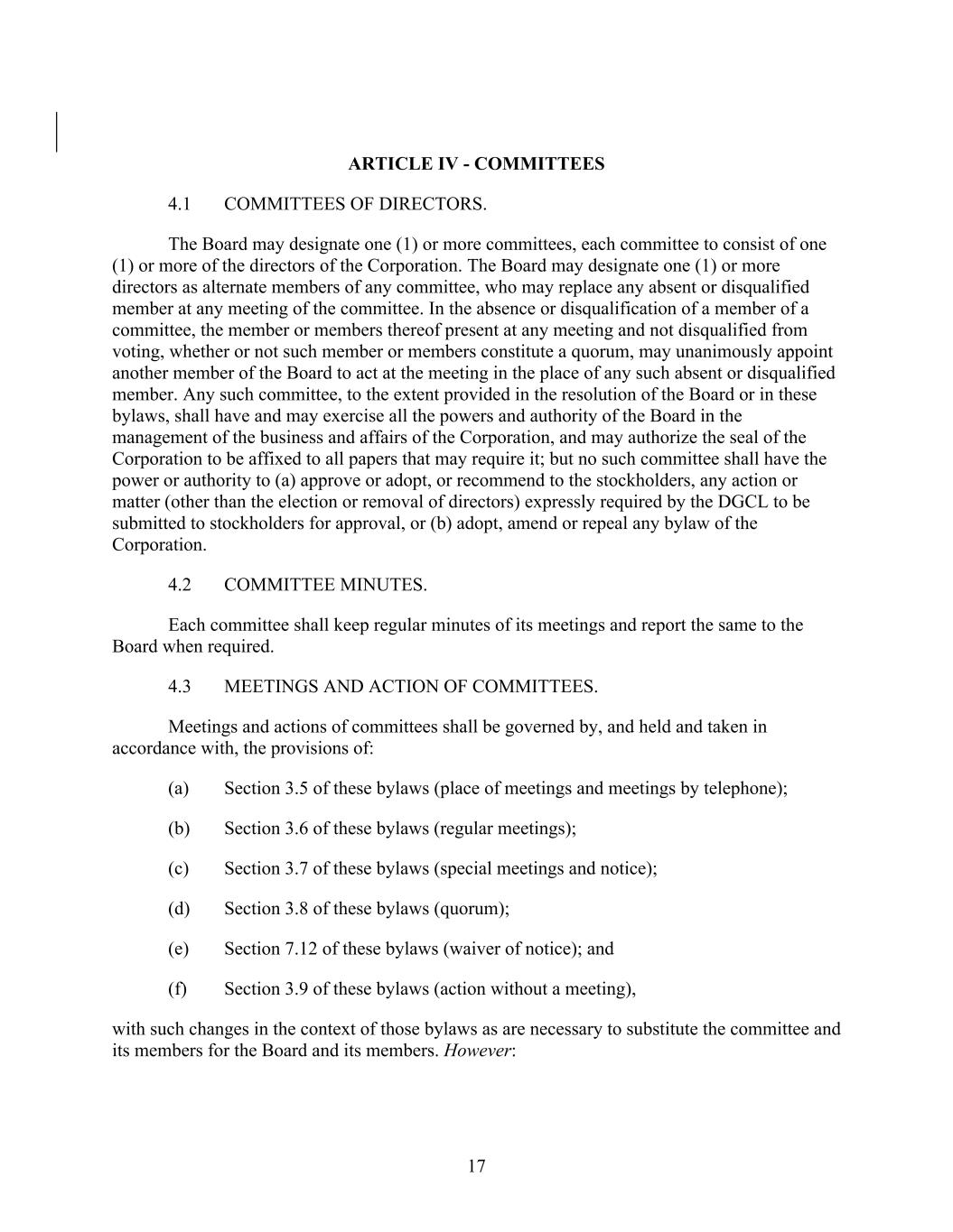 17 ARTICLE IV - COMMITTEES 4.1 COMMITTEES OF DIRECTORS. The Board may designate one (1) or more committees, each committee to consist of one (1) or more of the directors of the Corporation. The Board may designate one (1) or more directors as alternate members of any committee, who may replace any absent or disqualified member at any meeting of the committee. In the absence or disqualification of a member of a committee, the member or members thereof present at any meeting and not disqualified from voting, whether or not such member or members constitute a quorum, may unanimously appoint another member of the Board to act at the meeting in the place of any such absent or disqualified member. Any such committee, to the extent provided in the resolution of the Board or in these bylaws, shall have and may exercise all the powers and authority of the Board in the management of the business and affairs of the Corporation, and may authorize the seal of the Corporation to be affixed to all papers that may require it; but no such committee shall have the power or authority to (a) approve or adopt, or recommend to the stockholders, any action or matter (other than the election or removal of directors) expressly required by the DGCL to be submitted to stockholders for approval, or (b) adopt, amend or repeal any bylaw of the Corporation. 4.2 COMMITTEE MINUTES. Each committee shall keep regular minutes of its meetings and report the same to the Board when required. 4.3 MEETINGS AND ACTION OF COMMITTEES. Meetings and actions of committees shall be governed by, and held and taken in accordance with, the provisions of: (a) Section 3.5 of these bylaws (place of meetings and meetings by telephone); (b) Section 3.6 of these bylaws (regular meetings); (c) Section 3.7 of these bylaws (special meetings and notice); (d) Section 3.8 of these bylaws (quorum); (e) Section 7.12 of these bylaws (waiver of notice); and (f) Section 3.9 of these bylaws (action without a meeting), with such changes in the context of those bylaws as are necessary to substitute the committee and its members for the Board and its members. However: