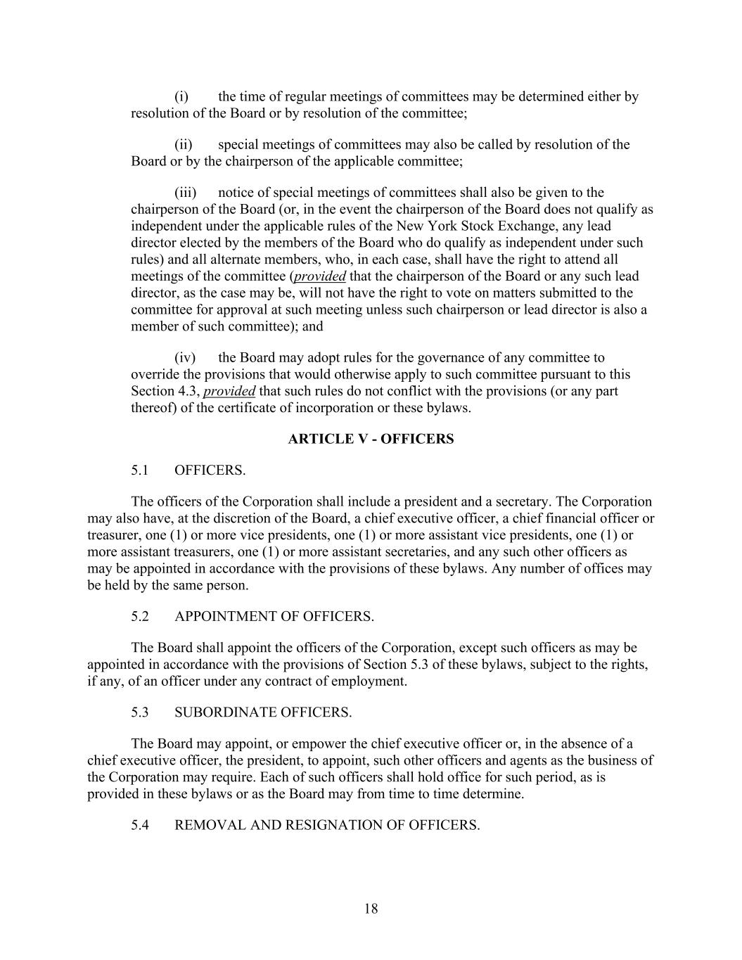 18 (i) the time of regular meetings of committees may be determined either by resolution of the Board or by resolution of the committee; (ii) special meetings of committees may also be called by resolution of the Board or by the chairperson of the applicable committee; (iii) notice of special meetings of committees shall also be given to the chairperson of the Board (or, in the event the chairperson of the Board does not qualify as independent under the applicable rules of the New York Stock Exchange, any lead director elected by the members of the Board who do qualify as independent under such rules) and all alternate members, who, in each case, shall have the right to attend all meetings of the committee (provided that the chairperson of the Board or any such lead director, as the case may be, will not have the right to vote on matters submitted to the committee for approval at such meeting unless such chairperson or lead director is also a member of such committee); and (iv) the Board may adopt rules for the governance of any committee to override the provisions that would otherwise apply to such committee pursuant to this Section 4.3, provided that such rules do not conflict with the provisions (or any part thereof) of the certificate of incorporation or these bylaws. ARTICLE V - OFFICERS 5.1 OFFICERS. The officers of the Corporation shall include a president and a secretary. The Corporation may also have, at the discretion of the Board, a chief executive officer, a chief financial officer or treasurer, one (1) or more vice presidents, one (1) or more assistant vice presidents, one (1) or more assistant treasurers, one (1) or more assistant secretaries, and any such other officers as may be appointed in accordance with the provisions of these bylaws. Any number of offices may be held by the same person. 5.2 APPOINTMENT OF OFFICERS. The Board shall appoint the officers of the Corporation, except such officers as may be appointed in accordance with the provisions of Section 5.3 of these bylaws, subject to the rights, if any, of an officer under any contract of employment. 5.3 SUBORDINATE OFFICERS. The Board may appoint, or empower the chief executive officer or, in the absence of a chief executive officer, the president, to appoint, such other officers and agents as the business of the Corporation may require. Each of such officers shall hold office for such period, as is provided in these bylaws or as the Board may from time to time determine. 5.4 REMOVAL AND RESIGNATION OF OFFICERS.