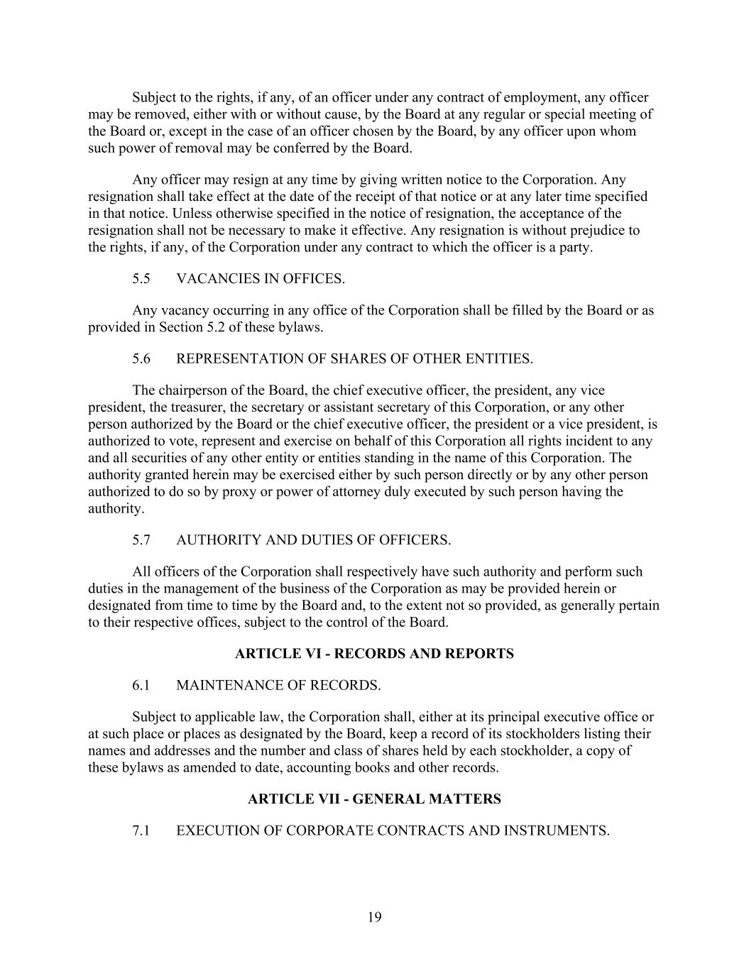 19 Subject to the rights, if any, of an officer under any contract of employment, any officer may be removed, either with or without cause, by the Board at any regular or special meeting of the Board or, except in the case of an officer chosen by the Board, by any officer upon whom such power of removal may be conferred by the Board. Any officer may resign at any time by giving written notice to the Corporation. Any resignation shall take effect at the date of the receipt of that notice or at any later time specified in that notice. Unless otherwise specified in the notice of resignation, the acceptance of the resignation shall not be necessary to make it effective. Any resignation is without prejudice to the rights, if any, of the Corporation under any contract to which the officer is a party. 5.5 VACANCIES IN OFFICES. Any vacancy occurring in any office of the Corporation shall be filled by the Board or as provided in Section 5.2 of these bylaws. 5.6 REPRESENTATION OF SHARES OF OTHER ENTITIES. The chairperson of the Board, the chief executive officer, the president, any vice president, the treasurer, the secretary or assistant secretary of this Corporation, or any other person authorized by the Board or the chief executive officer, the president or a vice president, is authorized to vote, represent and exercise on behalf of this Corporation all rights incident to any and all securities of any other entity or entities standing in the name of this Corporation. The authority granted herein may be exercised either by such person directly or by any other person authorized to do so by proxy or power of attorney duly executed by such person having the authority. 5.7 AUTHORITY AND DUTIES OF OFFICERS. All officers of the Corporation shall respectively have such authority and perform such duties in the management of the business of the Corporation as may be provided herein or designated from time to time by the Board and, to the extent not so provided, as generally pertain to their respective offices, subject to the control of the Board. ARTICLE VI - RECORDS AND REPORTS 6.1 MAINTENANCE OF RECORDS. Subject to applicable law, the Corporation shall, either at its principal executive office or at such place or places as designated by the Board, keep a record of its stockholders listing their names and addresses and the number and class of shares held by each stockholder, a copy of these bylaws as amended to date, accounting books and other records. ARTICLE VII - GENERAL MATTERS 7.1 EXECUTION OF CORPORATE CONTRACTS AND INSTRUMENTS.