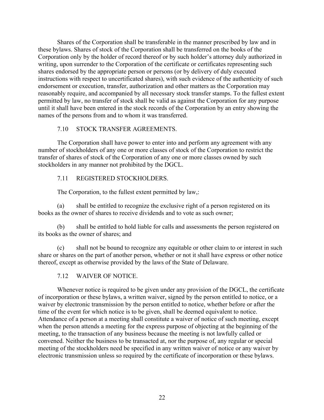 22 Shares of the Corporation shall be transferable in the manner prescribed by law and in these bylaws. Shares of stock of the Corporation shall be transferred on the books of the Corporation only by the holder of record thereof or by such holder’s attorney duly authorized in writing, upon surrender to the Corporation of the certificate or certificates representing such shares endorsed by the appropriate person or persons (or by delivery of duly executed instructions with respect to uncertificated shares), with such evidence of the authenticity of such endorsement or execution, transfer, authorization and other matters as the Corporation may reasonably require, and accompanied by all necessary stock transfer stamps. To the fullest extent permitted by law, no transfer of stock shall be valid as against the Corporation for any purpose until it shall have been entered in the stock records of the Corporation by an entry showing the names of the persons from and to whom it was transferred. 7.10 STOCK TRANSFER AGREEMENTS. The Corporation shall have power to enter into and perform any agreement with any number of stockholders of any one or more classes of stock of the Corporation to restrict the transfer of shares of stock of the Corporation of any one or more classes owned by such stockholders in any manner not prohibited by the DGCL. 7.11 REGISTERED STOCKHOLDERS. The Corporation, to the fullest extent permitted by law,: (a) shall be entitled to recognize the exclusive right of a person registered on its books as the owner of shares to receive dividends and to vote as such owner; (b) shall be entitled to hold liable for calls and assessments the person registered on its books as the owner of shares; and (c) shall not be bound to recognize any equitable or other claim to or interest in such share or shares on the part of another person, whether or not it shall have express or other notice thereof, except as otherwise provided by the laws of the State of Delaware. 7.12 WAIVER OF NOTICE. Whenever notice is required to be given under any provision of the DGCL, the certificate of incorporation or these bylaws, a written waiver, signed by the person entitled to notice, or a waiver by electronic transmission by the person entitled to notice, whether before or after the time of the event for which notice is to be given, shall be deemed equivalent to notice. Attendance of a person at a meeting shall constitute a waiver of notice of such meeting, except when the person attends a meeting for the express purpose of objecting at the beginning of the meeting, to the transaction of any business because the meeting is not lawfully called or convened. Neither the business to be transacted at, nor the purpose of, any regular or special meeting of the stockholders need be specified in any written waiver of notice or any waiver by electronic transmission unless so required by the certificate of incorporation or these bylaws.