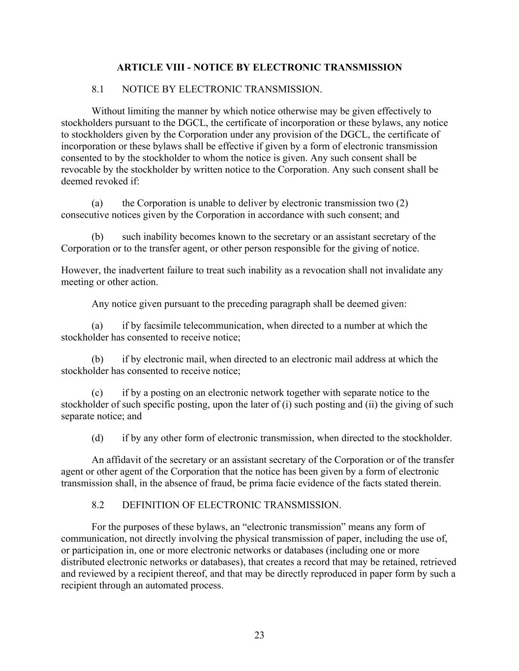 23 ARTICLE VIII - NOTICE BY ELECTRONIC TRANSMISSION 8.1 NOTICE BY ELECTRONIC TRANSMISSION. Without limiting the manner by which notice otherwise may be given effectively to stockholders pursuant to the DGCL, the certificate of incorporation or these bylaws, any notice to stockholders given by the Corporation under any provision of the DGCL, the certificate of incorporation or these bylaws shall be effective if given by a form of electronic transmission consented to by the stockholder to whom the notice is given. Any such consent shall be revocable by the stockholder by written notice to the Corporation. Any such consent shall be deemed revoked if: (a) the Corporation is unable to deliver by electronic transmission two (2) consecutive notices given by the Corporation in accordance with such consent; and (b) such inability becomes known to the secretary or an assistant secretary of the Corporation or to the transfer agent, or other person responsible for the giving of notice. However, the inadvertent failure to treat such inability as a revocation shall not invalidate any meeting or other action. Any notice given pursuant to the preceding paragraph shall be deemed given: (a) if by facsimile telecommunication, when directed to a number at which the stockholder has consented to receive notice; (b) if by electronic mail, when directed to an electronic mail address at which the stockholder has consented to receive notice; (c) if by a posting on an electronic network together with separate notice to the stockholder of such specific posting, upon the later of (i) such posting and (ii) the giving of such separate notice; and (d) if by any other form of electronic transmission, when directed to the stockholder. An affidavit of the secretary or an assistant secretary of the Corporation or of the transfer agent or other agent of the Corporation that the notice has been given by a form of electronic transmission shall, in the absence of fraud, be prima facie evidence of the facts stated therein. 8.2 DEFINITION OF ELECTRONIC TRANSMISSION. For the purposes of these bylaws, an “electronic transmission” means any form of communication, not directly involving the physical transmission of paper, including the use of, or participation in, one or more electronic networks or databases (including one or more distributed electronic networks or databases), that creates a record that may be retained, retrieved and reviewed by a recipient thereof, and that may be directly reproduced in paper form by such a recipient through an automated process.