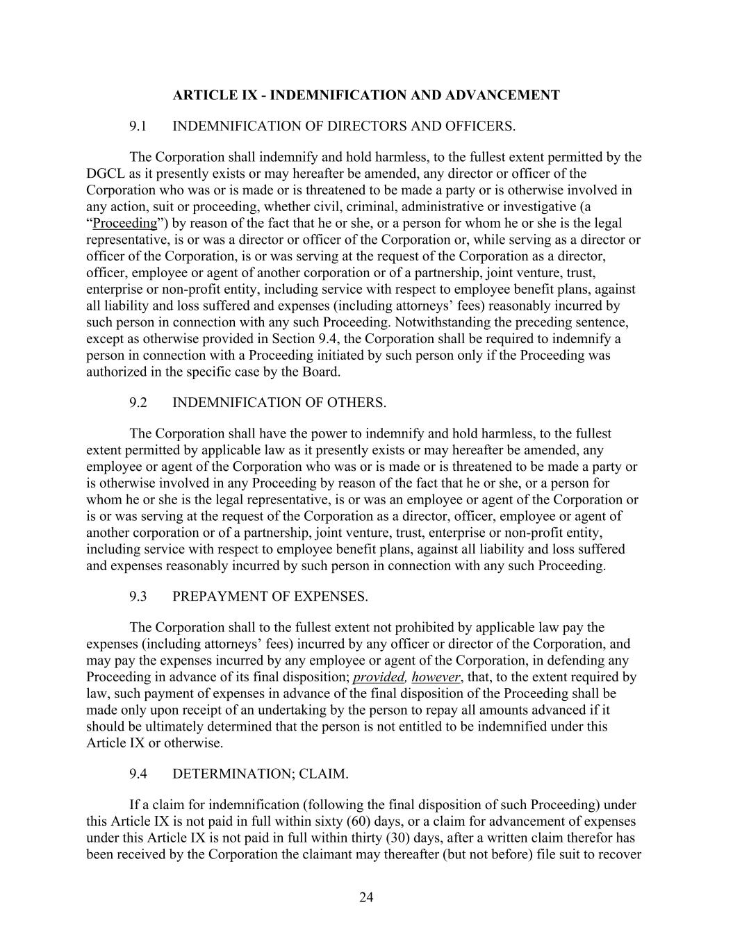 24 ARTICLE IX - INDEMNIFICATION AND ADVANCEMENT 9.1 INDEMNIFICATION OF DIRECTORS AND OFFICERS. The Corporation shall indemnify and hold harmless, to the fullest extent permitted by the DGCL as it presently exists or may hereafter be amended, any director or officer of the Corporation who was or is made or is threatened to be made a party or is otherwise involved in any action, suit or proceeding, whether civil, criminal, administrative or investigative (a “Proceeding”) by reason of the fact that he or she, or a person for whom he or she is the legal representative, is or was a director or officer of the Corporation or, while serving as a director or officer of the Corporation, is or was serving at the request of the Corporation as a director, officer, employee or agent of another corporation or of a partnership, joint venture, trust, enterprise or non-profit entity, including service with respect to employee benefit plans, against all liability and loss suffered and expenses (including attorneys’ fees) reasonably incurred by such person in connection with any such Proceeding. Notwithstanding the preceding sentence, except as otherwise provided in Section 9.4, the Corporation shall be required to indemnify a person in connection with a Proceeding initiated by such person only if the Proceeding was authorized in the specific case by the Board. 9.2 INDEMNIFICATION OF OTHERS. The Corporation shall have the power to indemnify and hold harmless, to the fullest extent permitted by applicable law as it presently exists or may hereafter be amended, any employee or agent of the Corporation who was or is made or is threatened to be made a party or is otherwise involved in any Proceeding by reason of the fact that he or she, or a person for whom he or she is the legal representative, is or was an employee or agent of the Corporation or is or was serving at the request of the Corporation as a director, officer, employee or agent of another corporation or of a partnership, joint venture, trust, enterprise or non-profit entity, including service with respect to employee benefit plans, against all liability and loss suffered and expenses reasonably incurred by such person in connection with any such Proceeding. 9.3 PREPAYMENT OF EXPENSES. The Corporation shall to the fullest extent not prohibited by applicable law pay the expenses (including attorneys’ fees) incurred by any officer or director of the Corporation, and may pay the expenses incurred by any employee or agent of the Corporation, in defending any Proceeding in advance of its final disposition; provided, however, that, to the extent required by law, such payment of expenses in advance of the final disposition of the Proceeding shall be made only upon receipt of an undertaking by the person to repay all amounts advanced if it should be ultimately determined that the person is not entitled to be indemnified under this Article IX or otherwise. 9.4 DETERMINATION; CLAIM. If a claim for indemnification (following the final disposition of such Proceeding) under this Article IX is not paid in full within sixty (60) days, or a claim for advancement of expenses under this Article IX is not paid in full within thirty (30) days, after a written claim therefor has been received by the Corporation the claimant may thereafter (but not before) file suit to recover