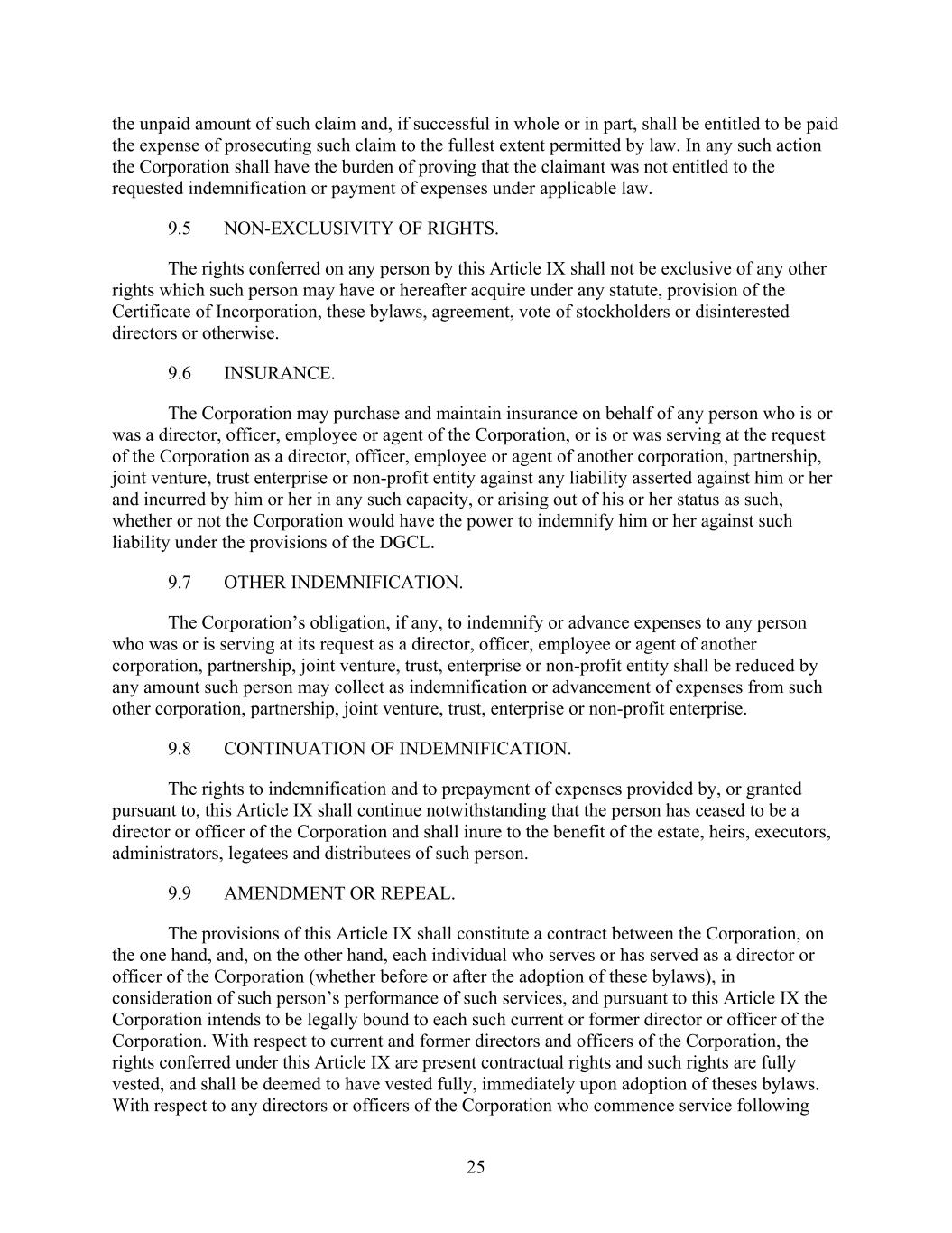 25 the unpaid amount of such claim and, if successful in whole or in part, shall be entitled to be paid the expense of prosecuting such claim to the fullest extent permitted by law. In any such action the Corporation shall have the burden of proving that the claimant was not entitled to the requested indemnification or payment of expenses under applicable law. 9.5 NON-EXCLUSIVITY OF RIGHTS. The rights conferred on any person by this Article IX shall not be exclusive of any other rights which such person may have or hereafter acquire under any statute, provision of the Certificate of Incorporation, these bylaws, agreement, vote of stockholders or disinterested directors or otherwise. 9.6 INSURANCE. The Corporation may purchase and maintain insurance on behalf of any person who is or was a director, officer, employee or agent of the Corporation, or is or was serving at the request of the Corporation as a director, officer, employee or agent of another corporation, partnership, joint venture, trust enterprise or non-profit entity against any liability asserted against him or her and incurred by him or her in any such capacity, or arising out of his or her status as such, whether or not the Corporation would have the power to indemnify him or her against such liability under the provisions of the DGCL. 9.7 OTHER INDEMNIFICATION. The Corporation’s obligation, if any, to indemnify or advance expenses to any person who was or is serving at its request as a director, officer, employee or agent of another corporation, partnership, joint venture, trust, enterprise or non-profit entity shall be reduced by any amount such person may collect as indemnification or advancement of expenses from such other corporation, partnership, joint venture, trust, enterprise or non-profit enterprise. 9.8 CONTINUATION OF INDEMNIFICATION. The rights to indemnification and to prepayment of expenses provided by, or granted pursuant to, this Article IX shall continue notwithstanding that the person has ceased to be a director or officer of the Corporation and shall inure to the benefit of the estate, heirs, executors, administrators, legatees and distributees of such person. 9.9 AMENDMENT OR REPEAL. The provisions of this Article IX shall constitute a contract between the Corporation, on the one hand, and, on the other hand, each individual who serves or has served as a director or officer of the Corporation (whether before or after the adoption of these bylaws), in consideration of such person’s performance of such services, and pursuant to this Article IX the Corporation intends to be legally bound to each such current or former director or officer of the Corporation. With respect to current and former directors and officers of the Corporation, the rights conferred under this Article IX are present contractual rights and such rights are fully vested, and shall be deemed to have vested fully, immediately upon adoption of theses bylaws. With respect to any directors or officers of the Corporation who commence service following
