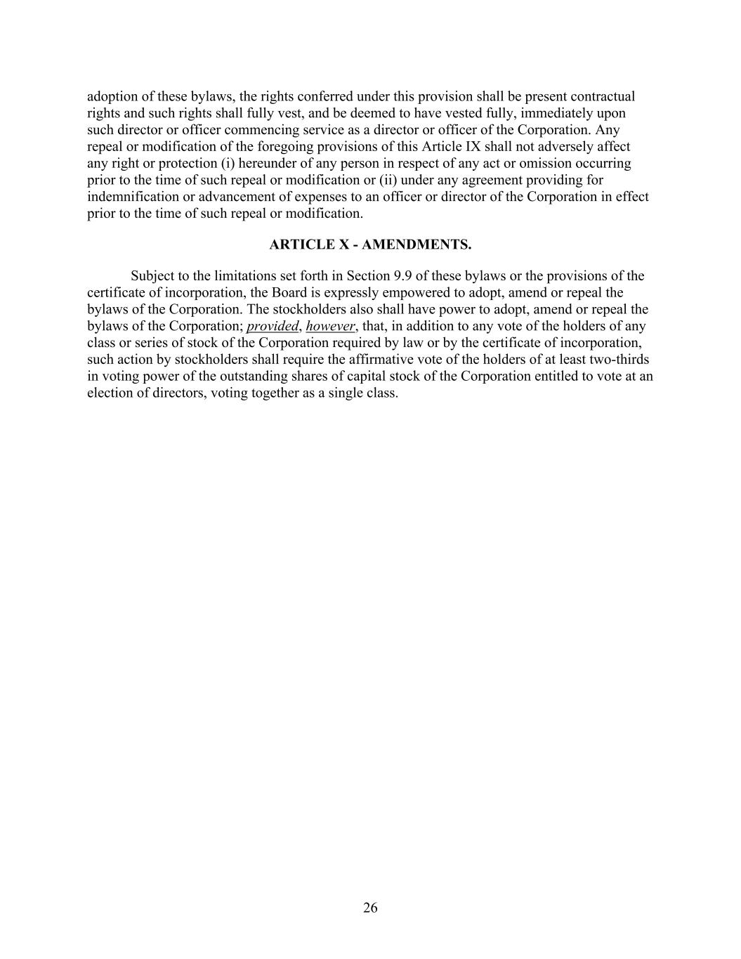26 adoption of these bylaws, the rights conferred under this provision shall be present contractual rights and such rights shall fully vest, and be deemed to have vested fully, immediately upon such director or officer commencing service as a director or officer of the Corporation. Any repeal or modification of the foregoing provisions of this Article IX shall not adversely affect any right or protection (i) hereunder of any person in respect of any act or omission occurring prior to the time of such repeal or modification or (ii) under any agreement providing for indemnification or advancement of expenses to an officer or director of the Corporation in effect prior to the time of such repeal or modification. ARTICLE X - AMENDMENTS. Subject to the limitations set forth in Section 9.9 of these bylaws or the provisions of the certificate of incorporation, the Board is expressly empowered to adopt, amend or repeal the bylaws of the Corporation. The stockholders also shall have power to adopt, amend or repeal the bylaws of the Corporation; provided, however, that, in addition to any vote of the holders of any class or series of stock of the Corporation required by law or by the certificate of incorporation, such action by stockholders shall require the affirmative vote of the holders of at least two-thirds in voting power of the outstanding shares of capital stock of the Corporation entitled to vote at an election of directors, voting together as a single class.