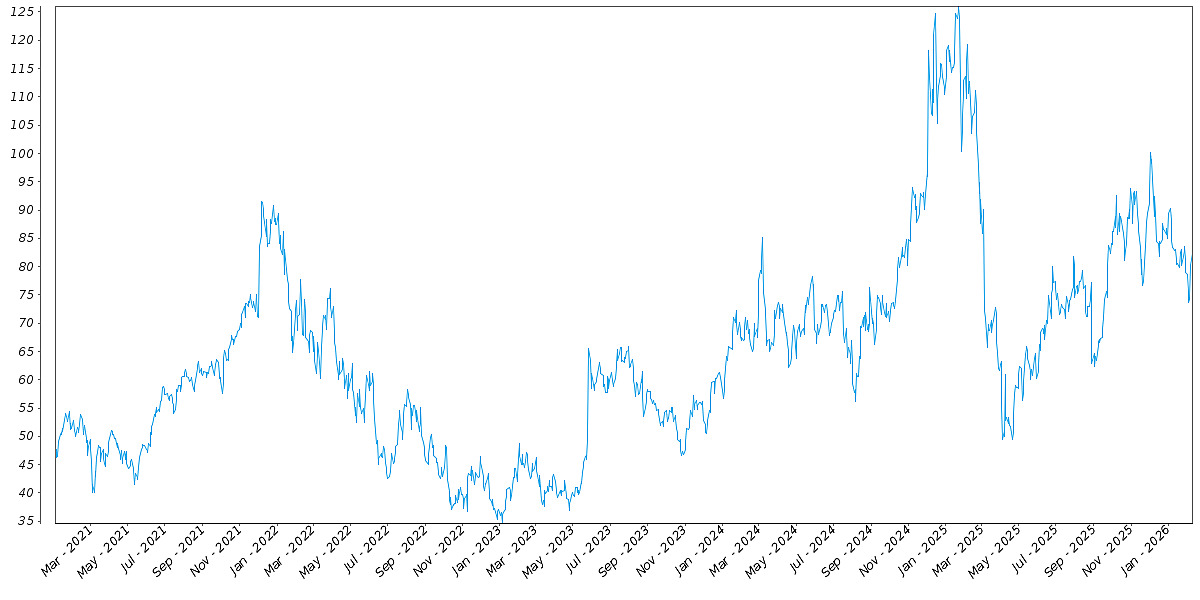 The following graph sets forth the daily historical performance of MRVL in the period from January 2, 2021 through the pricing date. We obtained this historical data from Bloomberg L.P. We have not independently verified the accuracy or completeness of the information obtained from Bloomberg L.P. The Closing Market Prices reflected in the graph below may have been adjusted to reflect certain corporate actions, such as stock splits and reverse stock splits. On the pricing date, the Closing Market Price of MRVL was $82.35.