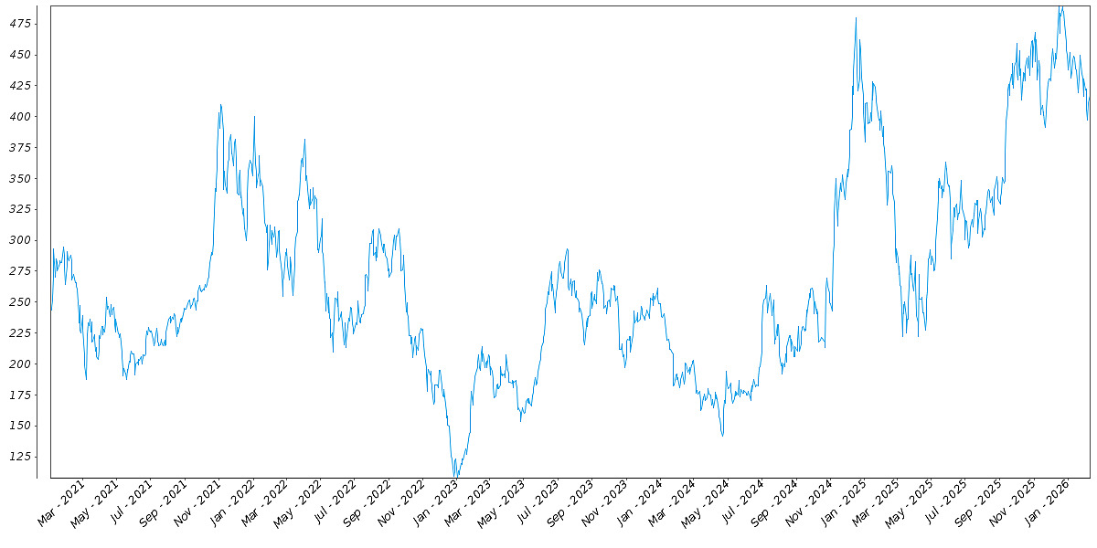 The following graph sets forth the daily historical performance of TSLA in the period from January 2, 2021 through the pricing date. We obtained this historical data from Bloomberg L.P. We have not independently verified the accuracy or completeness of the information obtained from Bloomberg L.P. The Closing Market Prices reflected in the graph below may have been adjusted to reflect certain corporate actions, such as stock splits and reverse stock splits. On the pricing date, the Closing Market Price of TSLA was $417.32.