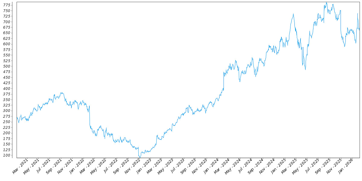 The following graph sets forth the daily historical performance of META in the period from January 2, 2021 through the pricing date. We obtained this historical data from Bloomberg L.P. We have not independently verified the accuracy or completeness of the information obtained from Bloomberg L.P. The Closing Market Prices reflected in the graph below may have been adjusted to reflect certain corporate actions, such as stock splits and reverse stock splits. On the pricing date, the Closing Market Price of META was $677.22.