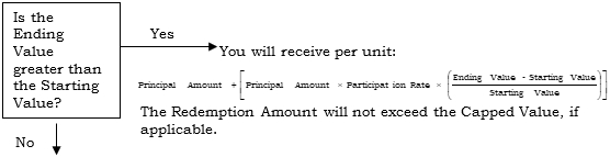| · | If the value of the Market Measure increases from its Starting Value to its Ending Value (each as defined below), you will receive at maturity a cash payment per unit (the “Redemption Amount”) that equals the principal amount plus a multiple (the “Participation Rate”) of that increase. The Participation Rate will generally be greater than or equal to 100%. If specified in the applicable term sheet, the Redemption Amount may be subject to a specified cap (the “Capped Value”). |
