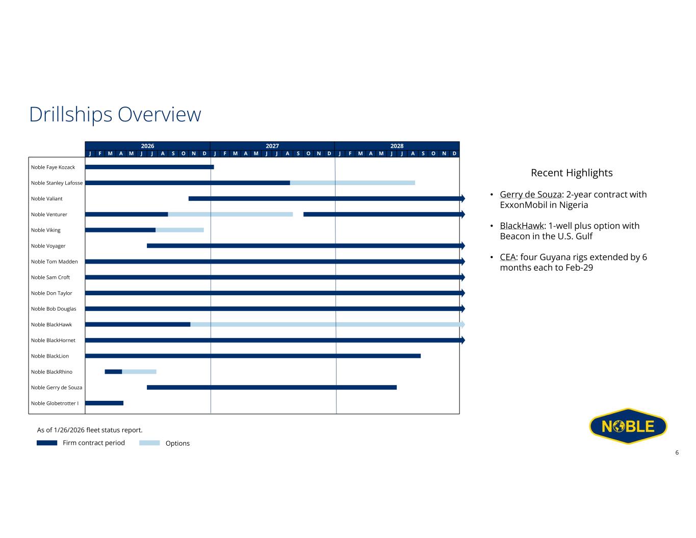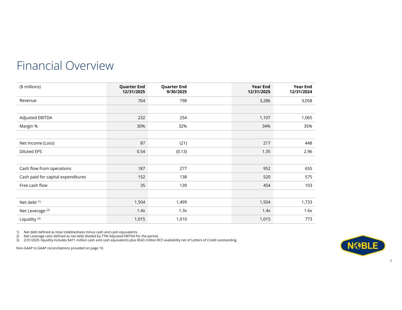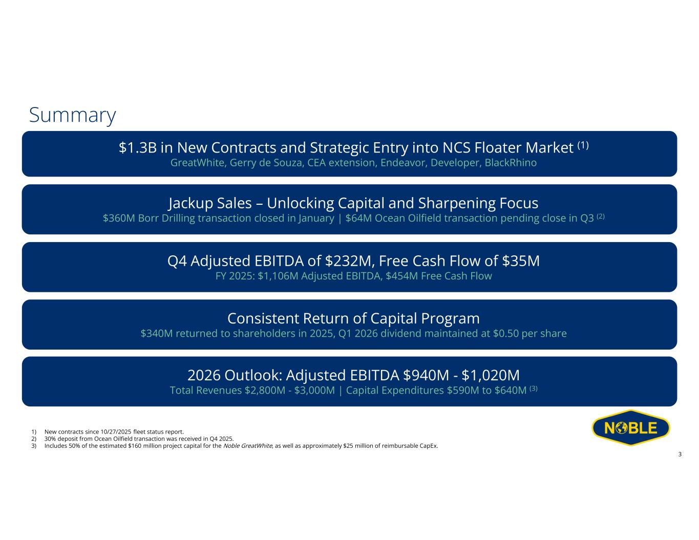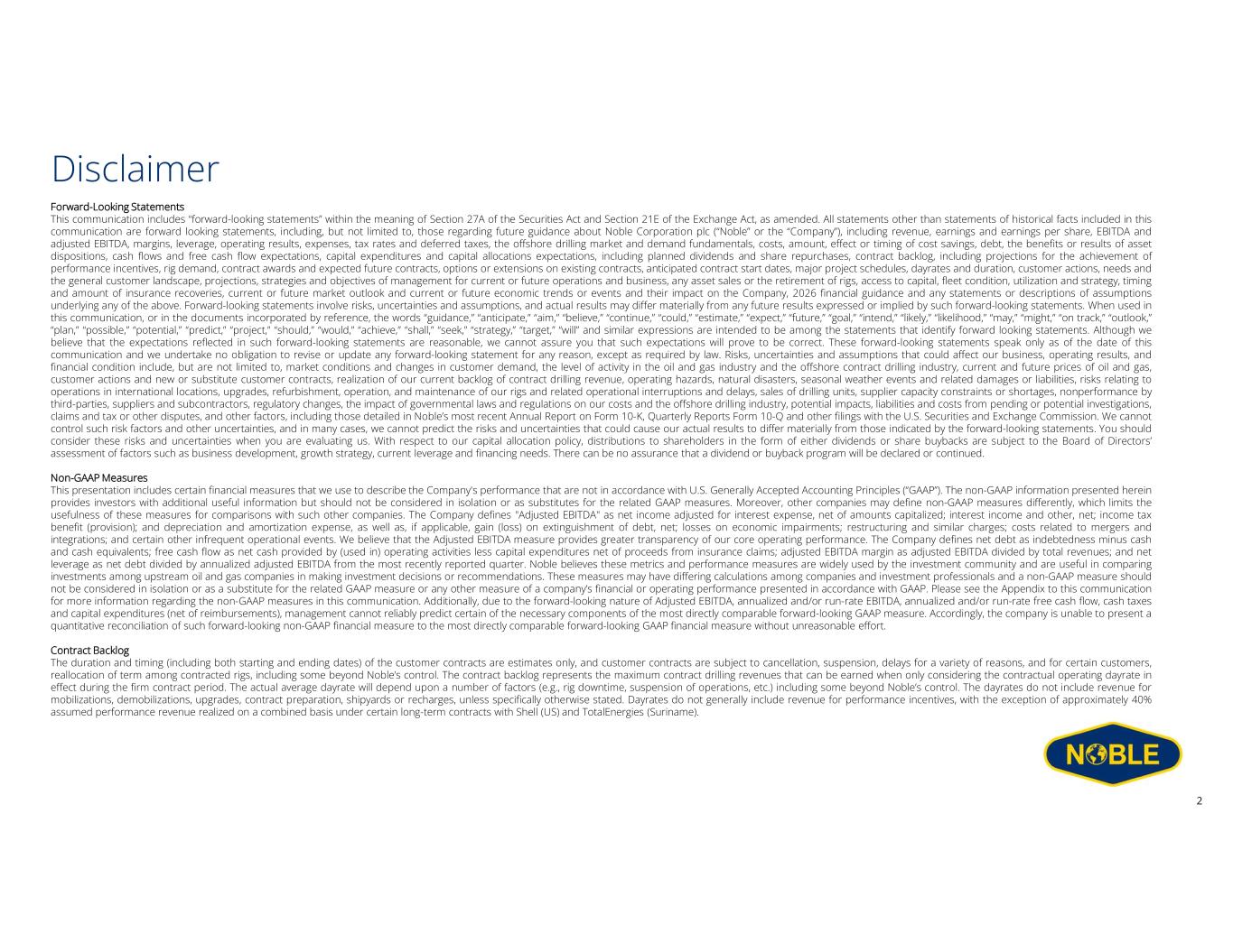 Disclaimer Forward-Looking Statements This communication includes “forward-looking statements” within the meaning of Section 27A of the Securities Act and Section 21E of the Exchange Act, as amended. All statements other than statements of historical facts included in this communication are forward looking statements, including, but not limited to, those regarding future guidance about Noble Corporation plc (“Noble” or the “Company”), including revenue, earnings and earnings per share, EBITDA and adjusted EBITDA, margins, leverage, operating results, expenses, tax rates and deferred taxes, the offshore drilling market and demand fundamentals, costs, amount, effect or timing of cost savings, debt, the benefits or results of asset dispositions, cash flows and free cash flow expectations, capital expenditures and capital allocations expectations, including planned dividends and share repurchases, contract backlog, including projections for the achievement of performance incentives, rig demand, contract awards and expected future contracts, options or extensions on existing contracts, anticipated contract start dates, major project schedules, dayrates and duration, customer actions, needs and the general customer landscape, projections, strategies and objectives of management for current or future operations and business, any asset sales or the retirement of rigs, access to capital, fleet condition, utilization and strategy, timing and amount of insurance recoveries, current or future market outlook and current or future economic trends or events and their impact on the Company, 2026 financial guidance and any statements or descriptions of assumptions underlying any of the above. Forward-looking statements involve risks, uncertainties and assumptions, and actual results may differ materially from any future results expressed or implied by such forward-looking statements. When used in this communication, or in the documents incorporated by reference, the words “guidance,” “anticipate,” “aim,” “believe,” “continue,” “could,” “estimate,” “expect,” “future,” “goal,” “intend,” “likely,” “likelihood,” “may,” “might,” “on track,” “outlook,” “plan,” “possible,” “potential,” “predict,” “project,” “should,” “would,” “achieve,” “shall,” “seek,” “strategy,” “target,” “will” and similar expressions are intended to be among the statements that identify forward looking statements. Although we believe that the expectations reflected in such forward-looking statements are reasonable, we cannot assure you that such expectations will prove to be correct. These forward-looking statements speak only as of the date of this communication and we undertake no obligation to revise or update any forward-looking statement for any reason, except as required by law. Risks, uncertainties and assumptions that could affect our business, operating results, and financial condition include, but are not limited to, market conditions and changes in customer demand, the level of activity in the oil and gas industry and the offshore contract drilling industry, current and future prices of oil and gas, customer actions and new or substitute customer contracts, realization of our current backlog of contract drilling revenue, operating hazards, natural disasters, seasonal weather events and related damages or liabilities, risks relating to operations in international locations, upgrades, refurbishment, operation, and maintenance of our rigs and related operational interruptions and delays, sales of drilling units, supplier capacity constraints or shortages, nonperformance by third-parties, suppliers and subcontractors, regulatory changes, the impact of governmental laws and regulations on our costs and the offshore drilling industry, potential impacts, liabilities and costs from pending or potential investigations, claims and tax or other disputes, and other factors, including those detailed in Noble’s most recent Annual Report on Form 10-K, Quarterly Reports Form 10-Q and other filings with the U.S. Securities and Exchange Commission. We cannot control such risk factors and other uncertainties, and in many cases, we cannot predict the risks and uncertainties that could cause our actual results to differ materially from those indicated by the forward-looking statements. You should consider these risks and uncertainties when you are evaluating us. With respect to our capital allocation policy, distributions to shareholders in the form of either dividends or share buybacks are subject to the Board of Directors’ assessment of factors such as business development, growth strategy, current leverage and financing needs. There can be no assurance that a dividend or buyback program will be declared or continued. Non-GAAP Measures This presentation includes certain financial measures that we use to describe the Company's performance that are not in accordance with U.S. Generally Accepted Accounting Principles (“GAAP”). The non-GAAP information presented herein provides investors with additional useful information but should not be considered in isolation or as substitutes for the related GAAP measures. Moreover, other companies may define non-GAAP measures differently, which limits the usefulness of these measures for comparisons with such other companies. The Company defines "Adjusted EBITDA" as net income adjusted for interest expense, net of amounts capitalized; interest income and other, net; income tax benefit (provision); and depreciation and amortization expense, as well as, if applicable, gain (loss) on extinguishment of debt, net; losses on economic impairments; restructuring and similar charges; costs related to mergers and integrations; and certain other infrequent operational events. We believe that the Adjusted EBITDA measure provides greater transparency of our core operating performance. Th