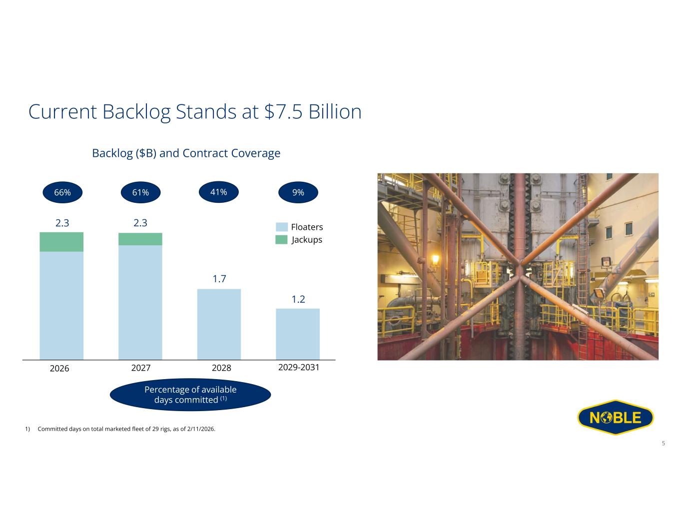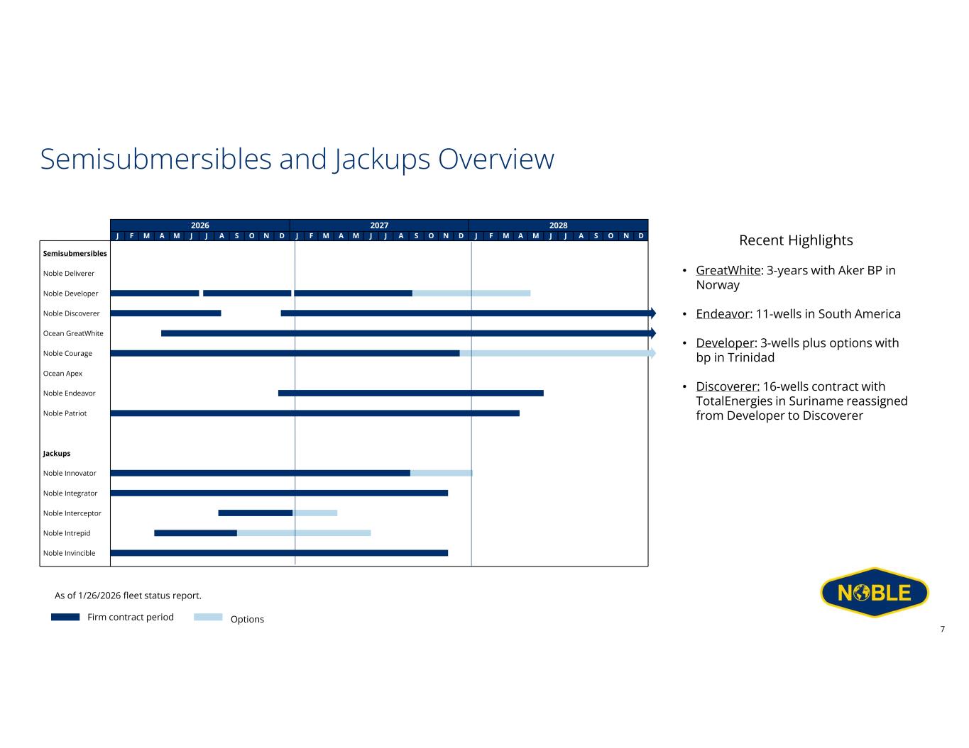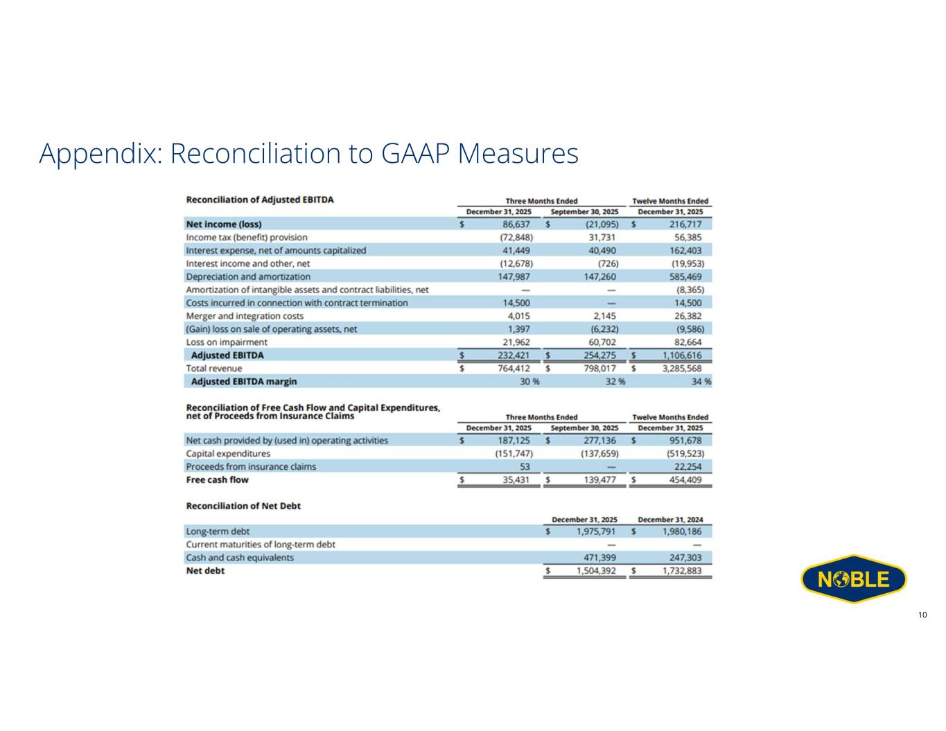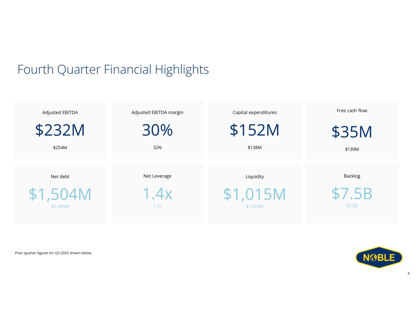 Disclaimer Forward-Looking Statements This communication includes “forward-looking statements” within the meaning of Section 27A of the Securities Act and Section 21E of the Exchange Act, as amended. All statements other than statements of historical facts included in this communication are forward looking statements, including, but not limited to, those regarding future guidance about Noble Corporation plc (“Noble” or the “Company”), including revenue, earnings and earnings per share, EBITDA and adjusted EBITDA, margins, leverage, operating results, expenses, tax rates and deferred taxes, the offshore drilling market and demand fundamentals, costs, amount, effect or timing of cost savings, debt, the benefits or results of asset dispositions, cash flows and free cash flow expectations, capital expenditures and capital allocations expectations, including planned dividends and share repurchases, contract backlog, including projections for the achievement of performance incentives, rig demand, contract awards and expected future contracts, options or extensions on existing contracts, anticipated contract start dates, major project schedules, dayrates and duration, customer actions, needs and the general customer landscape, projections, strategies and objectives of management for current or future operations and business, any asset sales or the retirement of rigs, access to capital, fleet condition, utilization and strategy, timing and amount of insurance recoveries, current or future market outlook and current or future economic trends or events and their impact on the Company, 2026 financial guidance and any statements or descriptions of assumptions underlying any of the above. Forward-looking statements involve risks, uncertainties and assumptions, and actual results may differ materially from any future results expressed or implied by such forward-looking statements. When used in this communication, or in the documents incorporated by reference, the words “guidance,” “anticipate,” “aim,” “believe,” “continue,” “could,” “estimate,” “expect,” “future,” “goal,” “intend,” “likely,” “likelihood,” “may,” “might,” “on track,” “outlook,” “plan,” “possible,” “potential,” “predict,” “project,” “should,” “would,” “achieve,” “shall,” “seek,” “strategy,” “target,” “will” and similar expressions are intended to be among the statements that identify forward looking statements. Although we believe that the expectations reflected in such forward-looking statements are reasonable, we cannot assure you that such expectations will prove to be correct. These forward-looking statements speak only as of the date of this communication and we undertake no obligation to revise or update any forward-looking statement for any reason, except as required by law. Risks, uncertainties and assumptions that could affect our business, operating results, and financial condition include, but are not limited to, market conditions and changes in customer demand, the level of activity in the oil and gas industry and the offshore contract drilling industry, current and future prices of oil and gas, customer actions and new or substitute customer contracts, realization of our current backlog of contract drilling revenue, operating hazards, natural disasters, seasonal weather events and related damages or liabilities, risks relating to operations in international locations, upgrades, refurbishment, operation, and maintenance of our rigs and related operational interruptions and delays, sales of drilling units, supplier capacity constraints or shortages, nonperformance by third-parties, suppliers and subcontractors, regulatory changes, the impact of governmental laws and regulations on our costs and the offshore drilling industry, potential impacts, liabilities and costs from pending or potential investigations, claims and tax or other disputes, and other factors, including those detailed in Noble’s most recent Annual Report on Form 10-K, Quarterly Reports Form 10-Q and other filings with the U.S. Securities and Exchange Commission. We cannot control such risk factors and other uncertainties, and in many cases, we cannot predict the risks and uncertainties that could cause our actual results to differ materially from those indicated by the forward-looking statements. You should consider these risks and uncertainties when you are evaluating us. With respect to our capital allocation policy, distributions to shareholders in the form of either dividends or share buybacks are subject to the Board of Directors’ assessment of factors such as business development, growth strategy, current leverage and financing needs. There can be no assurance that a dividend or buyback program will be declared or continued. Non-GAAP Measures This presentation includes certain financial measures that we use to describe the Company's performance that are not in accordance with U.S. Generally Accepted Accounting Principles (“GAAP”). The non-GAAP information presented herein provides investors with additional useful information but should not be considered in isolation or as substitutes for the related GAAP measures. Moreover, other companies may define non-GAAP measures differently, which limits the usefulness of these measures for comparisons with such other companies. The Company defines "Adjusted EBITDA" as net income adjusted for interest expense, net of amounts capitalized; interest income and other, net; income tax benefit (provision); and depreciation and amortization expense, as well as, if applicable, gain (loss) on extinguishment of debt, net; losses on economic impairments; restructuring and similar charges; costs related to mergers and integrations; and certain other infrequent operational events. We believe that the Adjusted EBITDA measure provides greater transparency of our core operating performance. Th