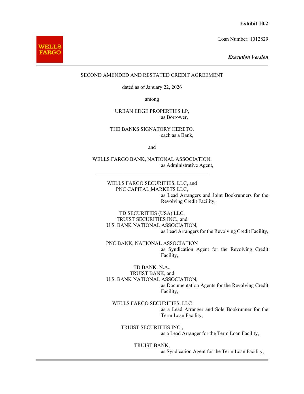 Exhibit 10.2 Loan Number: 1012829 Execution Version SECOND AMENDED AND RESTATED CREDIT AGREEMENT dated as of January 22, 2026 among URBAN EDGE PROPERTIES LP, as Borrower, THE BANKS SIGNATORY HERETO, each as a Bank, and WELLS FARGO BANK, NATIONAL ASSOCIATION, as Administrative Agent, ___________________________________________ WELLS FARGO SECURITIES, LLC, and PNC CAPITAL MARKETS LLC, as Lead Arrangers and Joint Bookrunners for the Revolving Credit Facility, TD SECURITIES (USA) LLC, TRUIST SECURITIES INC., and U.S. BANK NATIONAL ASSOCIATION, as Lead Arrangers for the Revolving Credit Facility, PNC BANK, NATIONAL ASSOCIATION as Syndication Agent for the Revolving Credit Facility, TD BANK, N.A., TRUIST BANK, and U.S. BANK NATIONAL ASSOCIATION, as Documentation Agents for the Revolving Credit Facility, WELLS FARGO SECURITIES, LLC as a Lead Arranger and Sole Bookrunner for the Term Loan Facility, TRUIST SECURITIES INC., as a Lead Arranger for the Term Loan Facility, TRUIST BANK, as Syndication Agent for the Term Loan Facility,