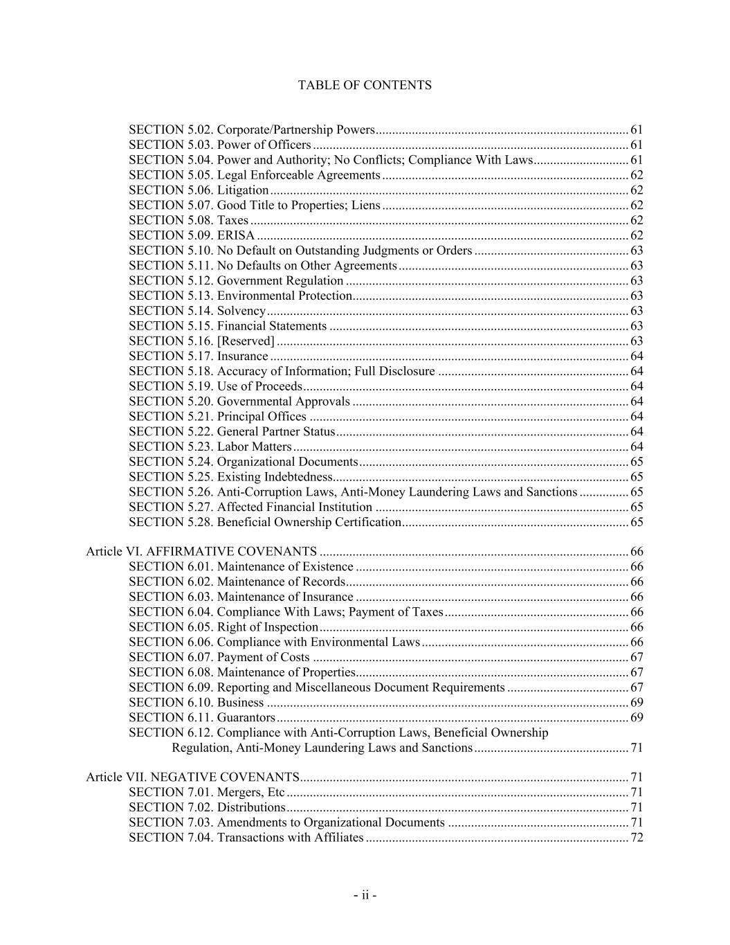 TABLE OF CONTENTS - ii - SECTION 5.02. Corporate/Partnership Powers ............................................................................. 61 SECTION 5.03. Power of Officers ................................................................................................ 61 SECTION 5.04. Power and Authority; No Conflicts; Compliance With Laws ............................. 61 SECTION 5.05. Legal Enforceable Agreements ........................................................................... 62 SECTION 5.06. Litigation ............................................................................................................. 62 SECTION 5.07. Good Title to Properties; Liens ........................................................................... 62 SECTION 5.08. Taxes ................................................................................................................... 62 SECTION 5.09. ERISA ................................................................................................................. 62 SECTION 5.10. No Default on Outstanding Judgments or Orders ............................................... 63 SECTION 5.11. No Defaults on Other Agreements ...................................................................... 63 SECTION 5.12. Government Regulation ...................................................................................... 63 SECTION 5.13. Environmental Protection .................................................................................... 63 SECTION 5.14. Solvency .............................................................................................................. 63 SECTION 5.15. Financial Statements ........................................................................................... 63 SECTION 5.16. [Reserved] ........................................................................................................... 63 SECTION 5.17. Insurance ............................................................................................................. 64 SECTION 5.18. Accuracy of Information; Full Disclosure .......................................................... 64 SECTION 5.19. Use of Proceeds ................................................................................................... 64 SECTION 5.20. Governmental Approvals .................................................................................... 64 SECTION 5.21. Principal Offices ................................................................................................. 64 SECTION 5.22. General Partner Status ......................................................................................... 64 SECTION 5.23. Labor Matters ...................................................................................................... 64 SECTION 5.24. Organizational Documents .................................................................................. 65 SECTION 5.25. Existing Indebtedness.......................................................................................... 65 SECTION 5.26. Anti-Corruption Laws, Anti-Money Laundering Laws and Sanctions ............... 65 SECTION 5.27. Affected Financial Institution ............................................................................. 65 SECTION 5.28. Beneficial Ownership Certification ..................................................................... 65 Article VI. AFFIRMATIVE COVENANTS .............................................................................................. 66 SECTION 6.01. Maintenance of Existence ................................................................................... 66 SECTION 6.02. Maintenance of Records ...................................................................................... 66 SECTION 6.03. Maintenance of Insurance ................................................................................... 66 SECTION 6.04. Compliance With Laws; Payment of Taxes ........................................................ 66 SECTION 6.05. Right of Inspection .............................................................................................. 66 SECTION 6.06. Compliance with Environmental Laws ............................................................... 66 SECTION 6.07. Payment of Costs ................................................................................................ 67 SECTION 6.08. Maintenance of Properties ................................................................................... 67 SECTION 6.09. Reporting and Miscellaneous Document Requirements ..................................... 67 SECTION 6.10. Business .............................................................................................................. 69 SECTION 6.11. Guarantors ........................................................................................................... 69 SECTION 6.12. Compliance with Anti-Corruption Laws, Beneficial Ownership Regulation, Anti-Money Laundering Laws and Sanctions ............................................... 71 Article VII. NEGATIVE COVENANTS .................................................................................................... 71 SECTION 7.01. Mergers, Etc ........................................................................................................ 71 SECTION 7.02. Distributions ........................................................................................................ 71 SECTION 7.03. Amendments to Organizational Documents ....................................................... 71 SECTION 7.04. Transactions with Affiliates ................................................................................ 72
