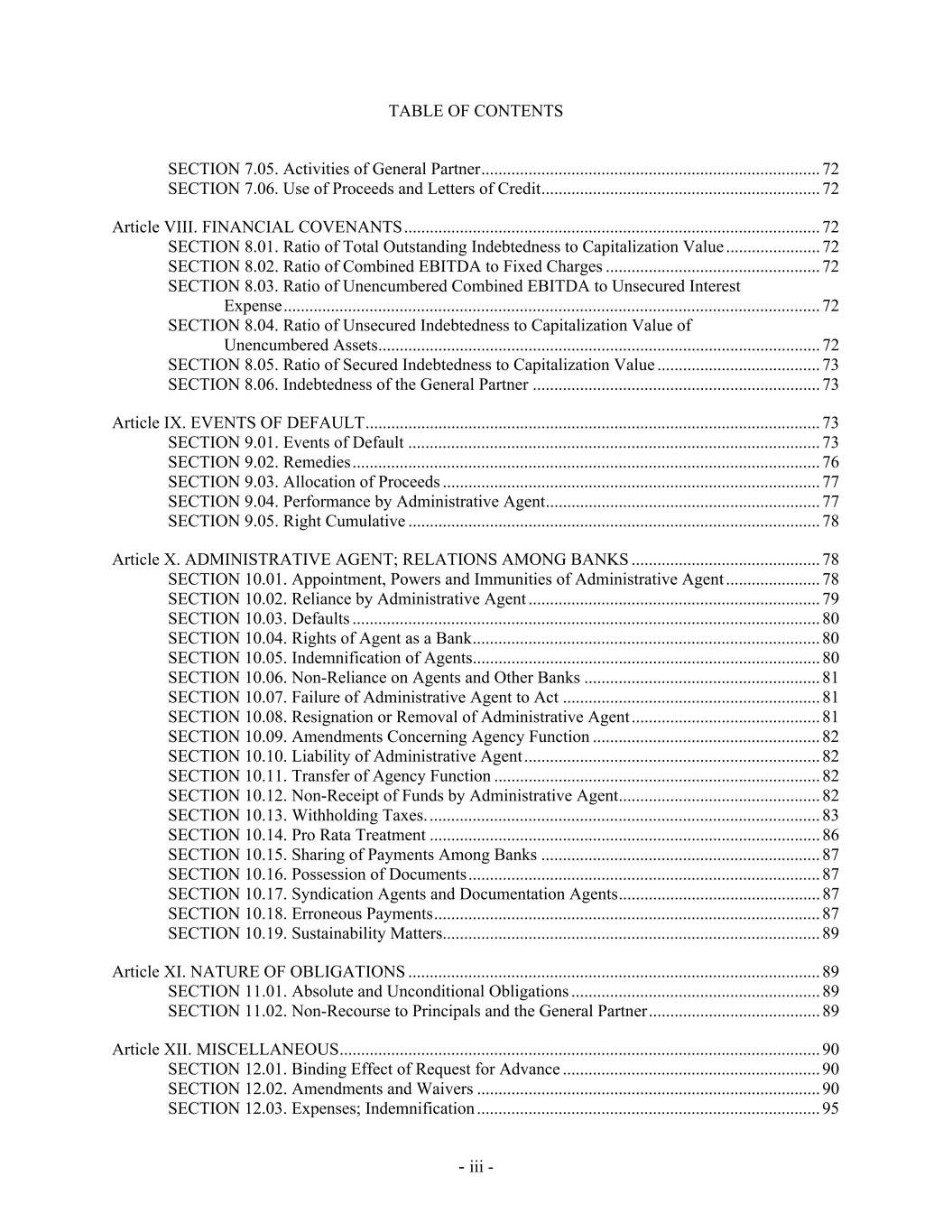 TABLE OF CONTENTS - iii - SECTION 7.05. Activities of General Partner ............................................................................... 72 SECTION 7.06. Use of Proceeds and Letters of Credit ................................................................. 72 Article VIII. FINANCIAL COVENANTS ................................................................................................. 72 SECTION 8.01. Ratio of Total Outstanding Indebtedness to Capitalization Value ...................... 72 SECTION 8.02. Ratio of Combined EBITDA to Fixed Charges .................................................. 72 SECTION 8.03. Ratio of Unencumbered Combined EBITDA to Unsecured Interest Expense ............................................................................................................................. 72 SECTION 8.04. Ratio of Unsecured Indebtedness to Capitalization Value of Unencumbered Assets ....................................................................................................... 72 SECTION 8.05. Ratio of Secured Indebtedness to Capitalization Value ...................................... 73 SECTION 8.06. Indebtedness of the General Partner ................................................................... 73 Article IX. EVENTS OF DEFAULT .......................................................................................................... 73 SECTION 9.01. Events of Default ................................................................................................ 73 SECTION 9.02. Remedies ............................................................................................................. 76 SECTION 9.03. Allocation of Proceeds ........................................................................................ 77 SECTION 9.04. Performance by Administrative Agent ................................................................ 77 SECTION 9.05. Right Cumulative ................................................................................................ 78 Article X. ADMINISTRATIVE AGENT; RELATIONS AMONG BANKS ............................................ 78 SECTION 10.01. Appointment, Powers and Immunities of Administrative Agent ...................... 78 SECTION 10.02. Reliance by Administrative Agent .................................................................... 79 SECTION 10.03. Defaults ............................................................................................................. 80 SECTION 10.04. Rights of Agent as a Bank ................................................................................. 80 SECTION 10.05. Indemnification of Agents ................................................................................. 80 SECTION 10.06. Non-Reliance on Agents and Other Banks ....................................................... 81 SECTION 10.07. Failure of Administrative Agent to Act ............................................................ 81 SECTION 10.08. Resignation or Removal of Administrative Agent ............................................ 81 SECTION 10.09. Amendments Concerning Agency Function ..................................................... 82 SECTION 10.10. Liability of Administrative Agent ..................................................................... 82 SECTION 10.11. Transfer of Agency Function ............................................................................ 82 SECTION 10.12. Non-Receipt of Funds by Administrative Agent ............................................... 82 SECTION 10.13. Withholding Taxes. ........................................................................................... 83 SECTION 10.14. Pro Rata Treatment ........................................................................................... 86 SECTION 10.15. Sharing of Payments Among Banks ................................................................. 87 SECTION 10.16. Possession of Documents .................................................................................. 87 SECTION 10.17. Syndication Agents and Documentation Agents ............................................... 87 SECTION 10.18. Erroneous Payments .......................................................................................... 87 SECTION 10.19. Sustainability Matters........................................................................................ 89 Article XI. NATURE OF OBLIGATIONS ................................................................................................ 89 SECTION 11.01. Absolute and Unconditional Obligations .......................................................... 89 SECTION 11.02. Non-Recourse to Principals and the General Partner ........................................ 89 Article XII. MISCELLANEOUS ................................................................................................................ 90 SECTION 12.01. Binding Effect of Request for Advance ............................................................ 90 SECTION 12.02. Amendments and Waivers ................................................................................ 90 SECTION 12.03. Expenses; Indemnification ................................................................................ 95