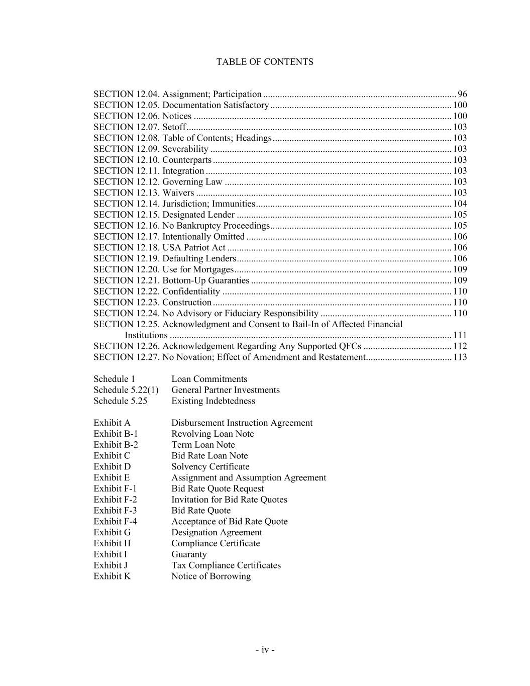 TABLE OF CONTENTS - iv - SECTION 12.04. Assignment; Participation ................................................................................. 96 SECTION 12.05. Documentation Satisfactory ............................................................................ 100 SECTION 12.06. Notices ............................................................................................................ 100 SECTION 12.07. Setoff ............................................................................................................... 103 SECTION 12.08. Table of Contents; Headings ........................................................................... 103 SECTION 12.09. Severability ..................................................................................................... 103 SECTION 12.10. Counterparts .................................................................................................... 103 SECTION 12.11. Integration ....................................................................................................... 103 SECTION 12.12. Governing Law ............................................................................................... 103 SECTION 12.13. Waivers ........................................................................................................... 103 SECTION 12.14. Jurisdiction; Immunities .................................................................................. 104 SECTION 12.15. Designated Lender .......................................................................................... 105 SECTION 12.16. No Bankruptcy Proceedings ............................................................................ 105 SECTION 12.17. Intentionally Omitted ...................................................................................... 106 SECTION 12.18. USA Patriot Act .............................................................................................. 106 SECTION 12.19. Defaulting Lenders .......................................................................................... 106 SECTION 12.20. Use for Mortgages ........................................................................................... 109 SECTION 12.21. Bottom-Up Guaranties .................................................................................... 109 SECTION 12.22. Confidentiality ................................................................................................ 110 SECTION 12.23. Construction .................................................................................................... 110 SECTION 12.24. No Advisory or Fiduciary Responsibility ....................................................... 110 SECTION 12.25. Acknowledgment and Consent to Bail-In of Affected Financial Institutions ...................................................................................................................... 111 SECTION 12.26. Acknowledgement Regarding Any Supported QFCs ..................................... 112 SECTION 12.27. No Novation; Effect of Amendment and Restatement .................................... 113 Schedule 1 Loan Commitments Schedule 5.22(1) General Partner Investments Schedule 5.25 Existing Indebtedness Exhibit A Disbursement Instruction Agreement Exhibit B-1 Revolving Loan Note Exhibit B-2 Term Loan Note Exhibit C Bid Rate Loan Note Exhibit D Solvency Certificate Exhibit E Assignment and Assumption Agreement Exhibit F-1 Bid Rate Quote Request Exhibit F-2 Invitation for Bid Rate Quotes Exhibit F-3 Bid Rate Quote Exhibit F-4 Acceptance of Bid Rate Quote Exhibit G Designation Agreement Exhibit H Compliance Certificate Exhibit I Guaranty Exhibit J Tax Compliance Certificates Exhibit K Notice of Borrowing