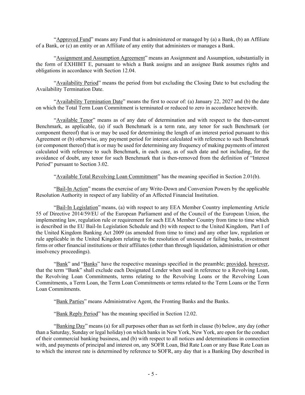 - 5 - “Approved Fund” means any Fund that is administered or managed by (a) a Bank, (b) an Affiliate of a Bank, or (c) an entity or an Affiliate of any entity that administers or manages a Bank. “Assignment and Assumption Agreement” means an Assignment and Assumption, substantially in the form of EXHIBIT E, pursuant to which a Bank assigns and an assignee Bank assumes rights and obligations in accordance with Section 12.04. “Availability Period” means the period from but excluding the Closing Date to but excluding the Availability Termination Date. “Availability Termination Date” means the first to occur of: (a) January 22, 2027 and (b) the date on which the Total Term Loan Commitment is terminated or reduced to zero in accordance herewith. “Available Tenor” means as of any date of determination and with respect to the then-current Benchmark, as applicable, (a) if such Benchmark is a term rate, any tenor for such Benchmark (or component thereof) that is or may be used for determining the length of an interest period pursuant to this Agreement or (b) otherwise, any payment period for interest calculated with reference to such Benchmark (or component thereof) that is or may be used for determining any frequency of making payments of interest calculated with reference to such Benchmark, in each case, as of such date and not including, for the avoidance of doubt, any tenor for such Benchmark that is then-removed from the definition of “Interest Period” pursuant to Section 3.02. “Available Total Revolving Loan Commitment” has the meaning specified in Section 2.01(b). “Bail-In Action” means the exercise of any Write-Down and Conversion Powers by the applicable Resolution Authority in respect of any liability of an Affected Financial Institution. “Bail-In Legislation” means, (a) with respect to any EEA Member Country implementing Article 55 of Directive 2014/59/EU of the European Parliament and of the Council of the European Union, the implementing law, regulation rule or requirement for such EEA Member Country from time to time which is described in the EU Bail-In Legislation Schedule and (b) with respect to the United Kingdom, Part I of the United Kingdom Banking Act 2009 (as amended from time to time) and any other law, regulation or rule applicable in the United Kingdom relating to the resolution of unsound or failing banks, investment firms or other financial institutions or their affiliates (other than through liquidation, administration or other insolvency proceedings). “Bank” and “Banks” have the respective meanings specified in the preamble; provided, however, that the term “Bank” shall exclude each Designated Lender when used in reference to a Revolving Loan, the Revolving Loan Commitments, terms relating to the Revolving Loans or the Revolving Loan Commitments, a Term Loan, the Term Loan Commitments or terms related to the Term Loans or the Term Loan Commitments. “Bank Parties” means Administrative Agent, the Fronting Banks and the Banks. “Bank Reply Period” has the meaning specified in Section 12.02. “Banking Day” means (a) for all purposes other than as set forth in clause (b) below, any day (other than a Saturday, Sunday or legal holiday) on which banks in New York, New York, are open for the conduct of their commercial banking business, and (b) with respect to all notices and determinations in connection with, and payments of principal and interest on, any SOFR Loan, Bid Rate Loan or any Base Rate Loan as to which the interest rate is determined by reference to SOFR, any day that is a Banking Day described in