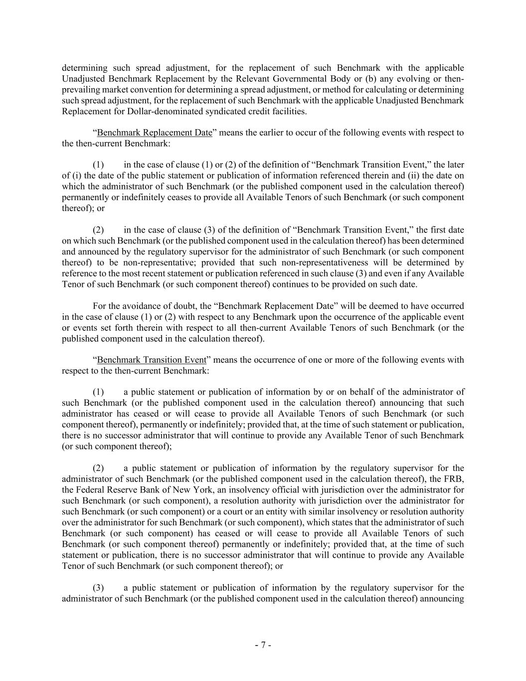 - 7 - determining such spread adjustment, for the replacement of such Benchmark with the applicable Unadjusted Benchmark Replacement by the Relevant Governmental Body or (b) any evolving or then- prevailing market convention for determining a spread adjustment, or method for calculating or determining such spread adjustment, for the replacement of such Benchmark with the applicable Unadjusted Benchmark Replacement for Dollar-denominated syndicated credit facilities. “Benchmark Replacement Date” means the earlier to occur of the following events with respect to the then-current Benchmark: (1) in the case of clause (1) or (2) of the definition of “Benchmark Transition Event,” the later of (i) the date of the public statement or publication of information referenced therein and (ii) the date on which the administrator of such Benchmark (or the published component used in the calculation thereof) permanently or indefinitely ceases to provide all Available Tenors of such Benchmark (or such component thereof); or (2) in the case of clause (3) of the definition of “Benchmark Transition Event,” the first date on which such Benchmark (or the published component used in the calculation thereof) has been determined and announced by the regulatory supervisor for the administrator of such Benchmark (or such component thereof) to be non-representative; provided that such non-representativeness will be determined by reference to the most recent statement or publication referenced in such clause (3) and even if any Available Tenor of such Benchmark (or such component thereof) continues to be provided on such date. For the avoidance of doubt, the “Benchmark Replacement Date” will be deemed to have occurred in the case of clause (1) or (2) with respect to any Benchmark upon the occurrence of the applicable event or events set forth therein with respect to all then-current Available Tenors of such Benchmark (or the published component used in the calculation thereof). “Benchmark Transition Event” means the occurrence of one or more of the following events with respect to the then-current Benchmark: (1) a public statement or publication of information by or on behalf of the administrator of such Benchmark (or the published component used in the calculation thereof) announcing that such administrator has ceased or will cease to provide all Available Tenors of such Benchmark (or such component thereof), permanently or indefinitely; provided that, at the time of such statement or publication, there is no successor administrator that will continue to provide any Available Tenor of such Benchmark (or such component thereof); (2) a public statement or publication of information by the regulatory supervisor for the administrator of such Benchmark (or the published component used in the calculation thereof), the FRB, the Federal Reserve Bank of New York, an insolvency official with jurisdiction over the administrator for such Benchmark (or such component), a resolution authority with jurisdiction over the administrator for such Benchmark (or such component) or a court or an entity with similar insolvency or resolution authority over the administrator for such Benchmark (or such component), which states that the administrator of such Benchmark (or such component) has ceased or will cease to provide all Available Tenors of such Benchmark (or such component thereof) permanently or indefinitely; provided that, at the time of such statement or publication, there is no successor administrator that will continue to provide any Available Tenor of such Benchmark (or such component thereof); or (3) a public statement or publication of information by the regulatory supervisor for the administrator of such Benchmark (or the published component used in the calculation thereof) announcing