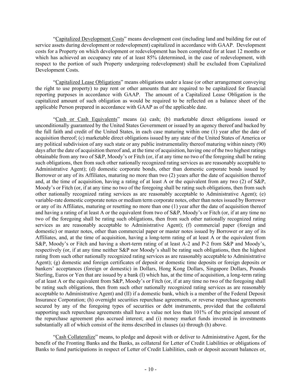 - 10 - “Capitalized Development Costs” means development cost (including land and building for out of service assets during development or redevelopment) capitalized in accordance with GAAP. Development costs for a Property on which development or redevelopment has been completed for at least 12 months or which has achieved an occupancy rate of at least 85% (determined, in the case of redevelopment, with respect to the portion of such Property undergoing redevelopment) shall be excluded from Capitalized Development Costs. “Capitalized Lease Obligations” means obligations under a lease (or other arrangement conveying the right to use property) to pay rent or other amounts that are required to be capitalized for financial reporting purposes in accordance with GAAP. The amount of a Capitalized Lease Obligation is the capitalized amount of such obligation as would be required to be reflected on a balance sheet of the applicable Person prepared in accordance with GAAP as of the applicable date. “Cash or Cash Equivalents” means (a) cash; (b) marketable direct obligations issued or unconditionally guaranteed by the United States Government or issued by an agency thereof and backed by the full faith and credit of the United States, in each case maturing within one (1) year after the date of acquisition thereof; (c) marketable direct obligations issued by any state of the United States of America or any political subdivision of any such state or any public instrumentality thereof maturing within ninety (90) days after the date of acquisition thereof and, at the time of acquisition, having one of the two highest ratings obtainable from any two of S&P, Moody’s or Fitch (or, if at any time no two of the foregoing shall be rating such obligations, then from such other nationally recognized rating services as are reasonably acceptable to Administrative Agent); (d) domestic corporate bonds, other than domestic corporate bonds issued by Borrower or any of its Affiliates, maturing no more than two (2) years after the date of acquisition thereof and, at the time of acquisition, having a rating of at least A or the equivalent from any two (2) of S&P, Moody’s or Fitch (or, if at any time no two of the foregoing shall be rating such obligations, then from such other nationally recognized rating services as are reasonably acceptable to Administrative Agent); (e) variable-rate domestic corporate notes or medium term corporate notes, other than notes issued by Borrower or any of its Affiliates, maturing or resetting no more than one (1) year after the date of acquisition thereof and having a rating of at least A or the equivalent from two of S&P, Moody’s or Fitch (or, if at any time no two of the foregoing shall be rating such obligations, then from such other nationally recognized rating services as are reasonably acceptable to Administrative Agent); (f) commercial paper (foreign and domestic) or master notes, other than commercial paper or master notes issued by Borrower or any of its Affiliates, and, at the time of acquisition, having a long-term rating of at least A or the equivalent from S&P, Moody’s or Fitch and having a short-term rating of at least A-2 and P-2 from S&P and Moody’s, respectively (or, if at any time neither S&P nor Moody’s shall be rating such obligations, then the highest rating from such other nationally recognized rating services as are reasonably acceptable to Administrative Agent); (g) domestic and foreign certificates of deposit or domestic time deposits or foreign deposits or bankers’ acceptances (foreign or domestic) in Dollars, Hong Kong Dollars, Singapore Dollars, Pounds Sterling, Euros or Yen that are issued by a bank (I) which has, at the time of acquisition, a long-term rating of at least A or the equivalent from S&P, Moody’s or Fitch (or, if at any time no two of the foregoing shall be rating such obligations, then from such other nationally recognized rating services as are reasonably acceptable to Administrative Agent) and (II) if a domestic bank, which is a member of the Federal Deposit Insurance Corporation; (h) overnight securities repurchase agreements, or reverse repurchase agreements secured by any of the foregoing types of securities or debt instruments, provided that the collateral supporting such repurchase agreements shall have a value not less than 101% of the principal amount of the repurchase agreement plus accrued interest; and (i) money market funds invested in investments substantially all of which consist of the items described in clauses (a) through (h) above. “Cash Collateralize” means, to pledge and deposit with or deliver to Administrative Agent, for the benefit of the Fronting Banks and the Banks, as collateral for Letter of Credit Liabilities or obligations of Banks to fund participations in respect of Letter of Credit Liabilities, cash or deposit account balances or,