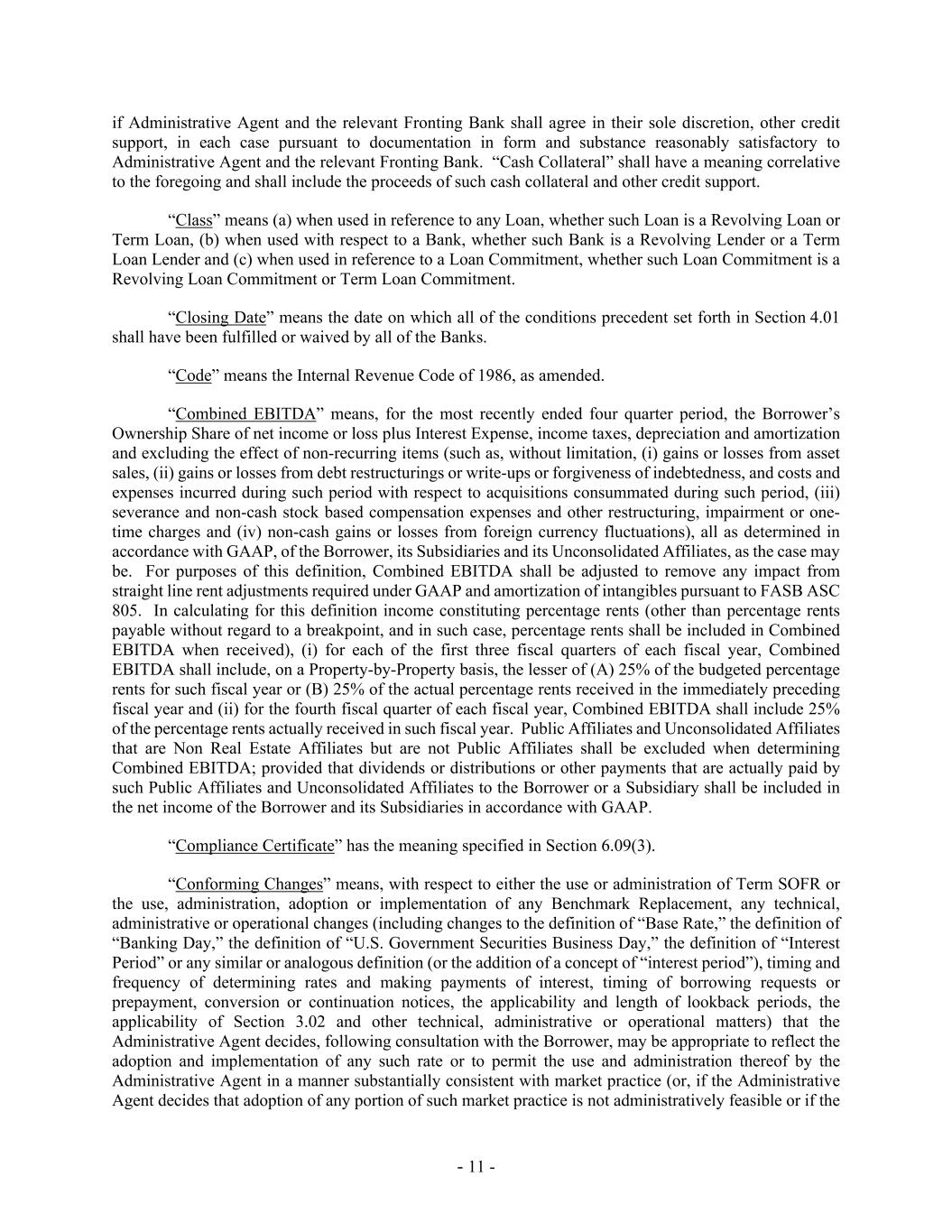 - 11 - if Administrative Agent and the relevant Fronting Bank shall agree in their sole discretion, other credit support, in each case pursuant to documentation in form and substance reasonably satisfactory to Administrative Agent and the relevant Fronting Bank. “Cash Collateral” shall have a meaning correlative to the foregoing and shall include the proceeds of such cash collateral and other credit support. “Class” means (a) when used in reference to any Loan, whether such Loan is a Revolving Loan or Term Loan, (b) when used with respect to a Bank, whether such Bank is a Revolving Lender or a Term Loan Lender and (c) when used in reference to a Loan Commitment, whether such Loan Commitment is a Revolving Loan Commitment or Term Loan Commitment. “Closing Date” means the date on which all of the conditions precedent set forth in Section 4.01 shall have been fulfilled or waived by all of the Banks. “Code” means the Internal Revenue Code of 1986, as amended. “Combined EBITDA” means, for the most recently ended four quarter period, the Borrower’s Ownership Share of net income or loss plus Interest Expense, income taxes, depreciation and amortization and excluding the effect of non-recurring items (such as, without limitation, (i) gains or losses from asset sales, (ii) gains or losses from debt restructurings or write-ups or forgiveness of indebtedness, and costs and expenses incurred during such period with respect to acquisitions consummated during such period, (iii) severance and non-cash stock based compensation expenses and other restructuring, impairment or one- time charges and (iv) non-cash gains or losses from foreign currency fluctuations), all as determined in accordance with GAAP, of the Borrower, its Subsidiaries and its Unconsolidated Affiliates, as the case may be. For purposes of this definition, Combined EBITDA shall be adjusted to remove any impact from straight line rent adjustments required under GAAP and amortization of intangibles pursuant to FASB ASC 805. In calculating for this definition income constituting percentage rents (other than percentage rents payable without regard to a breakpoint, and in such case, percentage rents shall be included in Combined EBITDA when received), (i) for each of the first three fiscal quarters of each fiscal year, Combined EBITDA shall include, on a Property-by-Property basis, the lesser of (A) 25% of the budgeted percentage rents for such fiscal year or (B) 25% of the actual percentage rents received in the immediately preceding fiscal year and (ii) for the fourth fiscal quarter of each fiscal year, Combined EBITDA shall include 25% of the percentage rents actually received in such fiscal year. Public Affiliates and Unconsolidated Affiliates that are Non Real Estate Affiliates but are not Public Affiliates shall be excluded when determining Combined EBITDA; provided that dividends or distributions or other payments that are actually paid by such Public Affiliates and Unconsolidated Affiliates to the Borrower or a Subsidiary shall be included in the net income of the Borrower and its Subsidiaries in accordance with GAAP. “Compliance Certificate” has the meaning specified in Section 6.09(3). “Conforming Changes” means, with respect to either the use or administration of Term SOFR or the use, administration, adoption or implementation of any Benchmark Replacement, any technical, administrative or operational changes (including changes to the definition of “Base Rate,” the definition of “Banking Day,” the definition of “U.S. Government Securities Business Day,” the definition of “Interest Period” or any similar or analogous definition (or the addition of a concept of “interest period”), timing and frequency of determining rates and making payments of interest, timing of borrowing requests or prepayment, conversion or continuation notices, the applicability and length of lookback periods, the applicability of Section 3.02 and other technical, administrative or operational matters) that the Administrative Agent decides, following consultation with the Borrower, may be appropriate to reflect the adoption and implementation of any such rate or to permit the use and administration thereof by the Administrative Agent in a manner substantially consistent with market practice (or, if the Administrative Agent decides that adoption of any portion of such market practice is not administratively feasible or if the