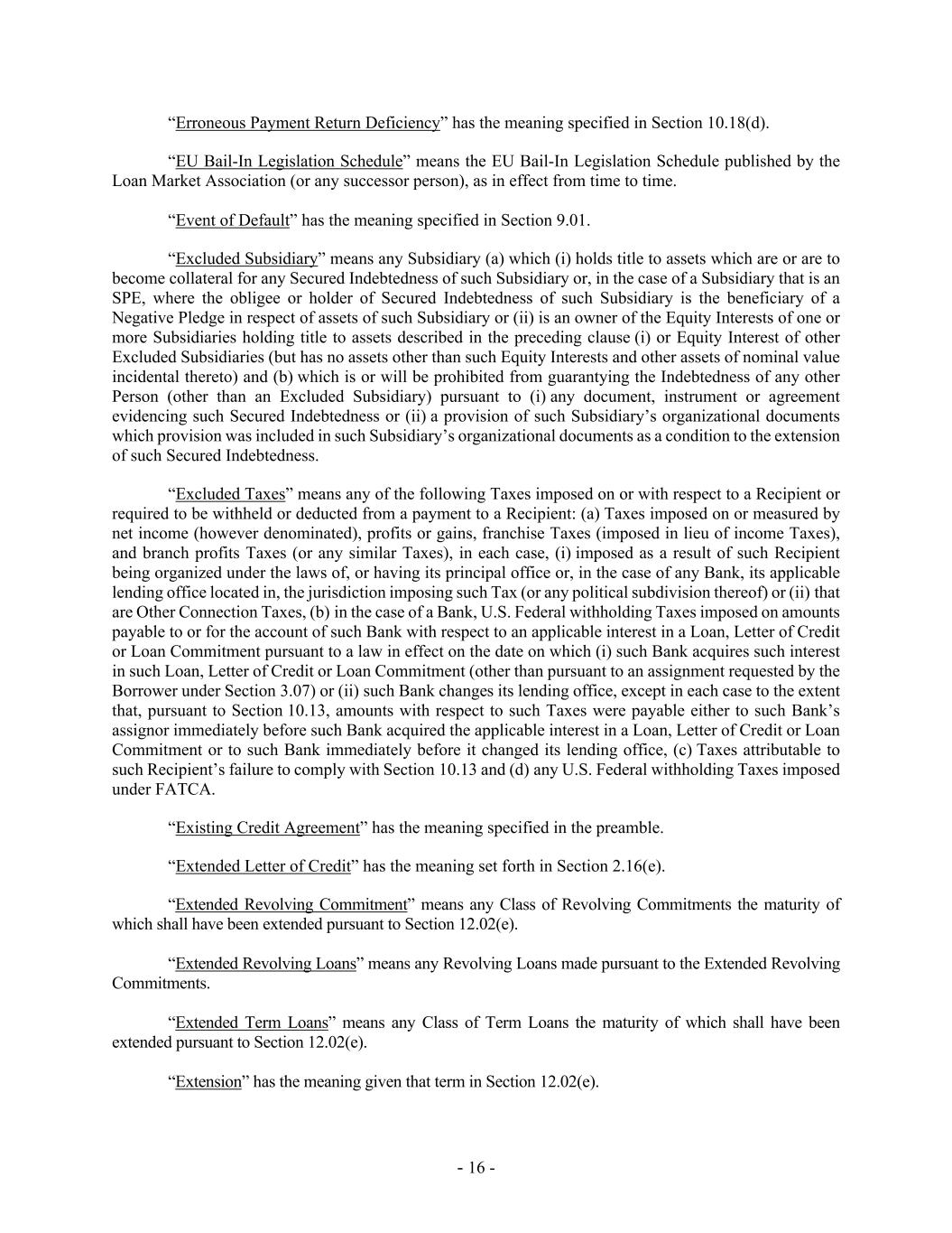 - 16 - “Erroneous Payment Return Deficiency” has the meaning specified in Section 10.18(d). “EU Bail-In Legislation Schedule” means the EU Bail-In Legislation Schedule published by the Loan Market Association (or any successor person), as in effect from time to time. “Event of Default” has the meaning specified in Section 9.01. “Excluded Subsidiary” means any Subsidiary (a) which (i) holds title to assets which are or are to become collateral for any Secured Indebtedness of such Subsidiary or, in the case of a Subsidiary that is an SPE, where the obligee or holder of Secured Indebtedness of such Subsidiary is the beneficiary of a Negative Pledge in respect of assets of such Subsidiary or (ii) is an owner of the Equity Interests of one or more Subsidiaries holding title to assets described in the preceding clause (i) or Equity Interest of other Excluded Subsidiaries (but has no assets other than such Equity Interests and other assets of nominal value incidental thereto) and (b) which is or will be prohibited from guarantying the Indebtedness of any other Person (other than an Excluded Subsidiary) pursuant to (i) any document, instrument or agreement evidencing such Secured Indebtedness or (ii) a provision of such Subsidiary’s organizational documents which provision was included in such Subsidiary’s organizational documents as a condition to the extension of such Secured Indebtedness. “Excluded Taxes” means any of the following Taxes imposed on or with respect to a Recipient or required to be withheld or deducted from a payment to a Recipient: (a) Taxes imposed on or measured by net income (however denominated), profits or gains, franchise Taxes (imposed in lieu of income Taxes), and branch profits Taxes (or any similar Taxes), in each case, (i) imposed as a result of such Recipient being organized under the laws of, or having its principal office or, in the case of any Bank, its applicable lending office located in, the jurisdiction imposing such Tax (or any political subdivision thereof) or (ii) that are Other Connection Taxes, (b) in the case of a Bank, U.S. Federal withholding Taxes imposed on amounts payable to or for the account of such Bank with respect to an applicable interest in a Loan, Letter of Credit or Loan Commitment pursuant to a law in effect on the date on which (i) such Bank acquires such interest in such Loan, Letter of Credit or Loan Commitment (other than pursuant to an assignment requested by the Borrower under Section 3.07) or (ii) such Bank changes its lending office, except in each case to the extent that, pursuant to Section 10.13, amounts with respect to such Taxes were payable either to such Bank’s assignor immediately before such Bank acquired the applicable interest in a Loan, Letter of Credit or Loan Commitment or to such Bank immediately before it changed its lending office, (c) Taxes attributable to such Recipient’s failure to comply with Section 10.13 and (d) any U.S. Federal withholding Taxes imposed under FATCA. “Existing Credit Agreement” has the meaning specified in the preamble. “Extended Letter of Credit” has the meaning set forth in Section 2.16(e). “Extended Revolving Commitment” means any Class of Revolving Commitments the maturity of which shall have been extended pursuant to Section 12.02(e). “Extended Revolving Loans” means any Revolving Loans made pursuant to the Extended Revolving Commitments. “Extended Term Loans” means any Class of Term Loans the maturity of which shall have been extended pursuant to Section 12.02(e). “Extension” has the meaning given that term in Section 12.02(e).
