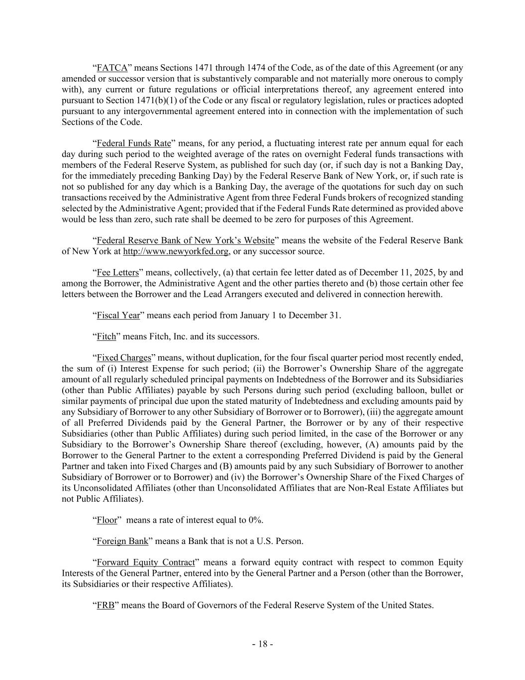 - 18 - “FATCA” means Sections 1471 through 1474 of the Code, as of the date of this Agreement (or any amended or successor version that is substantively comparable and not materially more onerous to comply with), any current or future regulations or official interpretations thereof, any agreement entered into pursuant to Section 1471(b)(1) of the Code or any fiscal or regulatory legislation, rules or practices adopted pursuant to any intergovernmental agreement entered into in connection with the implementation of such Sections of the Code. “Federal Funds Rate” means, for any period, a fluctuating interest rate per annum equal for each day during such period to the weighted average of the rates on overnight Federal funds transactions with members of the Federal Reserve System, as published for such day (or, if such day is not a Banking Day, for the immediately preceding Banking Day) by the Federal Reserve Bank of New York, or, if such rate is not so published for any day which is a Banking Day, the average of the quotations for such day on such transactions received by the Administrative Agent from three Federal Funds brokers of recognized standing selected by the Administrative Agent; provided that if the Federal Funds Rate determined as provided above would be less than zero, such rate shall be deemed to be zero for purposes of this Agreement. “Federal Reserve Bank of New York’s Website” means the website of the Federal Reserve Bank of New York at http://www.newyorkfed.org, or any successor source. “Fee Letters” means, collectively, (a) that certain fee letter dated as of December 11, 2025, by and among the Borrower, the Administrative Agent and the other parties thereto and (b) those certain other fee letters between the Borrower and the Lead Arrangers executed and delivered in connection herewith. “Fiscal Year” means each period from January 1 to December 31. “Fitch” means Fitch, Inc. and its successors. “Fixed Charges” means, without duplication, for the four fiscal quarter period most recently ended, the sum of (i) Interest Expense for such period; (ii) the Borrower’s Ownership Share of the aggregate amount of all regularly scheduled principal payments on Indebtedness of the Borrower and its Subsidiaries (other than Public Affiliates) payable by such Persons during such period (excluding balloon, bullet or similar payments of principal due upon the stated maturity of Indebtedness and excluding amounts paid by any Subsidiary of Borrower to any other Subsidiary of Borrower or to Borrower), (iii) the aggregate amount of all Preferred Dividends paid by the General Partner, the Borrower or by any of their respective Subsidiaries (other than Public Affiliates) during such period limited, in the case of the Borrower or any Subsidiary to the Borrower’s Ownership Share thereof (excluding, however, (A) amounts paid by the Borrower to the General Partner to the extent a corresponding Preferred Dividend is paid by the General Partner and taken into Fixed Charges and (B) amounts paid by any such Subsidiary of Borrower to another Subsidiary of Borrower or to Borrower) and (iv) the Borrower’s Ownership Share of the Fixed Charges of its Unconsolidated Affiliates (other than Unconsolidated Affiliates that are Non-Real Estate Affiliates but not Public Affiliates). “Floor” means a rate of interest equal to 0%. “Foreign Bank” means a Bank that is not a U.S. Person. “Forward Equity Contract” means a forward equity contract with respect to common Equity Interests of the General Partner, entered into by the General Partner and a Person (other than the Borrower, its Subsidiaries or their respective Affiliates). “FRB” means the Board of Governors of the Federal Reserve System of the United States.