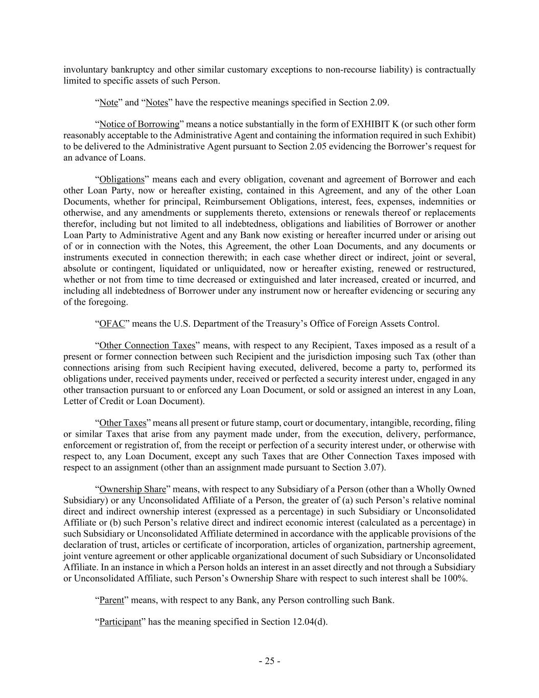 - 25 - involuntary bankruptcy and other similar customary exceptions to non-recourse liability) is contractually limited to specific assets of such Person. “Note” and “Notes” have the respective meanings specified in Section 2.09. “Notice of Borrowing” means a notice substantially in the form of EXHIBIT K (or such other form reasonably acceptable to the Administrative Agent and containing the information required in such Exhibit) to be delivered to the Administrative Agent pursuant to Section 2.05 evidencing the Borrower’s request for an advance of Loans. “Obligations” means each and every obligation, covenant and agreement of Borrower and each other Loan Party, now or hereafter existing, contained in this Agreement, and any of the other Loan Documents, whether for principal, Reimbursement Obligations, interest, fees, expenses, indemnities or otherwise, and any amendments or supplements thereto, extensions or renewals thereof or replacements therefor, including but not limited to all indebtedness, obligations and liabilities of Borrower or another Loan Party to Administrative Agent and any Bank now existing or hereafter incurred under or arising out of or in connection with the Notes, this Agreement, the other Loan Documents, and any documents or instruments executed in connection therewith; in each case whether direct or indirect, joint or several, absolute or contingent, liquidated or unliquidated, now or hereafter existing, renewed or restructured, whether or not from time to time decreased or extinguished and later increased, created or incurred, and including all indebtedness of Borrower under any instrument now or hereafter evidencing or securing any of the foregoing. “OFAC” means the U.S. Department of the Treasury’s Office of Foreign Assets Control. “Other Connection Taxes” means, with respect to any Recipient, Taxes imposed as a result of a present or former connection between such Recipient and the jurisdiction imposing such Tax (other than connections arising from such Recipient having executed, delivered, become a party to, performed its obligations under, received payments under, received or perfected a security interest under, engaged in any other transaction pursuant to or enforced any Loan Document, or sold or assigned an interest in any Loan, Letter of Credit or Loan Document). “Other Taxes” means all present or future stamp, court or documentary, intangible, recording, filing or similar Taxes that arise from any payment made under, from the execution, delivery, performance, enforcement or registration of, from the receipt or perfection of a security interest under, or otherwise with respect to, any Loan Document, except any such Taxes that are Other Connection Taxes imposed with respect to an assignment (other than an assignment made pursuant to Section 3.07). “Ownership Share” means, with respect to any Subsidiary of a Person (other than a Wholly Owned Subsidiary) or any Unconsolidated Affiliate of a Person, the greater of (a) such Person’s relative nominal direct and indirect ownership interest (expressed as a percentage) in such Subsidiary or Unconsolidated Affiliate or (b) such Person’s relative direct and indirect economic interest (calculated as a percentage) in such Subsidiary or Unconsolidated Affiliate determined in accordance with the applicable provisions of the declaration of trust, articles or certificate of incorporation, articles of organization, partnership agreement, joint venture agreement or other applicable organizational document of such Subsidiary or Unconsolidated Affiliate. In an instance in which a Person holds an interest in an asset directly and not through a Subsidiary or Unconsolidated Affiliate, such Person’s Ownership Share with respect to such interest shall be 100%. “Parent” means, with respect to any Bank, any Person controlling such Bank. “Participant” has the meaning specified in Section 12.04(d).