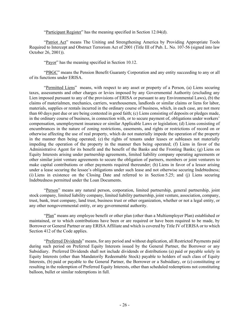 - 26 - “Participant Register” has the meaning specified in Section 12.04(d). “Patriot Act” means The Uniting and Strengthening America by Providing Appropriate Tools Required to Intercept and Obstruct Terrorism Act of 2001 (Title III of Pub. L. No. 107-56 (signed into law October 26, 2001)). “Payor” has the meaning specified in Section 10.12. “PBGC” means the Pension Benefit Guaranty Corporation and any entity succeeding to any or all of its functions under ERISA. “Permitted Liens” means, with respect to any asset or property of a Person, (a) Liens securing taxes, assessments and other charges or levies imposed by any Governmental Authority (excluding any Lien imposed pursuant to any of the provisions of ERISA or pursuant to any Environmental Laws), (b) the claims of materialmen, mechanics, carriers, warehousemen, landlords or similar claims or liens for labor, materials, supplies or rentals incurred in the ordinary course of business, which, in each case, are not more than 60 days past due or are being contested in good faith; (c) Liens consisting of deposits or pledges made, in the ordinary course of business, in connection with, or to secure payment of, obligations under workers’ compensation, unemployment insurance or similar Applicable Laws or legislation; (d) Liens consisting of encumbrances in the nature of zoning restrictions, easements, and rights or restrictions of record on or otherwise affecting the use of real property, which do not materially impede the operation of the property in the manner then being operated; (e) the rights of tenants under leases or subleases not materially impeding the operation of the property in the manner then being operated; (f) Liens in favor of the Administrative Agent for its benefit and the benefit of the Banks and the Fronting Banks; (g) Liens on Equity Interests arising under partnership agreements, limited liability company operating agreements or other similar joint venture agreements to secure the obligation of partners, members or joint venturers to make capital contributions or other payments required thereunder; (h) Liens in favor of a lessor arising under a lease securing the lessee’s obligations under such lease and not otherwise securing Indebtedness; (i) Liens in existence on the Closing Date and referred to in Section 5.25; and (j) Liens securing Indebtedness permitted under the Loan Documents. “Person” means any natural person, corporation, limited partnership, general partnership, joint stock company, limited liability company, limited liability partnership, joint venture, association, company, trust, bank, trust company, land trust, business trust or other organization, whether or not a legal entity, or any other nongovernmental entity, or any governmental authority. “Plan” means any employee benefit or other plan (other than a Multiemployer Plan) established or maintained, or to which contributions have been or are required or have been required to be made, by Borrower or General Partner or any ERISA Affiliate and which is covered by Title IV of ERISA or to which Section 412 of the Code applies. “Preferred Dividends” means, for any period and without duplication, all Restricted Payments paid during such period on Preferred Equity Interests issued by the General Partner, the Borrower or any Subsidiary. Preferred Dividends shall not include dividends or distributions (a) paid or payable solely in Equity Interests (other than Mandatorily Redeemable Stock) payable to holders of such class of Equity Interests, (b) paid or payable to the General Partner, the Borrower or a Subsidiary, or (c) constituting or resulting in the redemption of Preferred Equity Interests, other than scheduled redemptions not constituting balloon, bullet or similar redemptions in full.