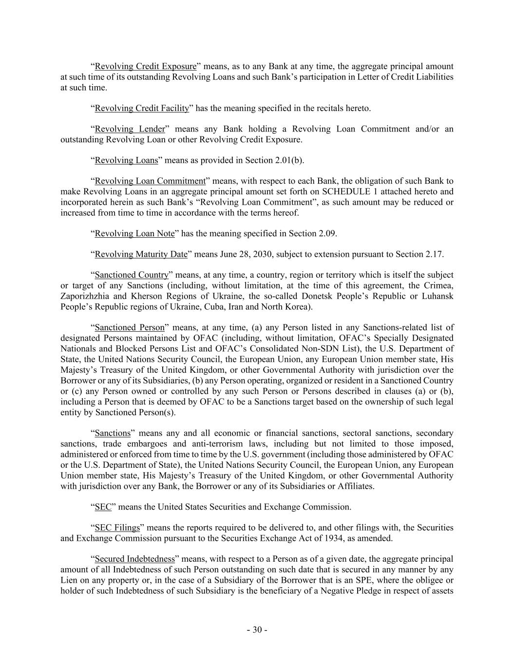 - 30 - “Revolving Credit Exposure” means, as to any Bank at any time, the aggregate principal amount at such time of its outstanding Revolving Loans and such Bank’s participation in Letter of Credit Liabilities at such time. “Revolving Credit Facility” has the meaning specified in the recitals hereto. “Revolving Lender” means any Bank holding a Revolving Loan Commitment and/or an outstanding Revolving Loan or other Revolving Credit Exposure. “Revolving Loans” means as provided in Section 2.01(b). “Revolving Loan Commitment” means, with respect to each Bank, the obligation of such Bank to make Revolving Loans in an aggregate principal amount set forth on SCHEDULE 1 attached hereto and incorporated herein as such Bank’s “Revolving Loan Commitment”, as such amount may be reduced or increased from time to time in accordance with the terms hereof. “Revolving Loan Note” has the meaning specified in Section 2.09. “Revolving Maturity Date” means June 28, 2030, subject to extension pursuant to Section 2.17. “Sanctioned Country” means, at any time, a country, region or territory which is itself the subject or target of any Sanctions (including, without limitation, at the time of this agreement, the Crimea, Zaporizhzhia and Kherson Regions of Ukraine, the so-called Donetsk People’s Republic or Luhansk People’s Republic regions of Ukraine, Cuba, Iran and North Korea). “Sanctioned Person” means, at any time, (a) any Person listed in any Sanctions-related list of designated Persons maintained by OFAC (including, without limitation, OFAC’s Specially Designated Nationals and Blocked Persons List and OFAC’s Consolidated Non-SDN List), the U.S. Department of State, the United Nations Security Council, the European Union, any European Union member state, His Majesty’s Treasury of the United Kingdom, or other Governmental Authority with jurisdiction over the Borrower or any of its Subsidiaries, (b) any Person operating, organized or resident in a Sanctioned Country or (c) any Person owned or controlled by any such Person or Persons described in clauses (a) or (b), including a Person that is deemed by OFAC to be a Sanctions target based on the ownership of such legal entity by Sanctioned Person(s). “Sanctions” means any and all economic or financial sanctions, sectoral sanctions, secondary sanctions, trade embargoes and anti-terrorism laws, including but not limited to those imposed, administered or enforced from time to time by the U.S. government (including those administered by OFAC or the U.S. Department of State), the United Nations Security Council, the European Union, any European Union member state, His Majesty’s Treasury of the United Kingdom, or other Governmental Authority with jurisdiction over any Bank, the Borrower or any of its Subsidiaries or Affiliates. “SEC” means the United States Securities and Exchange Commission. “SEC Filings” means the reports required to be delivered to, and other filings with, the Securities and Exchange Commission pursuant to the Securities Exchange Act of 1934, as amended. “Secured Indebtedness” means, with respect to a Person as of a given date, the aggregate principal amount of all Indebtedness of such Person outstanding on such date that is secured in any manner by any Lien on any property or, in the case of a Subsidiary of the Borrower that is an SPE, where the obligee or holder of such Indebtedness of such Subsidiary is the beneficiary of a Negative Pledge in respect of assets