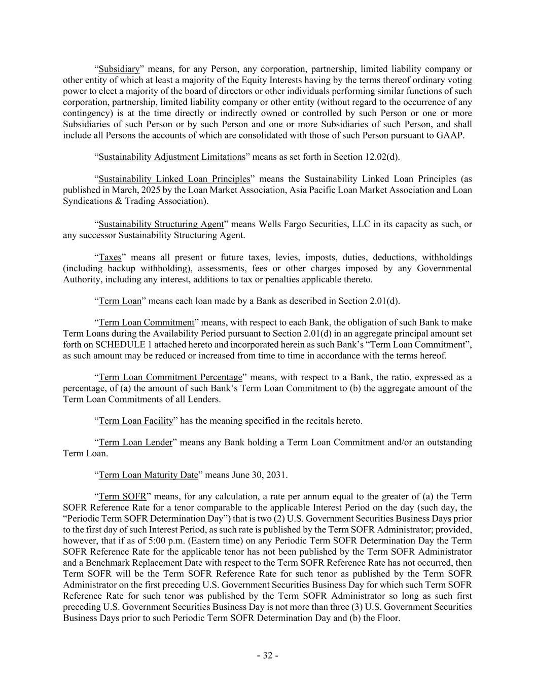 - 32 - “Subsidiary” means, for any Person, any corporation, partnership, limited liability company or other entity of which at least a majority of the Equity Interests having by the terms thereof ordinary voting power to elect a majority of the board of directors or other individuals performing similar functions of such corporation, partnership, limited liability company or other entity (without regard to the occurrence of any contingency) is at the time directly or indirectly owned or controlled by such Person or one or more Subsidiaries of such Person or by such Person and one or more Subsidiaries of such Person, and shall include all Persons the accounts of which are consolidated with those of such Person pursuant to GAAP. “Sustainability Adjustment Limitations” means as set forth in Section 12.02(d). “Sustainability Linked Loan Principles” means the Sustainability Linked Loan Principles (as published in March, 2025 by the Loan Market Association, Asia Pacific Loan Market Association and Loan Syndications & Trading Association). “Sustainability Structuring Agent” means Wells Fargo Securities, LLC in its capacity as such, or any successor Sustainability Structuring Agent. “Taxes” means all present or future taxes, levies, imposts, duties, deductions, withholdings (including backup withholding), assessments, fees or other charges imposed by any Governmental Authority, including any interest, additions to tax or penalties applicable thereto. “Term Loan” means each loan made by a Bank as described in Section 2.01(d). “Term Loan Commitment” means, with respect to each Bank, the obligation of such Bank to make Term Loans during the Availability Period pursuant to Section 2.01(d) in an aggregate principal amount set forth on SCHEDULE 1 attached hereto and incorporated herein as such Bank’s “Term Loan Commitment”, as such amount may be reduced or increased from time to time in accordance with the terms hereof. “Term Loan Commitment Percentage” means, with respect to a Bank, the ratio, expressed as a percentage, of (a) the amount of such Bank’s Term Loan Commitment to (b) the aggregate amount of the Term Loan Commitments of all Lenders. “Term Loan Facility” has the meaning specified in the recitals hereto. “Term Loan Lender” means any Bank holding a Term Loan Commitment and/or an outstanding Term Loan. “Term Loan Maturity Date” means June 30, 2031. “Term SOFR” means, for any calculation, a rate per annum equal to the greater of (a) the Term SOFR Reference Rate for a tenor comparable to the applicable Interest Period on the day (such day, the “Periodic Term SOFR Determination Day”) that is two (2) U.S. Government Securities Business Days prior to the first day of such Interest Period, as such rate is published by the Term SOFR Administrator; provided, however, that if as of 5:00 p.m. (Eastern time) on any Periodic Term SOFR Determination Day the Term SOFR Reference Rate for the applicable tenor has not been published by the Term SOFR Administrator and a Benchmark Replacement Date with respect to the Term SOFR Reference Rate has not occurred, then Term SOFR will be the Term SOFR Reference Rate for such tenor as published by the Term SOFR Administrator on the first preceding U.S. Government Securities Business Day for which such Term SOFR Reference Rate for such tenor was published by the Term SOFR Administrator so long as such first preceding U.S. Government Securities Business Day is not more than three (3) U.S. Government Securities Business Days prior to such Periodic Term SOFR Determination Day and (b) the Floor.