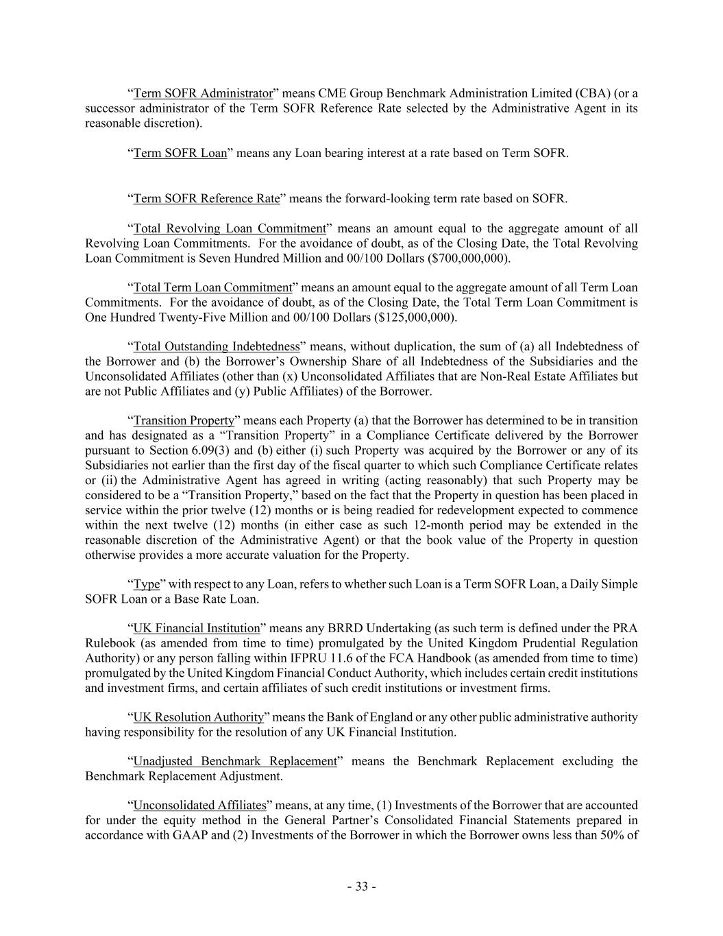 - 33 - “Term SOFR Administrator” means CME Group Benchmark Administration Limited (CBA) (or a successor administrator of the Term SOFR Reference Rate selected by the Administrative Agent in its reasonable discretion). “Term SOFR Loan” means any Loan bearing interest at a rate based on Term SOFR. “Term SOFR Reference Rate” means the forward-looking term rate based on SOFR. “Total Revolving Loan Commitment” means an amount equal to the aggregate amount of all Revolving Loan Commitments. For the avoidance of doubt, as of the Closing Date, the Total Revolving Loan Commitment is Seven Hundred Million and 00/100 Dollars ($700,000,000). “Total Term Loan Commitment” means an amount equal to the aggregate amount of all Term Loan Commitments. For the avoidance of doubt, as of the Closing Date, the Total Term Loan Commitment is One Hundred Twenty-Five Million and 00/100 Dollars ($125,000,000). “Total Outstanding Indebtedness” means, without duplication, the sum of (a) all Indebtedness of the Borrower and (b) the Borrower’s Ownership Share of all Indebtedness of the Subsidiaries and the Unconsolidated Affiliates (other than (x) Unconsolidated Affiliates that are Non-Real Estate Affiliates but are not Public Affiliates and (y) Public Affiliates) of the Borrower. “Transition Property” means each Property (a) that the Borrower has determined to be in transition and has designated as a “Transition Property” in a Compliance Certificate delivered by the Borrower pursuant to Section 6.09(3) and (b) either (i) such Property was acquired by the Borrower or any of its Subsidiaries not earlier than the first day of the fiscal quarter to which such Compliance Certificate relates or (ii) the Administrative Agent has agreed in writing (acting reasonably) that such Property may be considered to be a “Transition Property,” based on the fact that the Property in question has been placed in service within the prior twelve (12) months or is being readied for redevelopment expected to commence within the next twelve (12) months (in either case as such 12-month period may be extended in the reasonable discretion of the Administrative Agent) or that the book value of the Property in question otherwise provides a more accurate valuation for the Property. “Type” with respect to any Loan, refers to whether such Loan is a Term SOFR Loan, a Daily Simple SOFR Loan or a Base Rate Loan. “UK Financial Institution” means any BRRD Undertaking (as such term is defined under the PRA Rulebook (as amended from time to time) promulgated by the United Kingdom Prudential Regulation Authority) or any person falling within IFPRU 11.6 of the FCA Handbook (as amended from time to time) promulgated by the United Kingdom Financial Conduct Authority, which includes certain credit institutions and investment firms, and certain affiliates of such credit institutions or investment firms. “UK Resolution Authority” means the Bank of England or any other public administrative authority having responsibility for the resolution of any UK Financial Institution. “Unadjusted Benchmark Replacement” means the Benchmark Replacement excluding the Benchmark Replacement Adjustment. “Unconsolidated Affiliates” means, at any time, (1) Investments of the Borrower that are accounted for under the equity method in the General Partner’s Consolidated Financial Statements prepared in accordance with GAAP and (2) Investments of the Borrower in which the Borrower owns less than 50% of