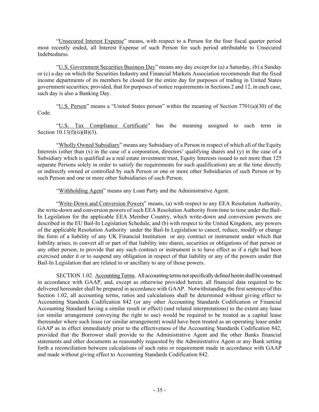 - 35 - “Unsecured Interest Expense” means, with respect to a Person for the four fiscal quarter period most recently ended, all Interest Expense of such Person for such period attributable to Unsecured Indebtedness. “U.S. Government Securities Business Day” means any day except for (a) a Saturday, (b) a Sunday or (c) a day on which the Securities Industry and Financial Markets Association recommends that the fixed income departments of its members be closed for the entire day for purposes of trading in United States government securities; provided, that for purposes of notice requirements in Sections 2 and 12, in each case, such day is also a Banking Day. “U.S. Person” means a “United States person” within the meaning of Section 7701(a)(30) of the Code. “U.S. Tax Compliance Certificate” has the meaning assigned to such term in Section 10.13(f)(ii)(B)(3). “Wholly Owned Subsidiary” means any Subsidiary of a Person in respect of which all of the Equity Interests (other than (x) in the case of a corporation, directors’ qualifying shares and (y) in the case of a Subsidiary which is qualified as a real estate investment trust, Equity Interests issued to not more than 125 separate Persons solely in order to satisfy the requirements for such qualification) are at the time directly or indirectly owned or controlled by such Person or one or more other Subsidiaries of such Person or by such Person and one or more other Subsidiaries of such Person. “Withholding Agent” means any Loan Party and the Administrative Agent. “Write-Down and Conversion Powers” means, (a) with respect to any EEA Resolution Authority, the write-down and conversion powers of such EEA Resolution Authority from time to time under the Bail- In Legislation for the applicable EEA Member Country, which write-down and conversion powers are described in the EU Bail-In Legislation Schedule, and (b) with respect to the United Kingdom, any powers of the applicable Resolution Authority under the Bail-In Legislation to cancel, reduce, modify or change the form of a liability of any UK Financial Institution or any contract or instrument under which that liability arises, to convert all or part of that liability into shares, securities or obligations of that person or any other person, to provide that any such contract or instrument is to have effect as if a right had been exercised under it or to suspend any obligation in respect of that liability or any of the powers under that Bail-In Legislation that are related to or ancillary to any of those powers. SECTION 1.02. Accounting Terms. All accounting terms not specifically defined herein shall be construed in accordance with GAAP, and, except as otherwise provided herein, all financial data required to be delivered hereunder shall be prepared in accordance with GAAP. Notwithstanding the first sentence of this Section 1.02, all accounting terms, ratios and calculations shall be determined without giving effect to Accounting Standards Codification 842 (or any other Accounting Standards Codification or Financial Accounting Standard having a similar result or effect) (and related interpretations) to the extent any lease (or similar arrangement conveying the right to use) would be required to be treated as a capital lease thereunder where such lease (or similar arrangement) would have been treated as an operating lease under GAAP as in effect immediately prior to the effectiveness of the Accounting Standards Codification 842, provided that the Borrower shall provide to the Administrative Agent and the other Banks financial statements and other documents as reasonably requested by the Administrative Agent or any Bank setting forth a reconciliation between calculations of such ratio or requirement made in accordance with GAAP and made without giving effect to Accounting Standards Codification 842.