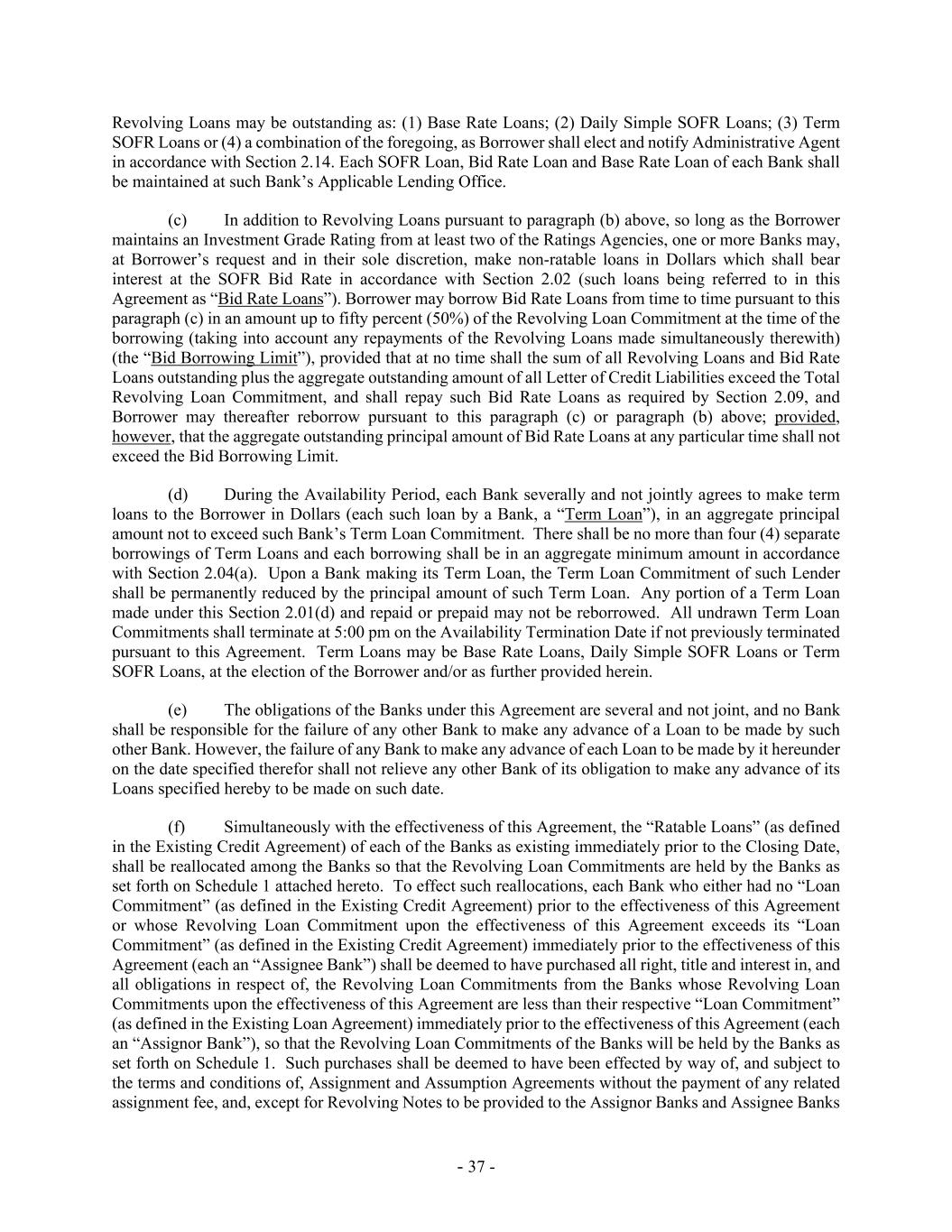 - 37 - Revolving Loans may be outstanding as: (1) Base Rate Loans; (2) Daily Simple SOFR Loans; (3) Term SOFR Loans or (4) a combination of the foregoing, as Borrower shall elect and notify Administrative Agent in accordance with Section 2.14. Each SOFR Loan, Bid Rate Loan and Base Rate Loan of each Bank shall be maintained at such Bank’s Applicable Lending Office. (c) In addition to Revolving Loans pursuant to paragraph (b) above, so long as the Borrower maintains an Investment Grade Rating from at least two of the Ratings Agencies, one or more Banks may, at Borrower’s request and in their sole discretion, make non-ratable loans in Dollars which shall bear interest at the SOFR Bid Rate in accordance with Section 2.02 (such loans being referred to in this Agreement as “Bid Rate Loans”). Borrower may borrow Bid Rate Loans from time to time pursuant to this paragraph (c) in an amount up to fifty percent (50%) of the Revolving Loan Commitment at the time of the borrowing (taking into account any repayments of the Revolving Loans made simultaneously therewith) (the “Bid Borrowing Limit”), provided that at no time shall the sum of all Revolving Loans and Bid Rate Loans outstanding plus the aggregate outstanding amount of all Letter of Credit Liabilities exceed the Total Revolving Loan Commitment, and shall repay such Bid Rate Loans as required by Section 2.09, and Borrower may thereafter reborrow pursuant to this paragraph (c) or paragraph (b) above; provided, however, that the aggregate outstanding principal amount of Bid Rate Loans at any particular time shall not exceed the Bid Borrowing Limit. (d) During the Availability Period, each Bank severally and not jointly agrees to make term loans to the Borrower in Dollars (each such loan by a Bank, a “Term Loan”), in an aggregate principal amount not to exceed such Bank’s Term Loan Commitment. There shall be no more than four (4) separate borrowings of Term Loans and each borrowing shall be in an aggregate minimum amount in accordance with Section 2.04(a). Upon a Bank making its Term Loan, the Term Loan Commitment of such Lender shall be permanently reduced by the principal amount of such Term Loan. Any portion of a Term Loan made under this Section 2.01(d) and repaid or prepaid may not be reborrowed. All undrawn Term Loan Commitments shall terminate at 5:00 pm on the Availability Termination Date if not previously terminated pursuant to this Agreement. Term Loans may be Base Rate Loans, Daily Simple SOFR Loans or Term SOFR Loans, at the election of the Borrower and/or as further provided herein. (e) The obligations of the Banks under this Agreement are several and not joint, and no Bank shall be responsible for the failure of any other Bank to make any advance of a Loan to be made by such other Bank. However, the failure of any Bank to make any advance of each Loan to be made by it hereunder on the date specified therefor shall not relieve any other Bank of its obligation to make any advance of its Loans specified hereby to be made on such date. (f) Simultaneously with the effectiveness of this Agreement, the “Ratable Loans” (as defined in the Existing Credit Agreement) of each of the Banks as existing immediately prior to the Closing Date, shall be reallocated among the Banks so that the Revolving Loan Commitments are held by the Banks as set forth on Schedule 1 attached hereto. To effect such reallocations, each Bank who either had no “Loan Commitment” (as defined in the Existing Credit Agreement) prior to the effectiveness of this Agreement or whose Revolving Loan Commitment upon the effectiveness of this Agreement exceeds its “Loan Commitment” (as defined in the Existing Credit Agreement) immediately prior to the effectiveness of this Agreement (each an “Assignee Bank”) shall be deemed to have purchased all right, title and interest in, and all obligations in respect of, the Revolving Loan Commitments from the Banks whose Revolving Loan Commitments upon the effectiveness of this Agreement are less than their respective “Loan Commitment” (as defined in the Existing Loan Agreement) immediately prior to the effectiveness of this Agreement (each an “Assignor Bank”), so that the Revolving Loan Commitments of the Banks will be held by the Banks as set forth on Schedule 1. Such purchases shall be deemed to have been effected by way of, and subject to the terms and conditions of, Assignment and Assumption Agreements without the payment of any related assignment fee, and, except for Revolving Notes to be provided to the Assignor Banks and Assignee Banks