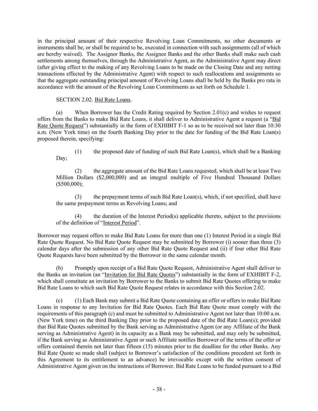 - 38 - in the principal amount of their respective Revolving Loan Commitments, no other documents or instruments shall be, or shall be required to be, executed in connection with such assignments (all of which are hereby waived). The Assignor Banks, the Assignee Banks and the other Banks shall make such cash settlements among themselves, through the Administrative Agent, as the Administrative Agent may direct (after giving effect to the making of any Revolving Loans to be made on the Closing Date and any netting transactions effected by the Administrative Agent) with respect to such reallocations and assignments so that the aggregate outstanding principal amount of Revolving Loans shall be held by the Banks pro rata in accordance with the amount of the Revolving Loan Commitments as set forth on Schedule 1. SECTION 2.02. Bid Rate Loans. (a) When Borrower has the Credit Rating required by Section 2.01(c) and wishes to request offers from the Banks to make Bid Rate Loans, it shall deliver to Administrative Agent a request (a “Bid Rate Quote Request”) substantially in the form of EXHIBIT F-1 so as to be received not later than 10:30 a.m. (New York time) on the fourth Banking Day prior to the date for funding of the Bid Rate Loan(s) proposed therein, specifying: (1) the proposed date of funding of such Bid Rate Loan(s), which shall be a Banking Day; (2) the aggregate amount of the Bid Rate Loans requested, which shall be at least Two Million Dollars ($2,000,000) and an integral multiple of Five Hundred Thousand Dollars ($500,000); (3) the prepayment terms of such Bid Rate Loan(s), which, if not specified, shall have the same prepayment terms as Revolving Loans; and (4) the duration of the Interest Period(s) applicable thereto, subject to the provisions of the definition of “Interest Period”. Borrower may request offers to make Bid Rate Loans for more than one (1) Interest Period in a single Bid Rate Quote Request. No Bid Rate Quote Request may be submitted by Borrower (i) sooner than three (3) calendar days after the submission of any other Bid Rate Quote Request and (ii) if four other Bid Rate Quote Requests have been submitted by the Borrower in the same calendar month. (b) Promptly upon receipt of a Bid Rate Quote Request, Administrative Agent shall deliver to the Banks an invitation (an “Invitation for Bid Rate Quotes”) substantially in the form of EXHIBIT F-2, which shall constitute an invitation by Borrower to the Banks to submit Bid Rate Quotes offering to make Bid Rate Loans to which such Bid Rate Quote Request relates in accordance with this Section 2.02. (c) (1) Each Bank may submit a Bid Rate Quote containing an offer or offers to make Bid Rate Loans in response to any Invitation for Bid Rate Quotes. Each Bid Rate Quote must comply with the requirements of this paragraph (c) and must be submitted to Administrative Agent not later than 10:00 a.m. (New York time) on the third Banking Day prior to the proposed date of the Bid Rate Loan(s); provided that Bid Rate Quotes submitted by the Bank serving as Administrative Agent (or any Affiliate of the Bank serving as Administrative Agent) in its capacity as a Bank may be submitted, and may only be submitted, if the Bank serving as Administrative Agent or such Affiliate notifies Borrower of the terms of the offer or offers contained therein not later than fifteen (15) minutes prior to the deadline for the other Banks. Any Bid Rate Quote so made shall (subject to Borrower’s satisfaction of the conditions precedent set forth in this Agreement to its entitlement to an advance) be irrevocable except with the written consent of Administrative Agent given on the instructions of Borrower. Bid Rate Loans to be funded pursuant to a Bid