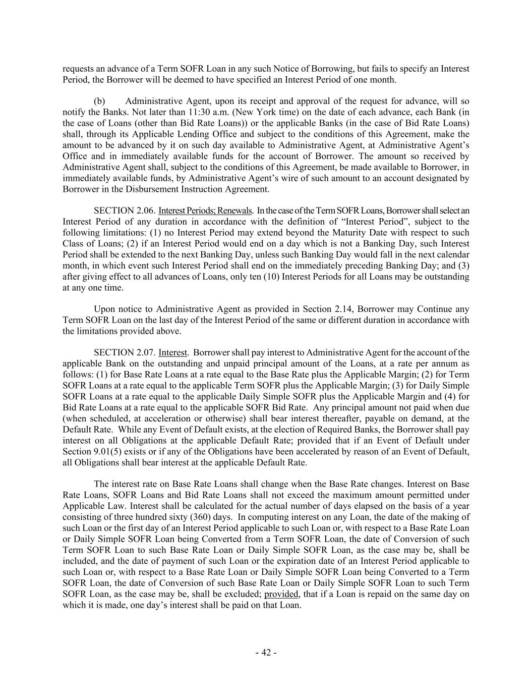 - 42 - requests an advance of a Term SOFR Loan in any such Notice of Borrowing, but fails to specify an Interest Period, the Borrower will be deemed to have specified an Interest Period of one month. (b) Administrative Agent, upon its receipt and approval of the request for advance, will so notify the Banks. Not later than 11:30 a.m. (New York time) on the date of each advance, each Bank (in the case of Loans (other than Bid Rate Loans)) or the applicable Banks (in the case of Bid Rate Loans) shall, through its Applicable Lending Office and subject to the conditions of this Agreement, make the amount to be advanced by it on such day available to Administrative Agent, at Administrative Agent’s Office and in immediately available funds for the account of Borrower. The amount so received by Administrative Agent shall, subject to the conditions of this Agreement, be made available to Borrower, in immediately available funds, by Administrative Agent’s wire of such amount to an account designated by Borrower in the Disbursement Instruction Agreement. SECTION 2.06. Interest Periods; Renewals. In the case of the Term SOFR Loans, Borrower shall select an Interest Period of any duration in accordance with the definition of “Interest Period”, subject to the following limitations: (1) no Interest Period may extend beyond the Maturity Date with respect to such Class of Loans; (2) if an Interest Period would end on a day which is not a Banking Day, such Interest Period shall be extended to the next Banking Day, unless such Banking Day would fall in the next calendar month, in which event such Interest Period shall end on the immediately preceding Banking Day; and (3) after giving effect to all advances of Loans, only ten (10) Interest Periods for all Loans may be outstanding at any one time. Upon notice to Administrative Agent as provided in Section 2.14, Borrower may Continue any Term SOFR Loan on the last day of the Interest Period of the same or different duration in accordance with the limitations provided above. SECTION 2.07. Interest. Borrower shall pay interest to Administrative Agent for the account of the applicable Bank on the outstanding and unpaid principal amount of the Loans, at a rate per annum as follows: (1) for Base Rate Loans at a rate equal to the Base Rate plus the Applicable Margin; (2) for Term SOFR Loans at a rate equal to the applicable Term SOFR plus the Applicable Margin; (3) for Daily Simple SOFR Loans at a rate equal to the applicable Daily Simple SOFR plus the Applicable Margin and (4) for Bid Rate Loans at a rate equal to the applicable SOFR Bid Rate. Any principal amount not paid when due (when scheduled, at acceleration or otherwise) shall bear interest thereafter, payable on demand, at the Default Rate. While any Event of Default exists, at the election of Required Banks, the Borrower shall pay interest on all Obligations at the applicable Default Rate; provided that if an Event of Default under Section 9.01(5) exists or if any of the Obligations have been accelerated by reason of an Event of Default, all Obligations shall bear interest at the applicable Default Rate. The interest rate on Base Rate Loans shall change when the Base Rate changes. Interest on Base Rate Loans, SOFR Loans and Bid Rate Loans shall not exceed the maximum amount permitted under Applicable Law. Interest shall be calculated for the actual number of days elapsed on the basis of a year consisting of three hundred sixty (360) days. In computing interest on any Loan, the date of the making of such Loan or the first day of an Interest Period applicable to such Loan or, with respect to a Base Rate Loan or Daily Simple SOFR Loan being Converted from a Term SOFR Loan, the date of Conversion of such Term SOFR Loan to such Base Rate Loan or Daily Simple SOFR Loan, as the case may be, shall be included, and the date of payment of such Loan or the expiration date of an Interest Period applicable to such Loan or, with respect to a Base Rate Loan or Daily Simple SOFR Loan being Converted to a Term SOFR Loan, the date of Conversion of such Base Rate Loan or Daily Simple SOFR Loan to such Term SOFR Loan, as the case may be, shall be excluded; provided, that if a Loan is repaid on the same day on which it is made, one day’s interest shall be paid on that Loan.