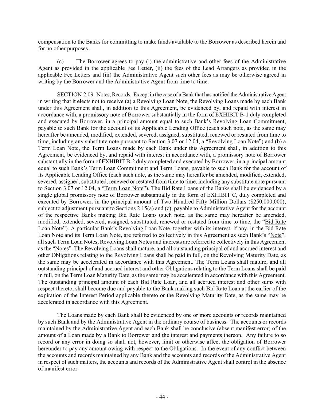 - 44 - compensation to the Banks for committing to make funds available to the Borrower as described herein and for no other purposes. (c) The Borrower agrees to pay (i) the administrative and other fees of the Administrative Agent as provided in the applicable Fee Letter, (ii) the fees of the Lead Arrangers as provided in the applicable Fee Letters and (iii) the Administrative Agent such other fees as may be otherwise agreed in writing by the Borrower and the Administrative Agent from time to time. SECTION 2.09. Notes; Records. Except in the case of a Bank that has notified the Administrative Agent in writing that it elects not to receive (a) a Revolving Loan Note, the Revolving Loans made by each Bank under this Agreement shall, in addition to this Agreement, be evidenced by, and repaid with interest in accordance with, a promissory note of Borrower substantially in the form of EXHIBIT B-1 duly completed and executed by Borrower, in a principal amount equal to such Bank’s Revolving Loan Commitment, payable to such Bank for the account of its Applicable Lending Office (each such note, as the same may hereafter be amended, modified, extended, severed, assigned, substituted, renewed or restated from time to time, including any substitute note pursuant to Section 3.07 or 12.04, a “Revolving Loan Note”) and (b) a Term Loan Note, the Term Loans made by each Bank under this Agreement shall, in addition to this Agreement, be evidenced by, and repaid with interest in accordance with, a promissory note of Borrower substantially in the form of EXHIBIT B-2 duly completed and executed by Borrower, in a principal amount equal to such Bank’s Term Loan Commitment and Term Loans, payable to such Bank for the account of its Applicable Lending Office (each such note, as the same may hereafter be amended, modified, extended, severed, assigned, substituted, renewed or restated from time to time, including any substitute note pursuant to Section 3.07 or 12.04, a “Term Loan Note”). The Bid Rate Loans of the Banks shall be evidenced by a single global promissory note of Borrower substantially in the form of EXHIBIT C, duly completed and executed by Borrower, in the principal amount of Two Hundred Fifty Million Dollars ($250,000,000), subject to adjustment pursuant to Sections 2.15(a) and (c), payable to Administrative Agent for the account of the respective Banks making Bid Rate Loans (such note, as the same may hereafter be amended, modified, extended, severed, assigned, substituted, renewed or restated from time to time, the “Bid Rate Loan Note”). A particular Bank’s Revolving Loan Note, together with its interest, if any, in the Bid Rate Loan Note and its Term Loan Note, are referred to collectively in this Agreement as such Bank’s “Note”; all such Term Loan Notes, Revolving Loan Notes and interests are referred to collectively in this Agreement as the “Notes”. The Revolving Loans shall mature, and all outstanding principal of and accrued interest and other Obligations relating to the Revolving Loans shall be paid in full, on the Revolving Maturity Date, as the same may be accelerated in accordance with this Agreement. The Term Loans shall mature, and all outstanding principal of and accrued interest and other Obligations relating to the Term Loans shall be paid in full, on the Term Loan Maturity Date, as the same may be accelerated in accordance with this Agreement. The outstanding principal amount of each Bid Rate Loan, and all accrued interest and other sums with respect thereto, shall become due and payable to the Bank making such Bid Rate Loan at the earlier of the expiration of the Interest Period applicable thereto or the Revolving Maturity Date, as the same may be accelerated in accordance with this Agreement. The Loans made by each Bank shall be evidenced by one or more accounts or records maintained by such Bank and by the Administrative Agent in the ordinary course of business. The accounts or records maintained by the Administrative Agent and each Bank shall be conclusive (absent manifest error) of the amount of a Loan made by a Bank to Borrower and the interest and payments thereon. Any failure to so record or any error in doing so shall not, however, limit or otherwise affect the obligation of Borrower hereunder to pay any amount owing with respect to the Obligations. In the event of any conflict between the accounts and records maintained by any Bank and the accounts and records of the Administrative Agent in respect of such matters, the accounts and records of the Administrative Agent shall control in the absence of manifest error.