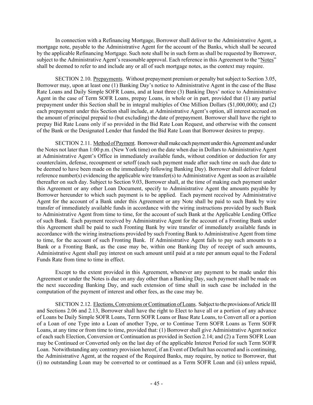 - 45 - In connection with a Refinancing Mortgage, Borrower shall deliver to the Administrative Agent, a mortgage note, payable to the Administrative Agent for the account of the Banks, which shall be secured by the applicable Refinancing Mortgage. Such note shall be in such form as shall be requested by Borrower, subject to the Administrative Agent’s reasonable approval. Each reference in this Agreement to the “Notes” shall be deemed to refer to and include any or all of such mortgage notes, as the context may require. SECTION 2.10. Prepayments. Without prepayment premium or penalty but subject to Section 3.05, Borrower may, upon at least one (1) Banking Day’s notice to Administrative Agent in the case of the Base Rate Loans and Daily Simple SOFR Loans, and at least three (3) Banking Days’ notice to Administrative Agent in the case of Term SOFR Loans, prepay Loans, in whole or in part, provided that (1) any partial prepayment under this Section shall be in integral multiples of One Million Dollars ($1,000,000); and (2) each prepayment under this Section shall include, at Administrative Agent’s option, all interest accrued on the amount of principal prepaid to (but excluding) the date of prepayment. Borrower shall have the right to prepay Bid Rate Loans only if so provided in the Bid Rate Loan Request, and otherwise with the consent of the Bank or the Designated Lender that funded the Bid Rate Loan that Borrower desires to prepay. SECTION 2.11. Method of Payment. Borrower shall make each payment under this Agreement and under the Notes not later than 1:00 p.m. (New York time) on the date when due in Dollars to Administrative Agent at Administrative Agent’s Office in immediately available funds, without condition or deduction for any counterclaim, defense, recoupment or setoff (each such payment made after such time on such due date to be deemed to have been made on the immediately following Banking Day). Borrower shall deliver federal reference number(s) evidencing the applicable wire transfer(s) to Administrative Agent as soon as available thereafter on such day. Subject to Section 9.03, Borrower shall, at the time of making each payment under this Agreement or any other Loan Document, specify to Administrative Agent the amounts payable by Borrower hereunder to which such payment is to be applied. Each payment received by Administrative Agent for the account of a Bank under this Agreement or any Note shall be paid to such Bank by wire transfer of immediately available funds in accordance with the wiring instructions provided by such Bank to Administrative Agent from time to time, for the account of such Bank at the Applicable Lending Office of such Bank. Each payment received by Administrative Agent for the account of a Fronting Bank under this Agreement shall be paid to such Fronting Bank by wire transfer of immediately available funds in accordance with the wiring instructions provided by such Fronting Bank to Administrative Agent from time to time, for the account of such Fronting Bank. If Administrative Agent fails to pay such amounts to a Bank or a Fronting Bank, as the case may be, within one Banking Day of receipt of such amounts, Administrative Agent shall pay interest on such amount until paid at a rate per annum equal to the Federal Funds Rate from time to time in effect. Except to the extent provided in this Agreement, whenever any payment to be made under this Agreement or under the Notes is due on any day other than a Banking Day, such payment shall be made on the next succeeding Banking Day, and such extension of time shall in such case be included in the computation of the payment of interest and other fees, as the case may be. SECTION 2.12. Elections, Conversions or Continuation of Loans. Subject to the provisions of Article III and Sections 2.06 and 2.13, Borrower shall have the right to Elect to have all or a portion of any advance of Loans be Daily Simple SOFR Loans, Term SOFR Loans or Base Rate Loans, to Convert all or a portion of a Loan of one Type into a Loan of another Type, or to Continue Term SOFR Loans as Term SOFR Loans, at any time or from time to time, provided that: (1) Borrower shall give Administrative Agent notice of each such Election, Conversion or Continuation as provided in Section 2.14; and (2) a Term SOFR Loan may be Continued or Converted only on the last day of the applicable Interest Period for such Term SOFR Loan. Notwithstanding any contrary provision hereof, if an Event of Default has occurred and is continuing, the Administrative Agent, at the request of the Required Banks, may require, by notice to Borrower, that (i) no outstanding Loan may be converted to or continued as a Term SOFR Loan and (ii) unless repaid,