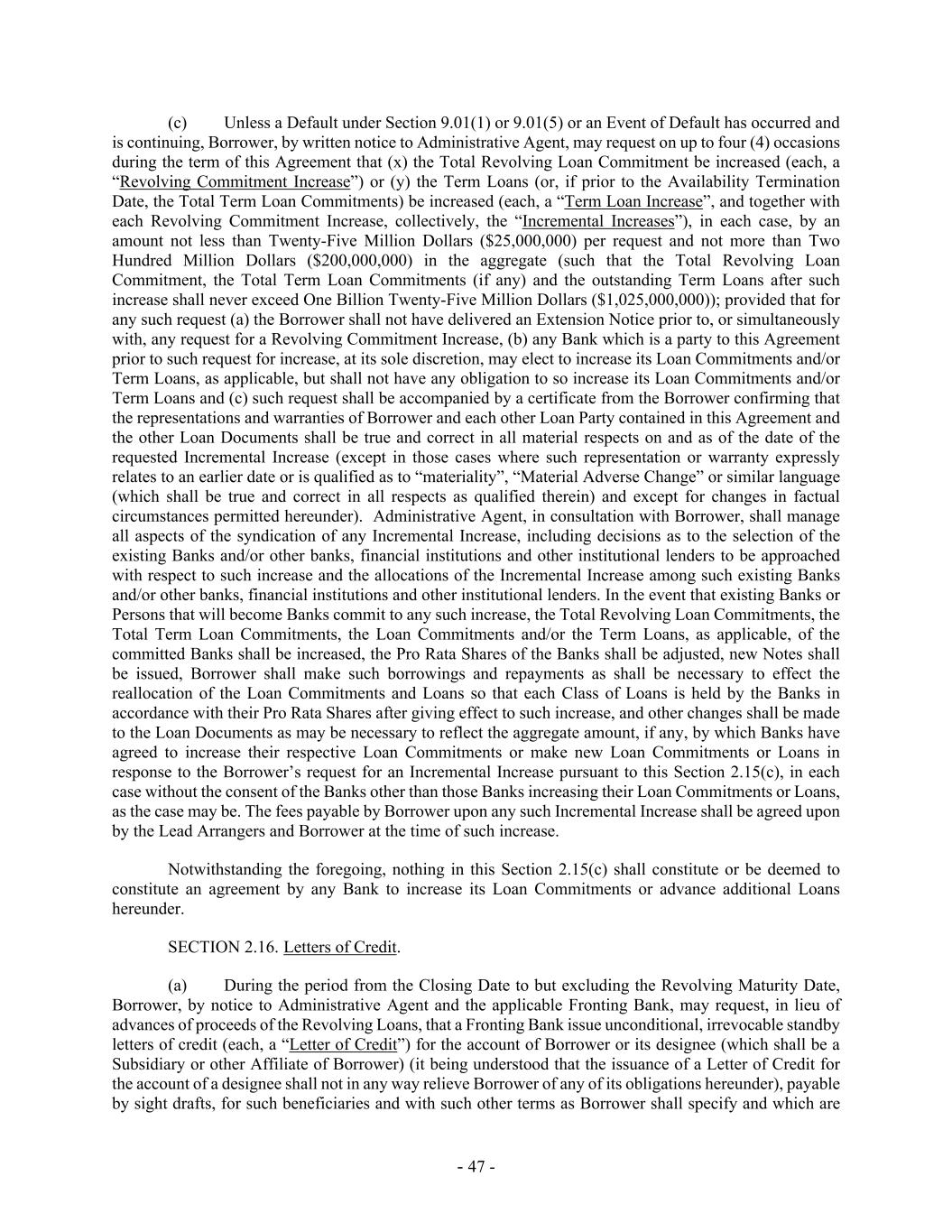 - 47 - (c) Unless a Default under Section 9.01(1) or 9.01(5) or an Event of Default has occurred and is continuing, Borrower, by written notice to Administrative Agent, may request on up to four (4) occasions during the term of this Agreement that (x) the Total Revolving Loan Commitment be increased (each, a “Revolving Commitment Increase”) or (y) the Term Loans (or, if prior to the Availability Termination Date, the Total Term Loan Commitments) be increased (each, a “Term Loan Increase”, and together with each Revolving Commitment Increase, collectively, the “Incremental Increases”), in each case, by an amount not less than Twenty-Five Million Dollars ($25,000,000) per request and not more than Two Hundred Million Dollars ($200,000,000) in the aggregate (such that the Total Revolving Loan Commitment, the Total Term Loan Commitments (if any) and the outstanding Term Loans after such increase shall never exceed One Billion Twenty-Five Million Dollars ($1,025,000,000)); provided that for any such request (a) the Borrower shall not have delivered an Extension Notice prior to, or simultaneously with, any request for a Revolving Commitment Increase, (b) any Bank which is a party to this Agreement prior to such request for increase, at its sole discretion, may elect to increase its Loan Commitments and/or Term Loans, as applicable, but shall not have any obligation to so increase its Loan Commitments and/or Term Loans and (c) such request shall be accompanied by a certificate from the Borrower confirming that the representations and warranties of Borrower and each other Loan Party contained in this Agreement and the other Loan Documents shall be true and correct in all material respects on and as of the date of the requested Incremental Increase (except in those cases where such representation or warranty expressly relates to an earlier date or is qualified as to “materiality”, “Material Adverse Change” or similar language (which shall be true and correct in all respects as qualified therein) and except for changes in factual circumstances permitted hereunder). Administrative Agent, in consultation with Borrower, shall manage all aspects of the syndication of any Incremental Increase, including decisions as to the selection of the existing Banks and/or other banks, financial institutions and other institutional lenders to be approached with respect to such increase and the allocations of the Incremental Increase among such existing Banks and/or other banks, financial institutions and other institutional lenders. In the event that existing Banks or Persons that will become Banks commit to any such increase, the Total Revolving Loan Commitments, the Total Term Loan Commitments, the Loan Commitments and/or the Term Loans, as applicable, of the committed Banks shall be increased, the Pro Rata Shares of the Banks shall be adjusted, new Notes shall be issued, Borrower shall make such borrowings and repayments as shall be necessary to effect the reallocation of the Loan Commitments and Loans so that each Class of Loans is held by the Banks in accordance with their Pro Rata Shares after giving effect to such increase, and other changes shall be made to the Loan Documents as may be necessary to reflect the aggregate amount, if any, by which Banks have agreed to increase their respective Loan Commitments or make new Loan Commitments or Loans in response to the Borrower’s request for an Incremental Increase pursuant to this Section 2.15(c), in each case without the consent of the Banks other than those Banks increasing their Loan Commitments or Loans, as the case may be. The fees payable by Borrower upon any such Incremental Increase shall be agreed upon by the Lead Arrangers and Borrower at the time of such increase. Notwithstanding the foregoing, nothing in this Section 2.15(c) shall constitute or be deemed to constitute an agreement by any Bank to increase its Loan Commitments or advance additional Loans hereunder. SECTION 2.16. Letters of Credit. (a) During the period from the Closing Date to but excluding the Revolving Maturity Date, Borrower, by notice to Administrative Agent and the applicable Fronting Bank, may request, in lieu of advances of proceeds of the Revolving Loans, that a Fronting Bank issue unconditional, irrevocable standby letters of credit (each, a “Letter of Credit”) for the account of Borrower or its designee (which shall be a Subsidiary or other Affiliate of Borrower) (it being understood that the issuance of a Letter of Credit for the account of a designee shall not in any way relieve Borrower of any of its obligations hereunder), payable by sight drafts, for such beneficiaries and with such other terms as Borrower shall specify and which are