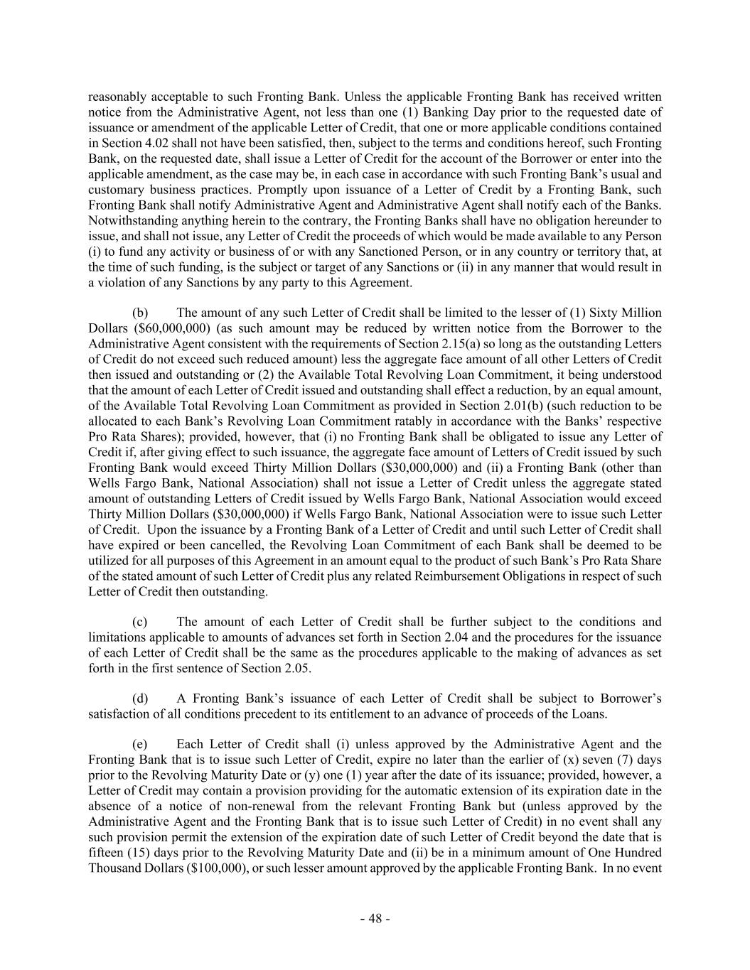 - 48 - reasonably acceptable to such Fronting Bank. Unless the applicable Fronting Bank has received written notice from the Administrative Agent, not less than one (1) Banking Day prior to the requested date of issuance or amendment of the applicable Letter of Credit, that one or more applicable conditions contained in Section 4.02 shall not have been satisfied, then, subject to the terms and conditions hereof, such Fronting Bank, on the requested date, shall issue a Letter of Credit for the account of the Borrower or enter into the applicable amendment, as the case may be, in each case in accordance with such Fronting Bank’s usual and customary business practices. Promptly upon issuance of a Letter of Credit by a Fronting Bank, such Fronting Bank shall notify Administrative Agent and Administrative Agent shall notify each of the Banks. Notwithstanding anything herein to the contrary, the Fronting Banks shall have no obligation hereunder to issue, and shall not issue, any Letter of Credit the proceeds of which would be made available to any Person (i) to fund any activity or business of or with any Sanctioned Person, or in any country or territory that, at the time of such funding, is the subject or target of any Sanctions or (ii) in any manner that would result in a violation of any Sanctions by any party to this Agreement. (b) The amount of any such Letter of Credit shall be limited to the lesser of (1) Sixty Million Dollars ($60,000,000) (as such amount may be reduced by written notice from the Borrower to the Administrative Agent consistent with the requirements of Section 2.15(a) so long as the outstanding Letters of Credit do not exceed such reduced amount) less the aggregate face amount of all other Letters of Credit then issued and outstanding or (2) the Available Total Revolving Loan Commitment, it being understood that the amount of each Letter of Credit issued and outstanding shall effect a reduction, by an equal amount, of the Available Total Revolving Loan Commitment as provided in Section 2.01(b) (such reduction to be allocated to each Bank’s Revolving Loan Commitment ratably in accordance with the Banks’ respective Pro Rata Shares); provided, however, that (i) no Fronting Bank shall be obligated to issue any Letter of Credit if, after giving effect to such issuance, the aggregate face amount of Letters of Credit issued by such Fronting Bank would exceed Thirty Million Dollars ($30,000,000) and (ii) a Fronting Bank (other than Wells Fargo Bank, National Association) shall not issue a Letter of Credit unless the aggregate stated amount of outstanding Letters of Credit issued by Wells Fargo Bank, National Association would exceed Thirty Million Dollars ($30,000,000) if Wells Fargo Bank, National Association were to issue such Letter of Credit. Upon the issuance by a Fronting Bank of a Letter of Credit and until such Letter of Credit shall have expired or been cancelled, the Revolving Loan Commitment of each Bank shall be deemed to be utilized for all purposes of this Agreement in an amount equal to the product of such Bank’s Pro Rata Share of the stated amount of such Letter of Credit plus any related Reimbursement Obligations in respect of such Letter of Credit then outstanding. (c) The amount of each Letter of Credit shall be further subject to the conditions and limitations applicable to amounts of advances set forth in Section 2.04 and the procedures for the issuance of each Letter of Credit shall be the same as the procedures applicable to the making of advances as set forth in the first sentence of Section 2.05. (d) A Fronting Bank’s issuance of each Letter of Credit shall be subject to Borrower’s satisfaction of all conditions precedent to its entitlement to an advance of proceeds of the Loans. (e) Each Letter of Credit shall (i) unless approved by the Administrative Agent and the Fronting Bank that is to issue such Letter of Credit, expire no later than the earlier of (x) seven (7) days prior to the Revolving Maturity Date or (y) one (1) year after the date of its issuance; provided, however, a Letter of Credit may contain a provision providing for the automatic extension of its expiration date in the absence of a notice of non-renewal from the relevant Fronting Bank but (unless approved by the Administrative Agent and the Fronting Bank that is to issue such Letter of Credit) in no event shall any such provision permit the extension of the expiration date of such Letter of Credit beyond the date that is fifteen (15) days prior to the Revolving Maturity Date and (ii) be in a minimum amount of One Hundred Thousand Dollars ($100,000), or such lesser amount approved by the applicable Fronting Bank. In no event