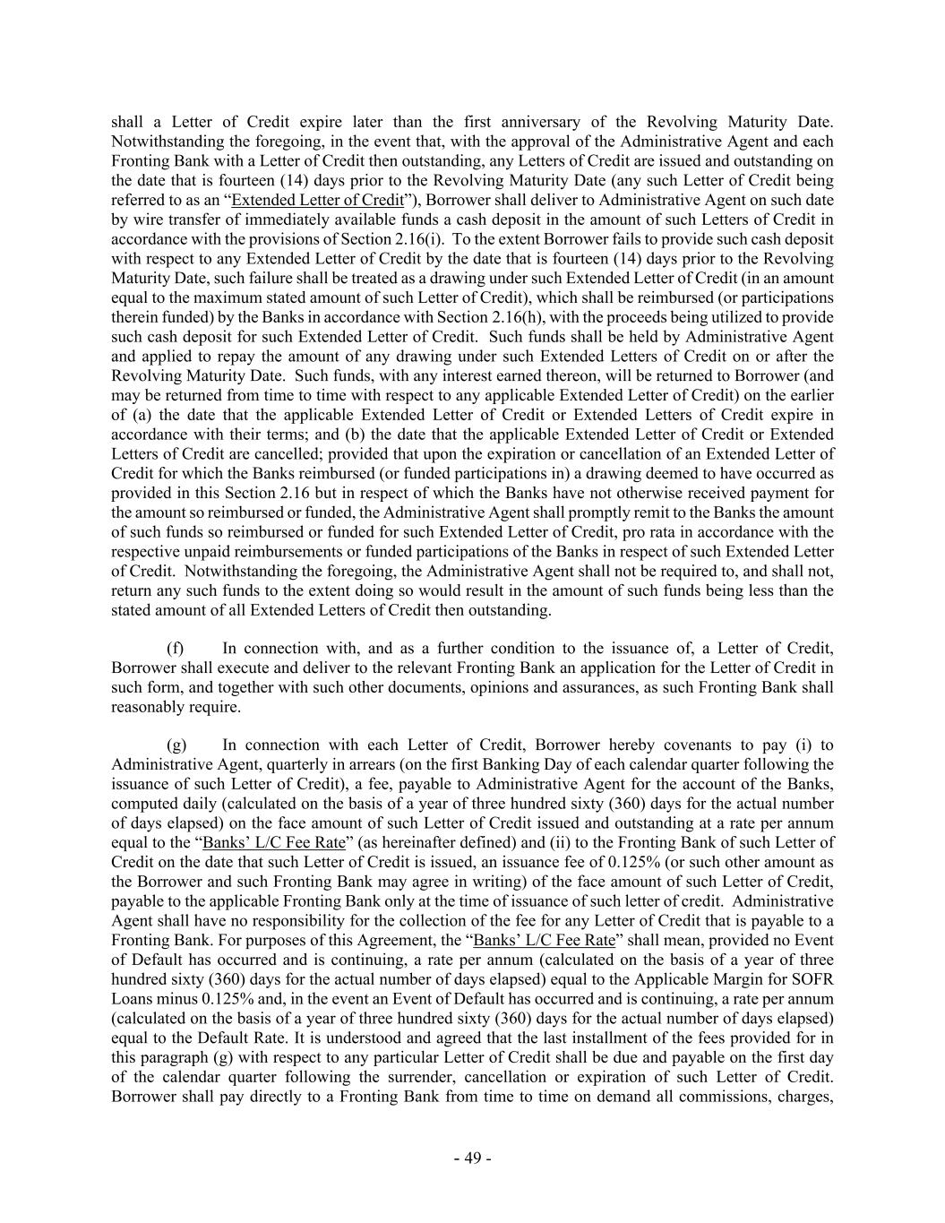 - 49 - shall a Letter of Credit expire later than the first anniversary of the Revolving Maturity Date. Notwithstanding the foregoing, in the event that, with the approval of the Administrative Agent and each Fronting Bank with a Letter of Credit then outstanding, any Letters of Credit are issued and outstanding on the date that is fourteen (14) days prior to the Revolving Maturity Date (any such Letter of Credit being referred to as an “Extended Letter of Credit”), Borrower shall deliver to Administrative Agent on such date by wire transfer of immediately available funds a cash deposit in the amount of such Letters of Credit in accordance with the provisions of Section 2.16(i). To the extent Borrower fails to provide such cash deposit with respect to any Extended Letter of Credit by the date that is fourteen (14) days prior to the Revolving Maturity Date, such failure shall be treated as a drawing under such Extended Letter of Credit (in an amount equal to the maximum stated amount of such Letter of Credit), which shall be reimbursed (or participations therein funded) by the Banks in accordance with Section 2.16(h), with the proceeds being utilized to provide such cash deposit for such Extended Letter of Credit. Such funds shall be held by Administrative Agent and applied to repay the amount of any drawing under such Extended Letters of Credit on or after the Revolving Maturity Date. Such funds, with any interest earned thereon, will be returned to Borrower (and may be returned from time to time with respect to any applicable Extended Letter of Credit) on the earlier of (a) the date that the applicable Extended Letter of Credit or Extended Letters of Credit expire in accordance with their terms; and (b) the date that the applicable Extended Letter of Credit or Extended Letters of Credit are cancelled; provided that upon the expiration or cancellation of an Extended Letter of Credit for which the Banks reimbursed (or funded participations in) a drawing deemed to have occurred as provided in this Section 2.16 but in respect of which the Banks have not otherwise received payment for the amount so reimbursed or funded, the Administrative Agent shall promptly remit to the Banks the amount of such funds so reimbursed or funded for such Extended Letter of Credit, pro rata in accordance with the respective unpaid reimbursements or funded participations of the Banks in respect of such Extended Letter of Credit. Notwithstanding the foregoing, the Administrative Agent shall not be required to, and shall not, return any such funds to the extent doing so would result in the amount of such funds being less than the stated amount of all Extended Letters of Credit then outstanding. (f) In connection with, and as a further condition to the issuance of, a Letter of Credit, Borrower shall execute and deliver to the relevant Fronting Bank an application for the Letter of Credit in such form, and together with such other documents, opinions and assurances, as such Fronting Bank shall reasonably require. (g) In connection with each Letter of Credit, Borrower hereby covenants to pay (i) to Administrative Agent, quarterly in arrears (on the first Banking Day of each calendar quarter following the issuance of such Letter of Credit), a fee, payable to Administrative Agent for the account of the Banks, computed daily (calculated on the basis of a year of three hundred sixty (360) days for the actual number of days elapsed) on the face amount of such Letter of Credit issued and outstanding at a rate per annum equal to the “Banks’ L/C Fee Rate” (as hereinafter defined) and (ii) to the Fronting Bank of such Letter of Credit on the date that such Letter of Credit is issued, an issuance fee of 0.125% (or such other amount as the Borrower and such Fronting Bank may agree in writing) of the face amount of such Letter of Credit, payable to the applicable Fronting Bank only at the time of issuance of such letter of credit. Administrative Agent shall have no responsibility for the collection of the fee for any Letter of Credit that is payable to a Fronting Bank. For purposes of this Agreement, the “Banks’ L/C Fee Rate” shall mean, provided no Event of Default has occurred and is continuing, a rate per annum (calculated on the basis of a year of three hundred sixty (360) days for the actual number of days elapsed) equal to the Applicable Margin for SOFR Loans minus 0.125% and, in the event an Event of Default has occurred and is continuing, a rate per annum (calculated on the basis of a year of three hundred sixty (360) days for the actual number of days elapsed) equal to the Default Rate. It is understood and agreed that the last installment of the fees provided for in this paragraph (g) with respect to any particular Letter of Credit shall be due and payable on the first day of the calendar quarter following the surrender, cancellation or expiration of such Letter of Credit. Borrower shall pay directly to a Fronting Bank from time to time on demand all commissions, charges,