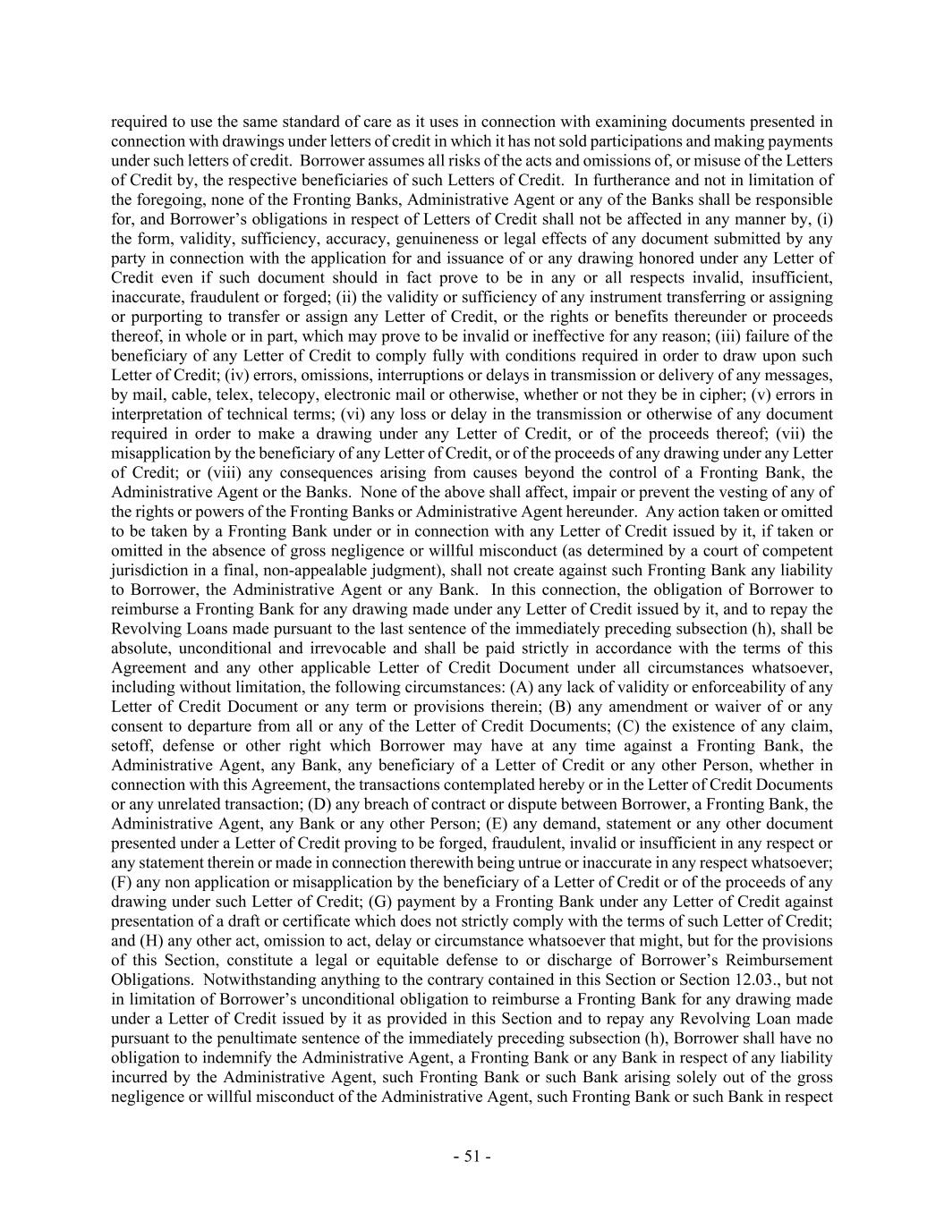 - 51 - required to use the same standard of care as it uses in connection with examining documents presented in connection with drawings under letters of credit in which it has not sold participations and making payments under such letters of credit. Borrower assumes all risks of the acts and omissions of, or misuse of the Letters of Credit by, the respective beneficiaries of such Letters of Credit. In furtherance and not in limitation of the foregoing, none of the Fronting Banks, Administrative Agent or any of the Banks shall be responsible for, and Borrower’s obligations in respect of Letters of Credit shall not be affected in any manner by, (i) the form, validity, sufficiency, accuracy, genuineness or legal effects of any document submitted by any party in connection with the application for and issuance of or any drawing honored under any Letter of Credit even if such document should in fact prove to be in any or all respects invalid, insufficient, inaccurate, fraudulent or forged; (ii) the validity or sufficiency of any instrument transferring or assigning or purporting to transfer or assign any Letter of Credit, or the rights or benefits thereunder or proceeds thereof, in whole or in part, which may prove to be invalid or ineffective for any reason; (iii) failure of the beneficiary of any Letter of Credit to comply fully with conditions required in order to draw upon such Letter of Credit; (iv) errors, omissions, interruptions or delays in transmission or delivery of any messages, by mail, cable, telex, telecopy, electronic mail or otherwise, whether or not they be in cipher; (v) errors in interpretation of technical terms; (vi) any loss or delay in the transmission or otherwise of any document required in order to make a drawing under any Letter of Credit, or of the proceeds thereof; (vii) the misapplication by the beneficiary of any Letter of Credit, or of the proceeds of any drawing under any Letter of Credit; or (viii) any consequences arising from causes beyond the control of a Fronting Bank, the Administrative Agent or the Banks. None of the above shall affect, impair or prevent the vesting of any of the rights or powers of the Fronting Banks or Administrative Agent hereunder. Any action taken or omitted to be taken by a Fronting Bank under or in connection with any Letter of Credit issued by it, if taken or omitted in the absence of gross negligence or willful misconduct (as determined by a court of competent jurisdiction in a final, non-appealable judgment), shall not create against such Fronting Bank any liability to Borrower, the Administrative Agent or any Bank. In this connection, the obligation of Borrower to reimburse a Fronting Bank for any drawing made under any Letter of Credit issued by it, and to repay the Revolving Loans made pursuant to the last sentence of the immediately preceding subsection (h), shall be absolute, unconditional and irrevocable and shall be paid strictly in accordance with the terms of this Agreement and any other applicable Letter of Credit Document under all circumstances whatsoever, including without limitation, the following circumstances: (A) any lack of validity or enforceability of any Letter of Credit Document or any term or provisions therein; (B) any amendment or waiver of or any consent to departure from all or any of the Letter of Credit Documents; (C) the existence of any claim, setoff, defense or other right which Borrower may have at any time against a Fronting Bank, the Administrative Agent, any Bank, any beneficiary of a Letter of Credit or any other Person, whether in connection with this Agreement, the transactions contemplated hereby or in the Letter of Credit Documents or any unrelated transaction; (D) any breach of contract or dispute between Borrower, a Fronting Bank, the Administrative Agent, any Bank or any other Person; (E) any demand, statement or any other document presented under a Letter of Credit proving to be forged, fraudulent, invalid or insufficient in any respect or any statement therein or made in connection therewith being untrue or inaccurate in any respect whatsoever; (F) any non application or misapplication by the beneficiary of a Letter of Credit or of the proceeds of any drawing under such Letter of Credit; (G) payment by a Fronting Bank under any Letter of Credit against presentation of a draft or certificate which does not strictly comply with the terms of such Letter of Credit; and (H) any other act, omission to act, delay or circumstance whatsoever that might, but for the provisions of this Section, constitute a legal or equitable defense to or discharge of Borrower’s Reimbursement Obligations. Notwithstanding anything to the contrary contained in this Section or Section 12.03., but not in limitation of Borrower’s unconditional obligation to reimburse a Fronting Bank for any drawing made under a Letter of Credit issued by it as provided in this Section and to repay any Revolving Loan made pursuant to the penultimate sentence of the immediately preceding subsection (h), Borrower shall have no obligation to indemnify the Administrative Agent, a Fronting Bank or any Bank in respect of any liability incurred by the Administrative Agent, such Fronting Bank or such Bank arising solely out of the gross negligence or willful misconduct of the Administrative Agent, such Fronting Bank or such Bank in respect