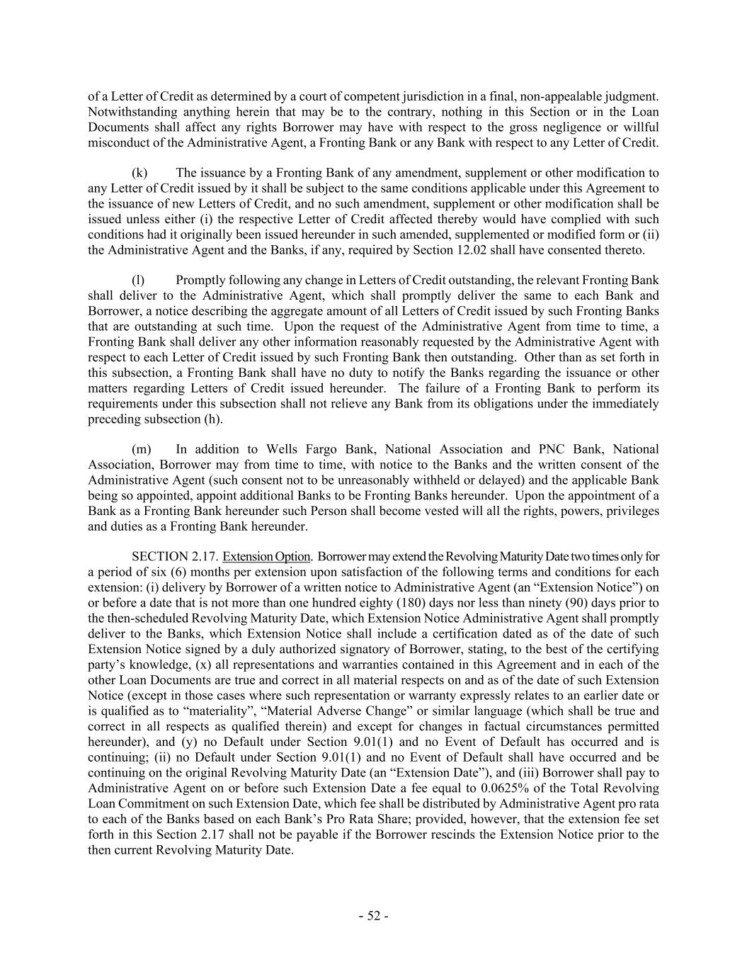 - 52 - of a Letter of Credit as determined by a court of competent jurisdiction in a final, non-appealable judgment. Notwithstanding anything herein that may be to the contrary, nothing in this Section or in the Loan Documents shall affect any rights Borrower may have with respect to the gross negligence or willful misconduct of the Administrative Agent, a Fronting Bank or any Bank with respect to any Letter of Credit. (k) The issuance by a Fronting Bank of any amendment, supplement or other modification to any Letter of Credit issued by it shall be subject to the same conditions applicable under this Agreement to the issuance of new Letters of Credit, and no such amendment, supplement or other modification shall be issued unless either (i) the respective Letter of Credit affected thereby would have complied with such conditions had it originally been issued hereunder in such amended, supplemented or modified form or (ii) the Administrative Agent and the Banks, if any, required by Section 12.02 shall have consented thereto. (l) Promptly following any change in Letters of Credit outstanding, the relevant Fronting Bank shall deliver to the Administrative Agent, which shall promptly deliver the same to each Bank and Borrower, a notice describing the aggregate amount of all Letters of Credit issued by such Fronting Banks that are outstanding at such time. Upon the request of the Administrative Agent from time to time, a Fronting Bank shall deliver any other information reasonably requested by the Administrative Agent with respect to each Letter of Credit issued by such Fronting Bank then outstanding. Other than as set forth in this subsection, a Fronting Bank shall have no duty to notify the Banks regarding the issuance or other matters regarding Letters of Credit issued hereunder. The failure of a Fronting Bank to perform its requirements under this subsection shall not relieve any Bank from its obligations under the immediately preceding subsection (h). (m) In addition to Wells Fargo Bank, National Association and PNC Bank, National Association, Borrower may from time to time, with notice to the Banks and the written consent of the Administrative Agent (such consent not to be unreasonably withheld or delayed) and the applicable Bank being so appointed, appoint additional Banks to be Fronting Banks hereunder. Upon the appointment of a Bank as a Fronting Bank hereunder such Person shall become vested will all the rights, powers, privileges and duties as a Fronting Bank hereunder. SECTION 2.17. Extension Option. Borrower may extend the Revolving Maturity Date two times only for a period of six (6) months per extension upon satisfaction of the following terms and conditions for each extension: (i) delivery by Borrower of a written notice to Administrative Agent (an “Extension Notice”) on or before a date that is not more than one hundred eighty (180) days nor less than ninety (90) days prior to the then-scheduled Revolving Maturity Date, which Extension Notice Administrative Agent shall promptly deliver to the Banks, which Extension Notice shall include a certification dated as of the date of such Extension Notice signed by a duly authorized signatory of Borrower, stating, to the best of the certifying party’s knowledge, (x) all representations and warranties contained in this Agreement and in each of the other Loan Documents are true and correct in all material respects on and as of the date of such Extension Notice (except in those cases where such representation or warranty expressly relates to an earlier date or is qualified as to “materiality”, “Material Adverse Change” or similar language (which shall be true and correct in all respects as qualified therein) and except for changes in factual circumstances permitted hereunder), and (y) no Default under Section 9.01(1) and no Event of Default has occurred and is continuing; (ii) no Default under Section 9.01(1) and no Event of Default shall have occurred and be continuing on the original Revolving Maturity Date (an “Extension Date”), and (iii) Borrower shall pay to Administrative Agent on or before such Extension Date a fee equal to 0.0625% of the Total Revolving Loan Commitment on such Extension Date, which fee shall be distributed by Administrative Agent pro rata to each of the Banks based on each Bank’s Pro Rata Share; provided, however, that the extension fee set forth in this Section 2.17 shall not be payable if the Borrower rescinds the Extension Notice prior to the then current Revolving Maturity Date.