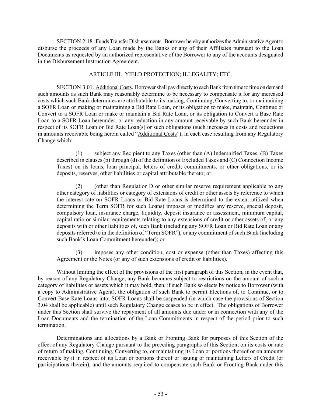 - 53 - SECTION 2.18. Funds Transfer Disbursements. Borrower hereby authorizes the Administrative Agent to disburse the proceeds of any Loan made by the Banks or any of their Affiliates pursuant to the Loan Documents as requested by an authorized representative of the Borrower to any of the accounts designated in the Disbursement Instruction Agreement. ARTICLE III. YIELD PROTECTION; ILLEGALITY; ETC. SECTION 3.01. Additional Costs. Borrower shall pay directly to each Bank from time to time on demand such amounts as such Bank may reasonably determine to be necessary to compensate it for any increased costs which such Bank determines are attributable to its making, Continuing, Converting to, or maintaining a SOFR Loan or making or maintaining a Bid Rate Loan, or its obligation to make, maintain, Continue or Convert to a SOFR Loan or make or maintain a Bid Rate Loan, or its obligation to Convert a Base Rate Loan to a SOFR Loan hereunder, or any reduction in any amount receivable by such Bank hereunder in respect of its SOFR Loan or Bid Rate Loan(s) or such obligations (such increases in costs and reductions in amounts receivable being herein called “Additional Costs”), in each case resulting from any Regulatory Change which: (1) subject any Recipient to any Taxes (other than (A) Indemnified Taxes, (B) Taxes described in clauses (b) through (d) of the definition of Excluded Taxes and (C) Connection Income Taxes) on its loans, loan principal, letters of credit, commitments, or other obligations, or its deposits, reserves, other liabilities or capital attributable thereto; or (2) (other than Regulation D or other similar reserve requirement applicable to any other category of liabilities or category of extensions of credit or other assets by reference to which the interest rate on SOFR Loans or Bid Rate Loans is determined to the extent utilized when determining the Term SOFR for such Loans) imposes or modifies any reserve, special deposit, compulsory loan, insurance charge, liquidity, deposit insurance or assessment, minimum capital, capital ratio or similar requirements relating to any extensions of credit or other assets of, or any deposits with or other liabilities of, such Bank (including any SOFR Loan or Bid Rate Loan or any deposits referred to in the definition of “Term SOFR”), or any commitment of such Bank (including such Bank’s Loan Commitment hereunder); or (3) imposes any other condition, cost or expense (other than Taxes) affecting this Agreement or the Notes (or any of such extensions of credit or liabilities). Without limiting the effect of the provisions of the first paragraph of this Section, in the event that, by reason of any Regulatory Change, any Bank becomes subject to restrictions on the amount of such a category of liabilities or assets which it may hold, then, if such Bank so elects by notice to Borrower (with a copy to Administrative Agent), the obligation of such Bank to permit Elections of, to Continue, or to Convert Base Rate Loans into, SOFR Loans shall be suspended (in which case the provisions of Section 3.04 shall be applicable) until such Regulatory Change ceases to be in effect. The obligations of Borrower under this Section shall survive the repayment of all amounts due under or in connection with any of the Loan Documents and the termination of the Loan Commitments in respect of the period prior to such termination. Determinations and allocations by a Bank or Fronting Bank for purposes of this Section of the effect of any Regulatory Change pursuant to the preceding paragraphs of this Section, on its costs or rate of return of making, Continuing, Converting to, or maintaining its Loan or portions thereof or on amounts receivable by it in respect of its Loan or portions thereof or issuing or maintaining Letters of Credit (or participations therein), and the amounts required to compensate such Bank or Fronting Bank under this
