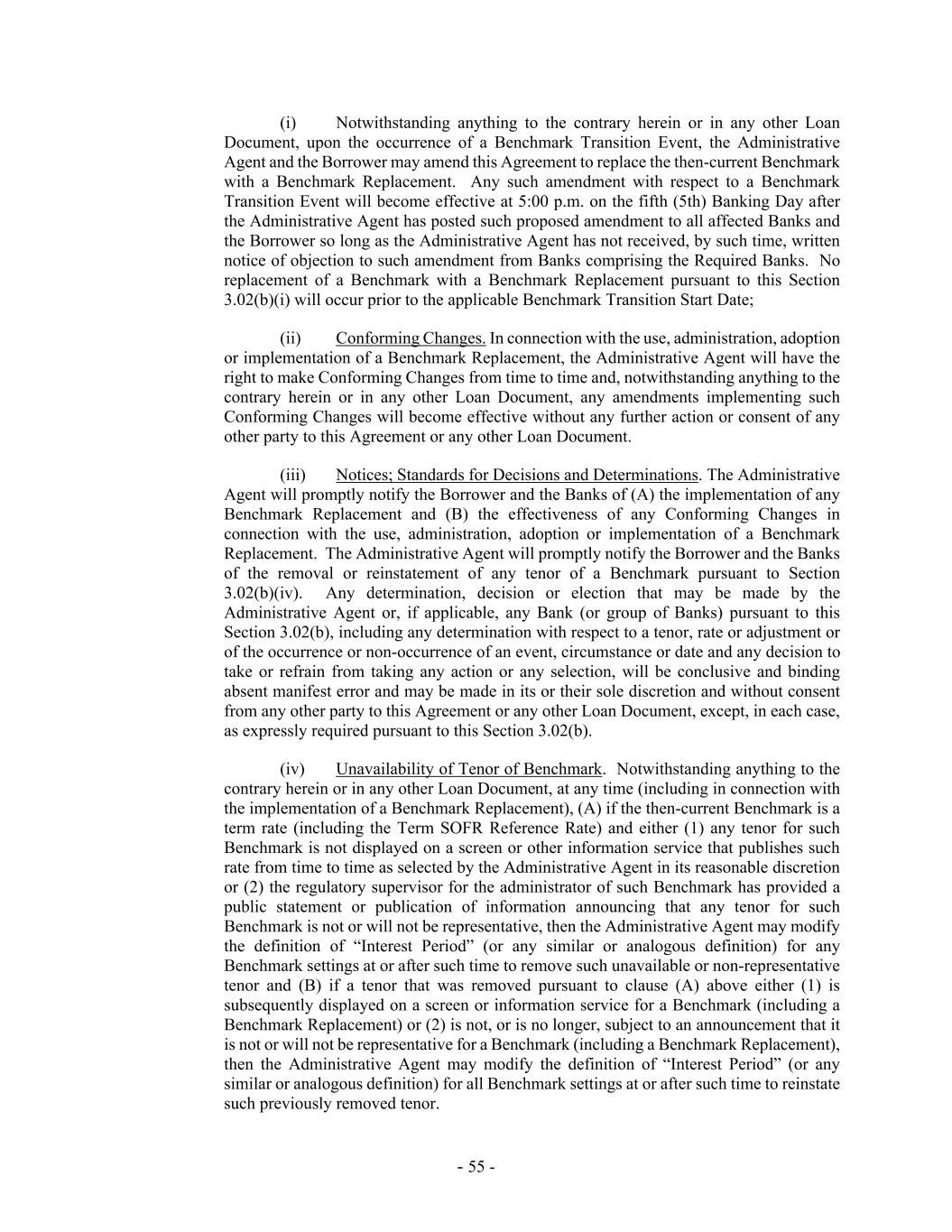 - 55 - (i) Notwithstanding anything to the contrary herein or in any other Loan Document, upon the occurrence of a Benchmark Transition Event, the Administrative Agent and the Borrower may amend this Agreement to replace the then-current Benchmark with a Benchmark Replacement. Any such amendment with respect to a Benchmark Transition Event will become effective at 5:00 p.m. on the fifth (5th) Banking Day after the Administrative Agent has posted such proposed amendment to all affected Banks and the Borrower so long as the Administrative Agent has not received, by such time, written notice of objection to such amendment from Banks comprising the Required Banks. No replacement of a Benchmark with a Benchmark Replacement pursuant to this Section 3.02(b)(i) will occur prior to the applicable Benchmark Transition Start Date; (ii) Conforming Changes. In connection with the use, administration, adoption or implementation of a Benchmark Replacement, the Administrative Agent will have the right to make Conforming Changes from time to time and, notwithstanding anything to the contrary herein or in any other Loan Document, any amendments implementing such Conforming Changes will become effective without any further action or consent of any other party to this Agreement or any other Loan Document. (iii) Notices; Standards for Decisions and Determinations. The Administrative Agent will promptly notify the Borrower and the Banks of (A) the implementation of any Benchmark Replacement and (B) the effectiveness of any Conforming Changes in connection with the use, administration, adoption or implementation of a Benchmark Replacement. The Administrative Agent will promptly notify the Borrower and the Banks of the removal or reinstatement of any tenor of a Benchmark pursuant to Section 3.02(b)(iv). Any determination, decision or election that may be made by the Administrative Agent or, if applicable, any Bank (or group of Banks) pursuant to this Section 3.02(b), including any determination with respect to a tenor, rate or adjustment or of the occurrence or non-occurrence of an event, circumstance or date and any decision to take or refrain from taking any action or any selection, will be conclusive and binding absent manifest error and may be made in its or their sole discretion and without consent from any other party to this Agreement or any other Loan Document, except, in each case, as expressly required pursuant to this Section 3.02(b). (iv) Unavailability of Tenor of Benchmark. Notwithstanding anything to the contrary herein or in any other Loan Document, at any time (including in connection with the implementation of a Benchmark Replacement), (A) if the then-current Benchmark is a term rate (including the Term SOFR Reference Rate) and either (1) any tenor for such Benchmark is not displayed on a screen or other information service that publishes such rate from time to time as selected by the Administrative Agent in its reasonable discretion or (2) the regulatory supervisor for the administrator of such Benchmark has provided a public statement or publication of information announcing that any tenor for such Benchmark is not or will not be representative, then the Administrative Agent may modify the definition of “Interest Period” (or any similar or analogous definition) for any Benchmark settings at or after such time to remove such unavailable or non-representative tenor and (B) if a tenor that was removed pursuant to clause (A) above either (1) is subsequently displayed on a screen or information service for a Benchmark (including a Benchmark Replacement) or (2) is not, or is no longer, subject to an announcement that it is not or will not be representative for a Benchmark (including a Benchmark Replacement), then the Administrative Agent may modify the definition of “Interest Period” (or any similar or analogous definition) for all Benchmark settings at or after such time to reinstate such previously removed tenor.