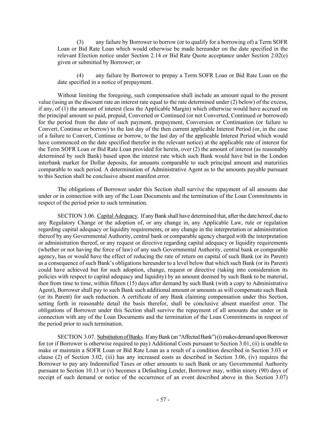 - 57 - (3) any failure by Borrower to borrow (or to qualify for a borrowing of) a Term SOFR Loan or Bid Rate Loan which would otherwise be made hereunder on the date specified in the relevant Election notice under Section 2.14 or Bid Rate Quote acceptance under Section 2.02(e) given or submitted by Borrower; or (4) any failure by Borrower to prepay a Term SOFR Loan or Bid Rate Loan on the date specified in a notice of prepayment. Without limiting the foregoing, such compensation shall include an amount equal to the present value (using as the discount rate an interest rate equal to the rate determined under (2) below) of the excess, if any, of (1) the amount of interest (less the Applicable Margin) which otherwise would have accrued on the principal amount so paid, prepaid, Converted or Continued (or not Converted, Continued or borrowed) for the period from the date of such payment, prepayment, Conversion or Continuation (or failure to Convert, Continue or borrow) to the last day of the then current applicable Interest Period (or, in the case of a failure to Convert, Continue or borrow, to the last day of the applicable Interest Period which would have commenced on the date specified therefor in the relevant notice) at the applicable rate of interest for the Term SOFR Loan or Bid Rate Loan provided for herein, over (2) the amount of interest (as reasonably determined by such Bank) based upon the interest rate which such Bank would have bid in the London interbank market for Dollar deposits, for amounts comparable to such principal amount and maturities comparable to such period. A determination of Administrative Agent as to the amounts payable pursuant to this Section shall be conclusive absent manifest error. The obligations of Borrower under this Section shall survive the repayment of all amounts due under or in connection with any of the Loan Documents and the termination of the Loan Commitments in respect of the period prior to such termination. SECTION 3.06. Capital Adequacy. If any Bank shall have determined that, after the date hereof, due to any Regulatory Change or the adoption of, or any change in, any Applicable Law, rule or regulation regarding capital adequacy or liquidity requirements, or any change in the interpretation or administration thereof by any Governmental Authority, central bank or comparable agency charged with the interpretation or administration thereof, or any request or directive regarding capital adequacy or liquidity requirements (whether or not having the force of law) of any such Governmental Authority, central bank or comparable agency, has or would have the effect of reducing the rate of return on capital of such Bank (or its Parent) as a consequence of such Bank’s obligations hereunder to a level below that which such Bank (or its Parent) could have achieved but for such adoption, change, request or directive (taking into consideration its policies with respect to capital adequacy and liquidity) by an amount deemed by such Bank to be material, then from time to time, within fifteen (15) days after demand by such Bank (with a copy to Administrative Agent), Borrower shall pay to such Bank such additional amount or amounts as will compensate such Bank (or its Parent) for such reduction. A certificate of any Bank claiming compensation under this Section, setting forth in reasonable detail the basis therefor, shall be conclusive absent manifest error. The obligations of Borrower under this Section shall survive the repayment of all amounts due under or in connection with any of the Loan Documents and the termination of the Loan Commitments in respect of the period prior to such termination. SECTION 3.07. Substitution of Banks. If any Bank (an “Affected Bank”) (i) makes demand upon Borrower for (or if Borrower is otherwise required to pay) Additional Costs pursuant to Section 3.01, (ii) is unable to make or maintain a SOFR Loan or Bid Rate Loan as a result of a condition described in Section 3.03 or clause (2) of Section 3.02, (iii) has any increased costs as described in Section 3.06, (iv) requires the Borrower to pay any Indemnified Taxes or other amounts to such Bank or any Governmental Authority pursuant to Section 10.13 or (v) becomes a Defaulting Lender, Borrower may, within ninety (90) days of receipt of such demand or notice of the occurrence of an event described above in this Section 3.07)