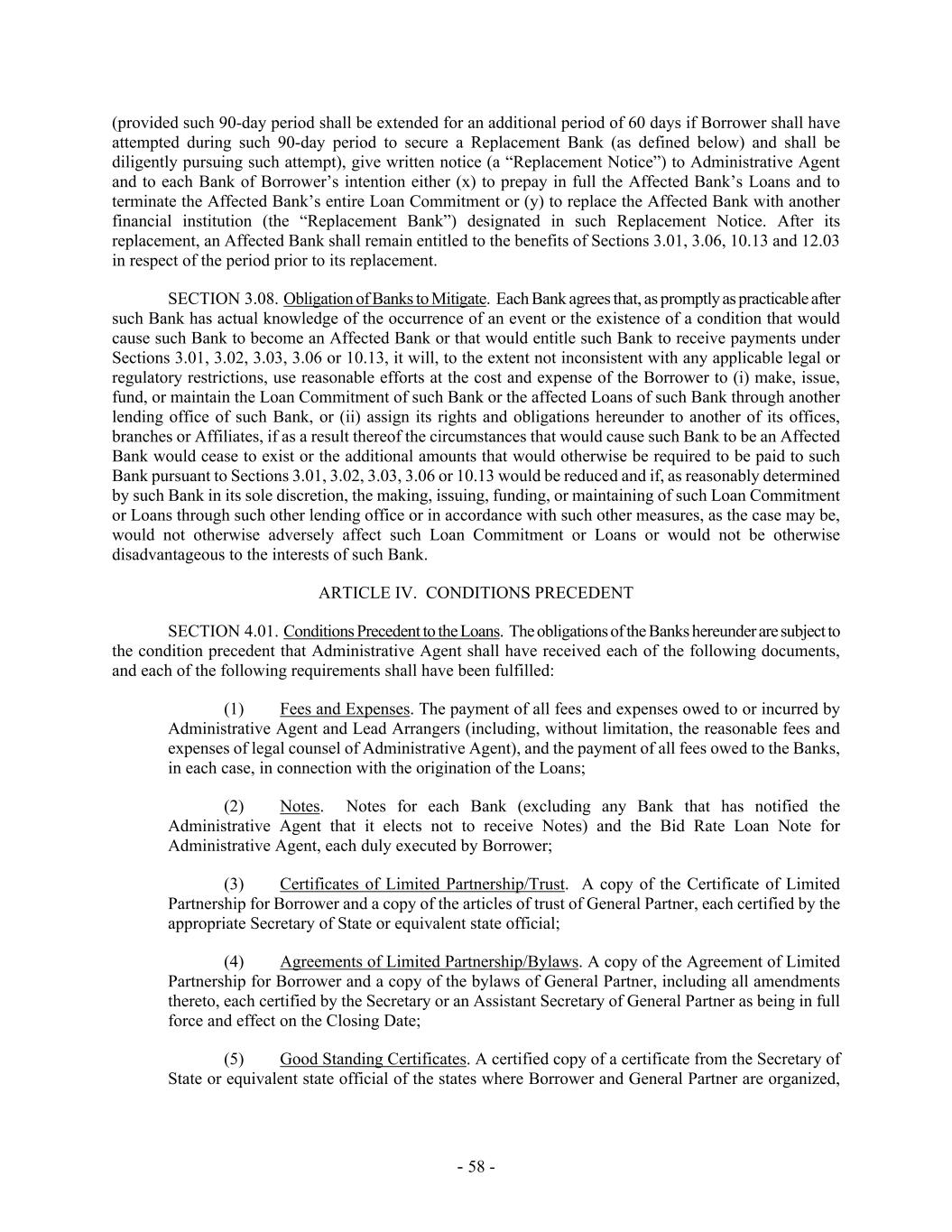 - 58 - (provided such 90-day period shall be extended for an additional period of 60 days if Borrower shall have attempted during such 90-day period to secure a Replacement Bank (as defined below) and shall be diligently pursuing such attempt), give written notice (a “Replacement Notice”) to Administrative Agent and to each Bank of Borrower’s intention either (x) to prepay in full the Affected Bank’s Loans and to terminate the Affected Bank’s entire Loan Commitment or (y) to replace the Affected Bank with another financial institution (the “Replacement Bank”) designated in such Replacement Notice. After its replacement, an Affected Bank shall remain entitled to the benefits of Sections 3.01, 3.06, 10.13 and 12.03 in respect of the period prior to its replacement. SECTION 3.08. Obligation of Banks to Mitigate. Each Bank agrees that, as promptly as practicable after such Bank has actual knowledge of the occurrence of an event or the existence of a condition that would cause such Bank to become an Affected Bank or that would entitle such Bank to receive payments under Sections 3.01, 3.02, 3.03, 3.06 or 10.13, it will, to the extent not inconsistent with any applicable legal or regulatory restrictions, use reasonable efforts at the cost and expense of the Borrower to (i) make, issue, fund, or maintain the Loan Commitment of such Bank or the affected Loans of such Bank through another lending office of such Bank, or (ii) assign its rights and obligations hereunder to another of its offices, branches or Affiliates, if as a result thereof the circumstances that would cause such Bank to be an Affected Bank would cease to exist or the additional amounts that would otherwise be required to be paid to such Bank pursuant to Sections 3.01, 3.02, 3.03, 3.06 or 10.13 would be reduced and if, as reasonably determined by such Bank in its sole discretion, the making, issuing, funding, or maintaining of such Loan Commitment or Loans through such other lending office or in accordance with such other measures, as the case may be, would not otherwise adversely affect such Loan Commitment or Loans or would not be otherwise disadvantageous to the interests of such Bank. ARTICLE IV. CONDITIONS PRECEDENT SECTION 4.01. Conditions Precedent to the Loans. The obligations of the Banks hereunder are subject to the condition precedent that Administrative Agent shall have received each of the following documents, and each of the following requirements shall have been fulfilled: (1) Fees and Expenses. The payment of all fees and expenses owed to or incurred by Administrative Agent and Lead Arrangers (including, without limitation, the reasonable fees and expenses of legal counsel of Administrative Agent), and the payment of all fees owed to the Banks, in each case, in connection with the origination of the Loans; (2) Notes. Notes for each Bank (excluding any Bank that has notified the Administrative Agent that it elects not to receive Notes) and the Bid Rate Loan Note for Administrative Agent, each duly executed by Borrower; (3) Certificates of Limited Partnership/Trust. A copy of the Certificate of Limited Partnership for Borrower and a copy of the articles of trust of General Partner, each certified by the appropriate Secretary of State or equivalent state official; (4) Agreements of Limited Partnership/Bylaws. A copy of the Agreement of Limited Partnership for Borrower and a copy of the bylaws of General Partner, including all amendments thereto, each certified by the Secretary or an Assistant Secretary of General Partner as being in full force and effect on the Closing Date; (5) Good Standing Certificates. A certified copy of a certificate from the Secretary of State or equivalent state official of the states where Borrower and General Partner are organized,