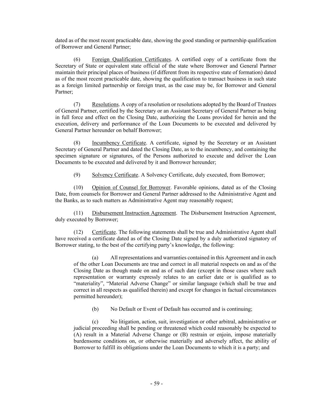 - 59 - dated as of the most recent practicable date, showing the good standing or partnership qualification of Borrower and General Partner; (6) Foreign Qualification Certificates. A certified copy of a certificate from the Secretary of State or equivalent state official of the state where Borrower and General Partner maintain their principal places of business (if different from its respective state of formation) dated as of the most recent practicable date, showing the qualification to transact business in such state as a foreign limited partnership or foreign trust, as the case may be, for Borrower and General Partner; (7) Resolutions. A copy of a resolution or resolutions adopted by the Board of Trustees of General Partner, certified by the Secretary or an Assistant Secretary of General Partner as being in full force and effect on the Closing Date, authorizing the Loans provided for herein and the execution, delivery and performance of the Loan Documents to be executed and delivered by General Partner hereunder on behalf Borrower; (8) Incumbency Certificate. A certificate, signed by the Secretary or an Assistant Secretary of General Partner and dated the Closing Date, as to the incumbency, and containing the specimen signature or signatures, of the Persons authorized to execute and deliver the Loan Documents to be executed and delivered by it and Borrower hereunder; (9) Solvency Certificate. A Solvency Certificate, duly executed, from Borrower; (10) Opinion of Counsel for Borrower. Favorable opinions, dated as of the Closing Date, from counsels for Borrower and General Partner addressed to the Administrative Agent and the Banks, as to such matters as Administrative Agent may reasonably request; (11) Disbursement Instruction Agreement. The Disbursement Instruction Agreement, duly executed by Borrower; (12) Certificate. The following statements shall be true and Administrative Agent shall have received a certificate dated as of the Closing Date signed by a duly authorized signatory of Borrower stating, to the best of the certifying party’s knowledge, the following: (a) All representations and warranties contained in this Agreement and in each of the other Loan Documents are true and correct in all material respects on and as of the Closing Date as though made on and as of such date (except in those cases where such representation or warranty expressly relates to an earlier date or is qualified as to “materiality”, “Material Adverse Change” or similar language (which shall be true and correct in all respects as qualified therein) and except for changes in factual circumstances permitted hereunder); (b) No Default or Event of Default has occurred and is continuing; (c) No litigation, action, suit, investigation or other arbitral, administrative or judicial proceeding shall be pending or threatened which could reasonably be expected to (A) result in a Material Adverse Change or (B) restrain or enjoin, impose materially burdensome conditions on, or otherwise materially and adversely affect, the ability of Borrower to fulfill its obligations under the Loan Documents to which it is a party; and
