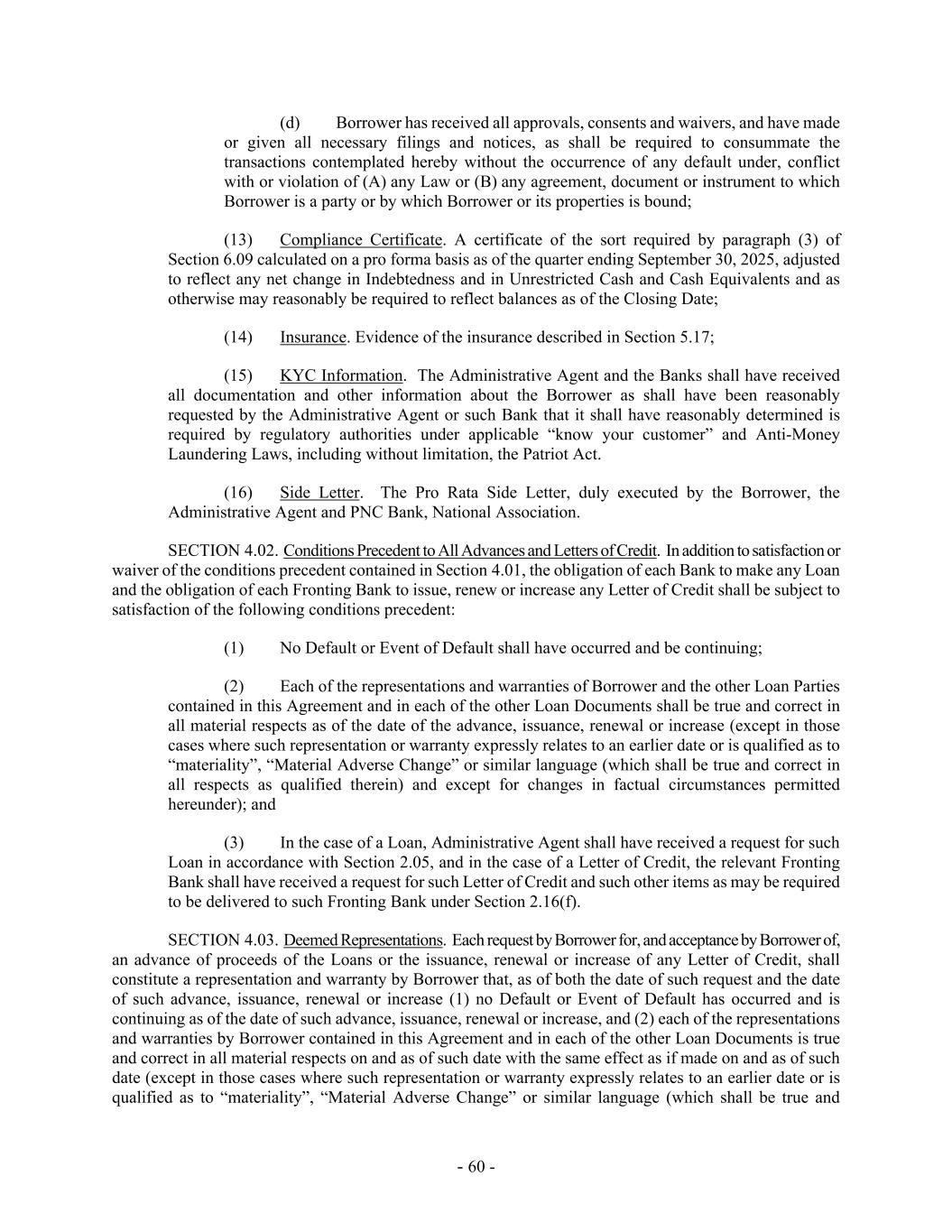 - 60 - (d) Borrower has received all approvals, consents and waivers, and have made or given all necessary filings and notices, as shall be required to consummate the transactions contemplated hereby without the occurrence of any default under, conflict with or violation of (A) any Law or (B) any agreement, document or instrument to which Borrower is a party or by which Borrower or its properties is bound; (13) Compliance Certificate. A certificate of the sort required by paragraph (3) of Section 6.09 calculated on a pro forma basis as of the quarter ending September 30, 2025, adjusted to reflect any net change in Indebtedness and in Unrestricted Cash and Cash Equivalents and as otherwise may reasonably be required to reflect balances as of the Closing Date; (14) Insurance. Evidence of the insurance described in Section 5.17; (15) KYC Information. The Administrative Agent and the Banks shall have received all documentation and other information about the Borrower as shall have been reasonably requested by the Administrative Agent or such Bank that it shall have reasonably determined is required by regulatory authorities under applicable “know your customer” and Anti-Money Laundering Laws, including without limitation, the Patriot Act. (16) Side Letter. The Pro Rata Side Letter, duly executed by the Borrower, the Administrative Agent and PNC Bank, National Association. SECTION 4.02. Conditions Precedent to All Advances and Letters of Credit. In addition to satisfaction or waiver of the conditions precedent contained in Section 4.01, the obligation of each Bank to make any Loan and the obligation of each Fronting Bank to issue, renew or increase any Letter of Credit shall be subject to satisfaction of the following conditions precedent: (1) No Default or Event of Default shall have occurred and be continuing; (2) Each of the representations and warranties of Borrower and the other Loan Parties contained in this Agreement and in each of the other Loan Documents shall be true and correct in all material respects as of the date of the advance, issuance, renewal or increase (except in those cases where such representation or warranty expressly relates to an earlier date or is qualified as to “materiality”, “Material Adverse Change” or similar language (which shall be true and correct in all respects as qualified therein) and except for changes in factual circumstances permitted hereunder); and (3) In the case of a Loan, Administrative Agent shall have received a request for such Loan in accordance with Section 2.05, and in the case of a Letter of Credit, the relevant Fronting Bank shall have received a request for such Letter of Credit and such other items as may be required to be delivered to such Fronting Bank under Section 2.16(f). SECTION 4.03. Deemed Representations. Each request by Borrower for, and acceptance by Borrower of, an advance of proceeds of the Loans or the issuance, renewal or increase of any Letter of Credit, shall constitute a representation and warranty by Borrower that, as of both the date of such request and the date of such advance, issuance, renewal or increase (1) no Default or Event of Default has occurred and is continuing as of the date of such advance, issuance, renewal or increase, and (2) each of the representations and warranties by Borrower contained in this Agreement and in each of the other Loan Documents is true and correct in all material respects on and as of such date with the same effect as if made on and as of such date (except in those cases where such representation or warranty expressly relates to an earlier date or is qualified as to “materiality”, “Material Adverse Change” or similar language (which shall be true and
